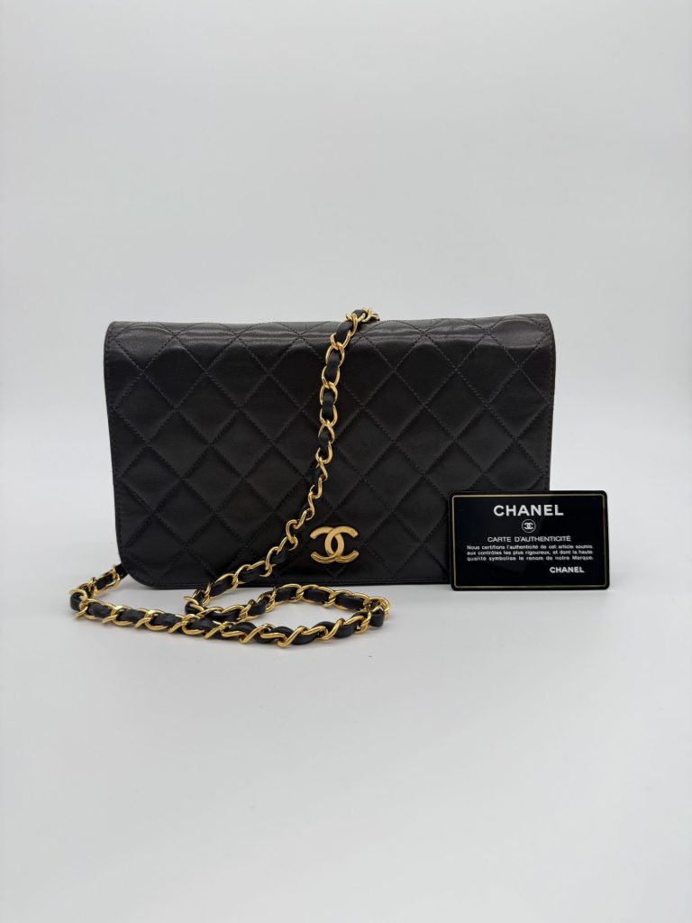 Deze medium Chanel flap bag is gemaakt van gewatteerd zwart lamsleer en heeft 24 karaat verguld hardware. Door de langere ketting is deze tas te dragen als een (korte) crossbody. De tas sluit met een push lock en heeft een bordeauxrode binnenzijde. De tas is gemaakt tussen 1996 en 1997 en voorzien van originele serienummer sticker.