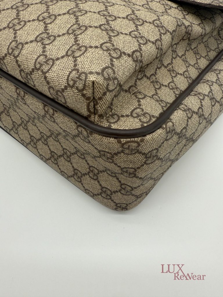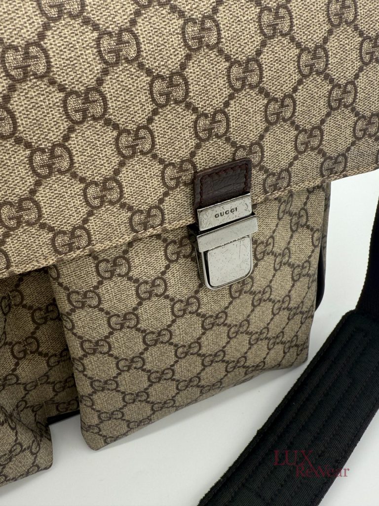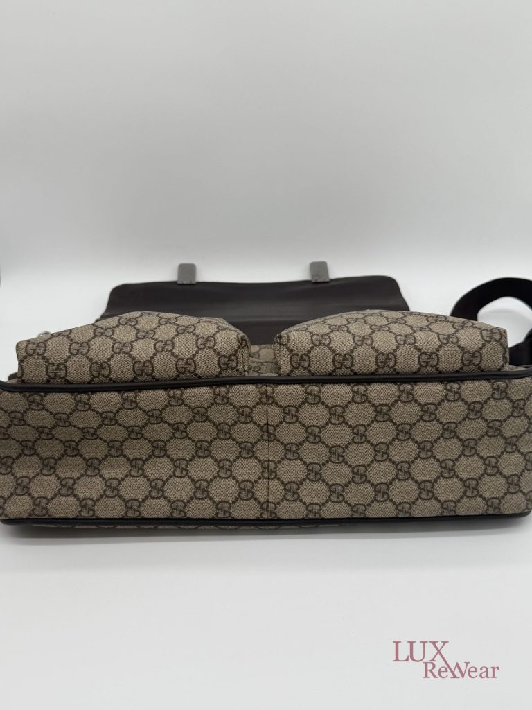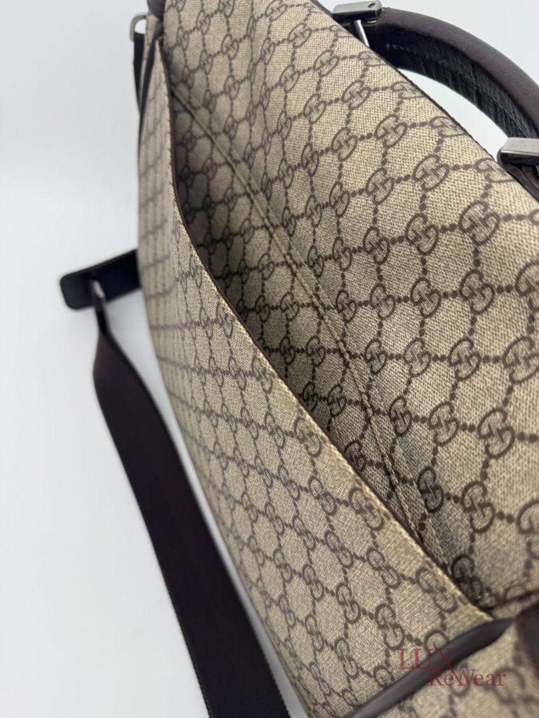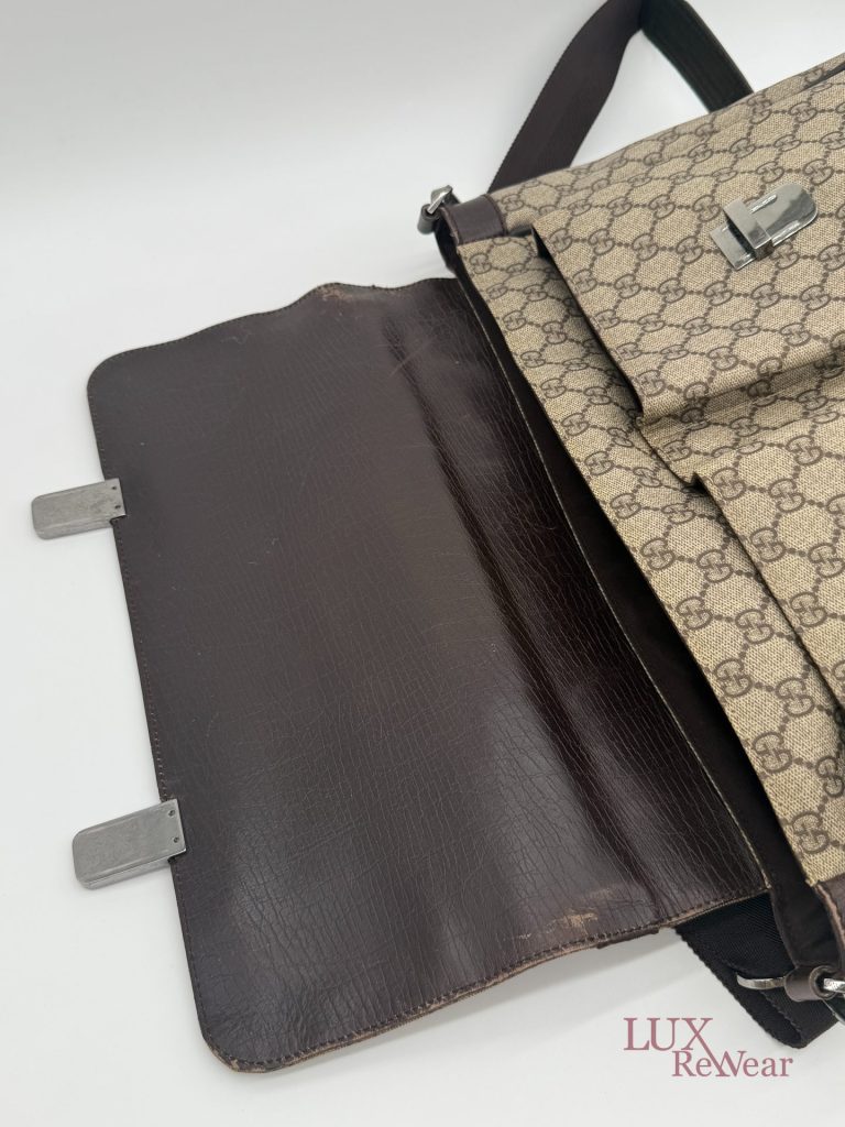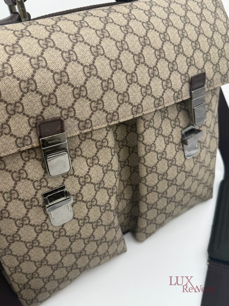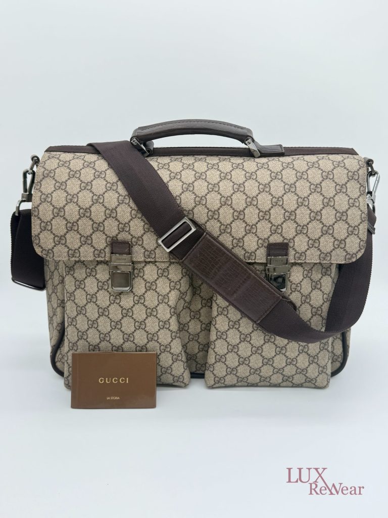 Deze Gucci aktetas/luiertas is vervaardigd uit GG-monogram canvas met bruine leren details. De tas kan zowel in de hand als crossbody worden gedragen dankzij de verstelbare schouderriem. Het interieur biedt meerdere binnenvakken en een ruime hoofdopbergruimte. Aan de voorzijde bevinden zich twee grote vakken met click-gespsluiting. Een praktische en veelzijdige tas voor dagelijks gebruik. De productcode is 147670212792 en deze tas is gemaakt in Italie.