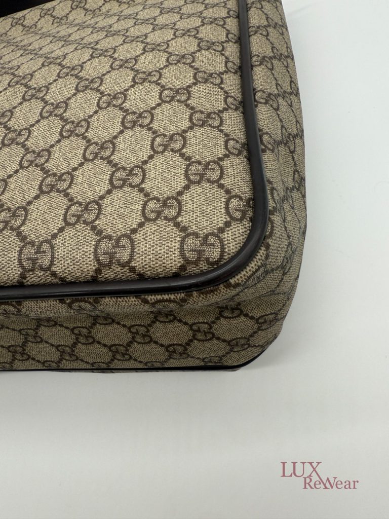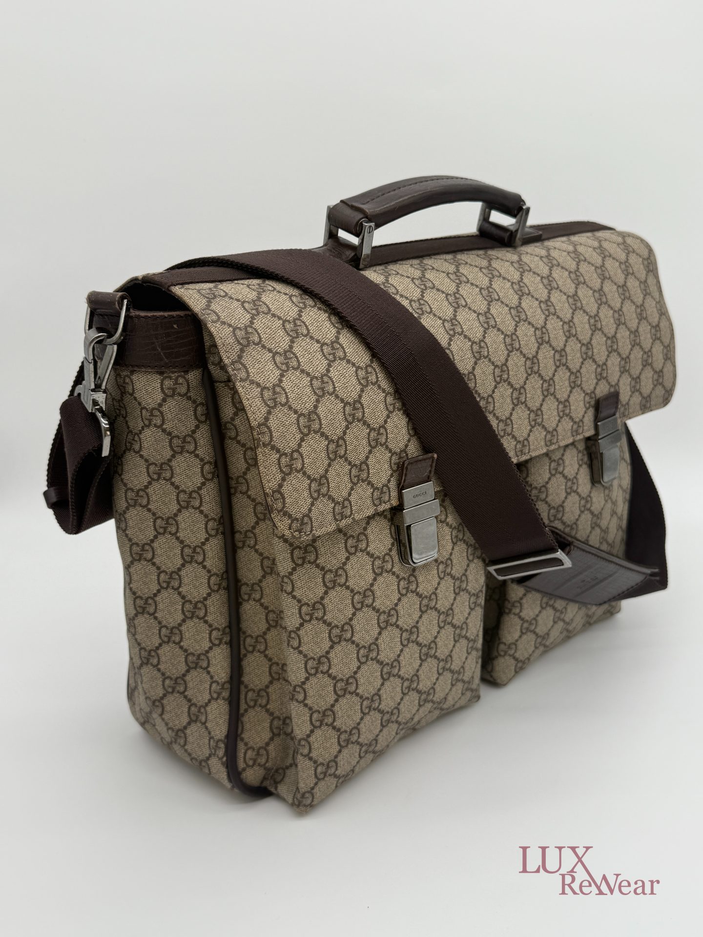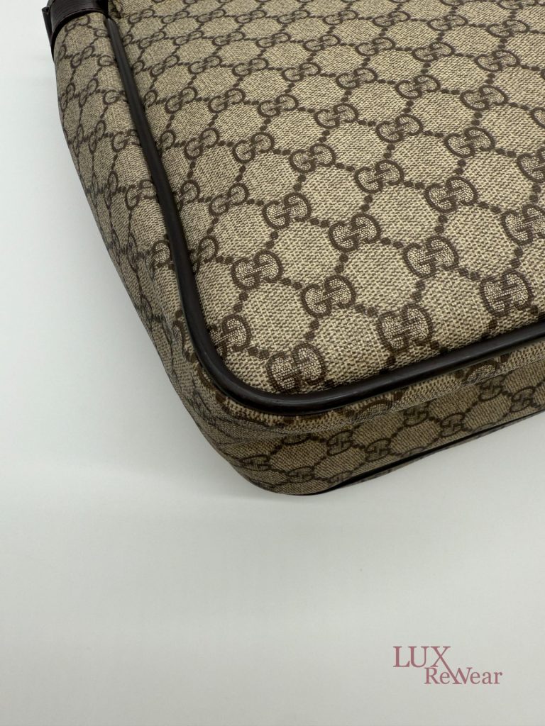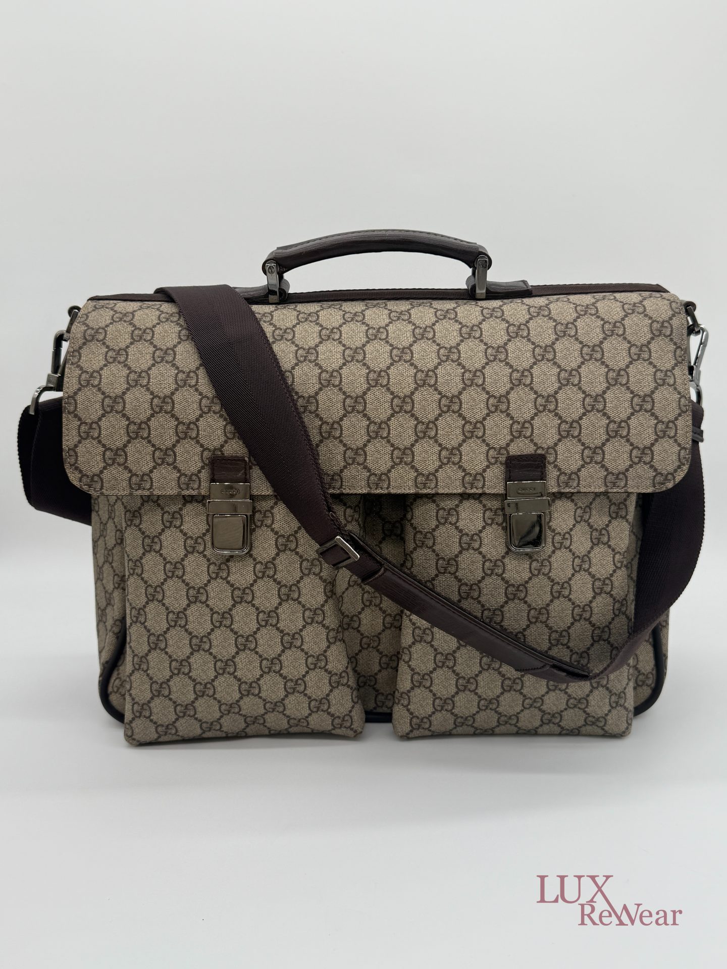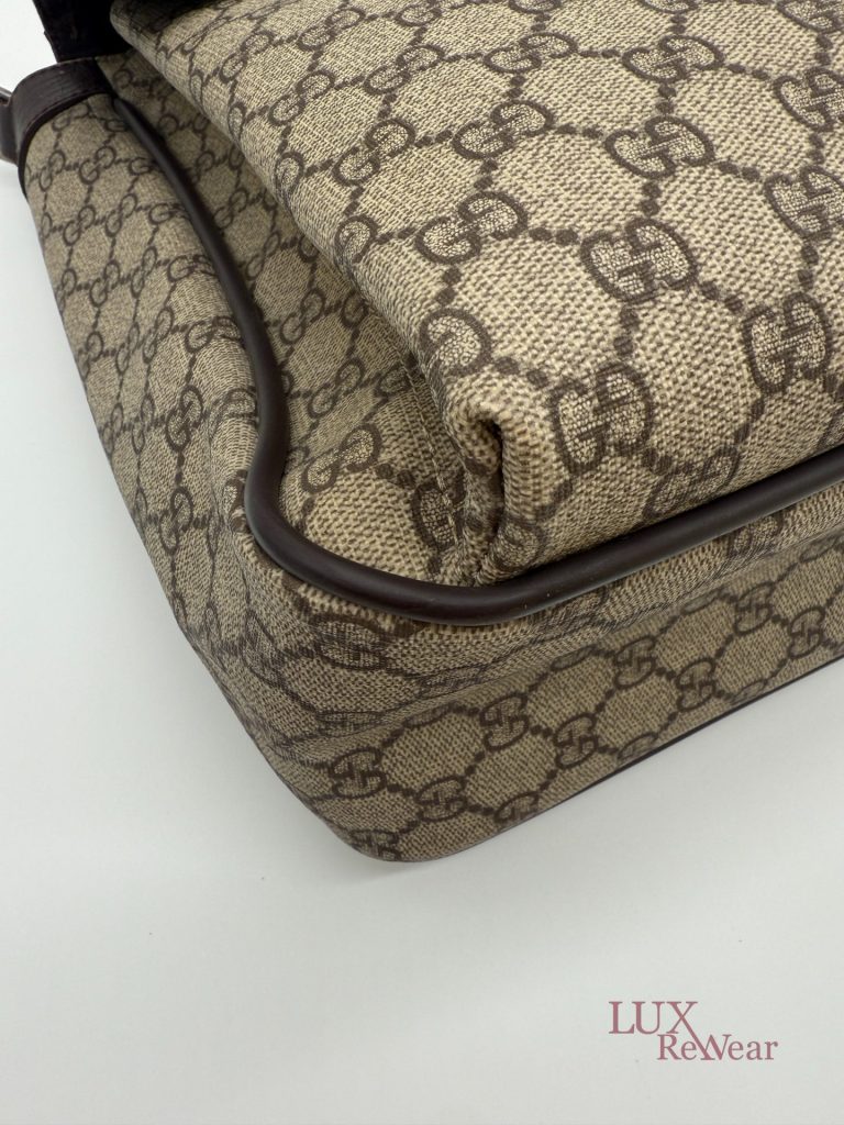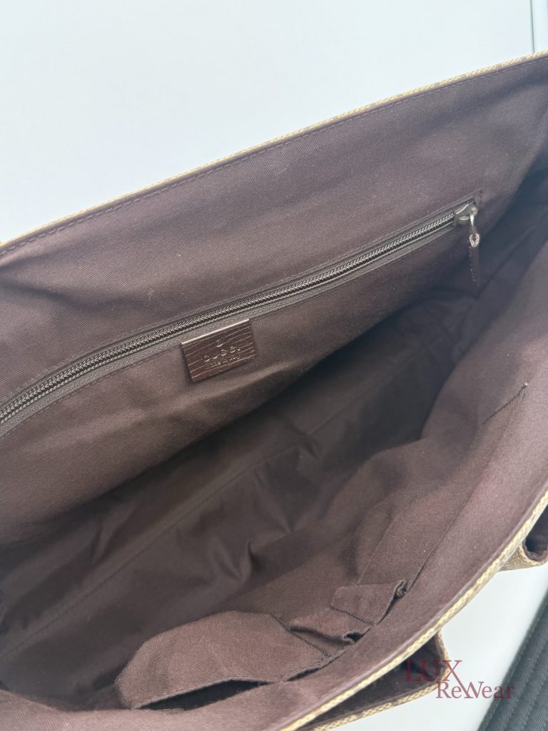 Deze Gucci aktetas/luiertas is vervaardigd uit GG-monogram canvas met bruine leren details. De tas kan zowel in de hand als crossbody worden gedragen dankzij de verstelbare schouderriem. Het interieur biedt meerdere binnenvakken en een ruime hoofdopbergruimte. Aan de voorzijde bevinden zich twee grote vakken met click-gespsluiting. Een praktische en veelzijdige tas voor dagelijks gebruik. De productcode is 147670212792 en deze tas is gemaakt in Italie.
