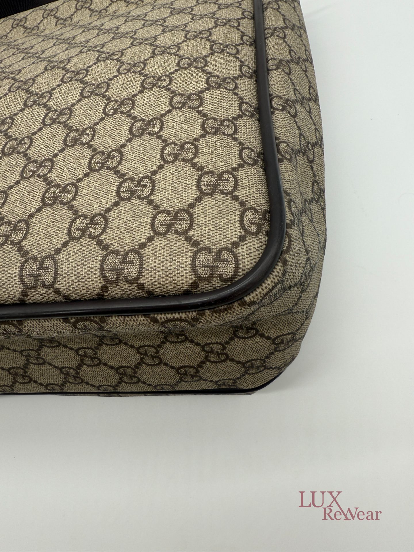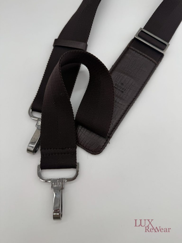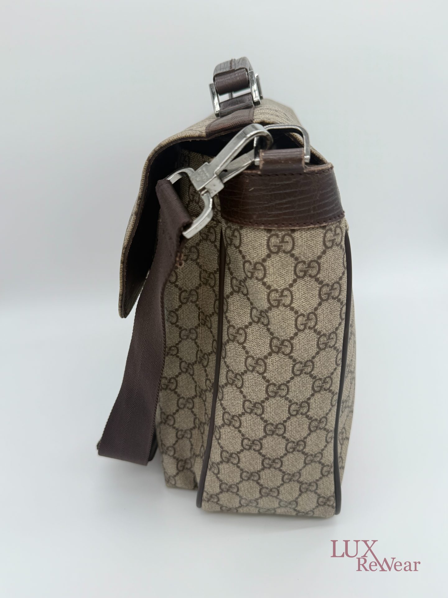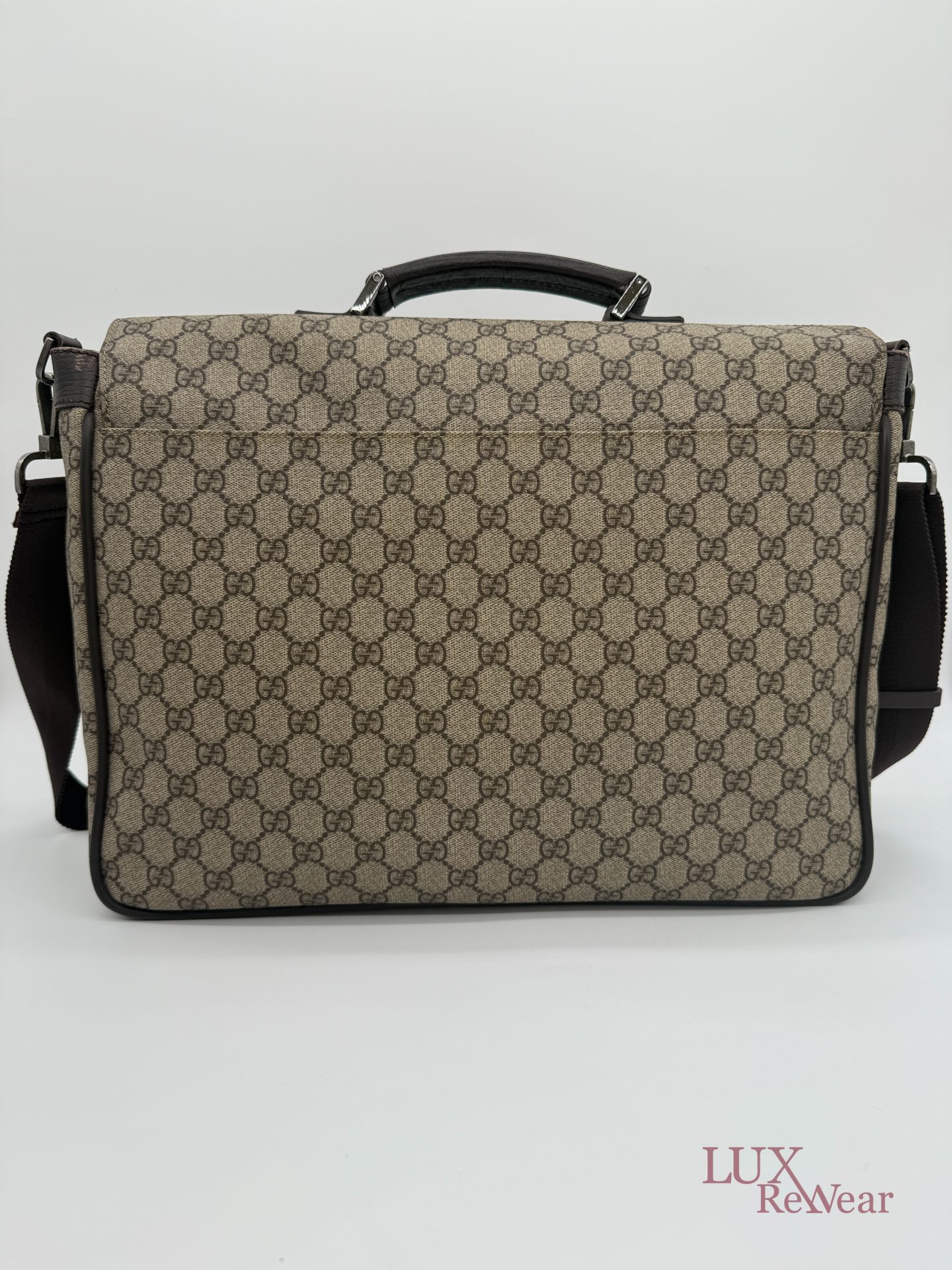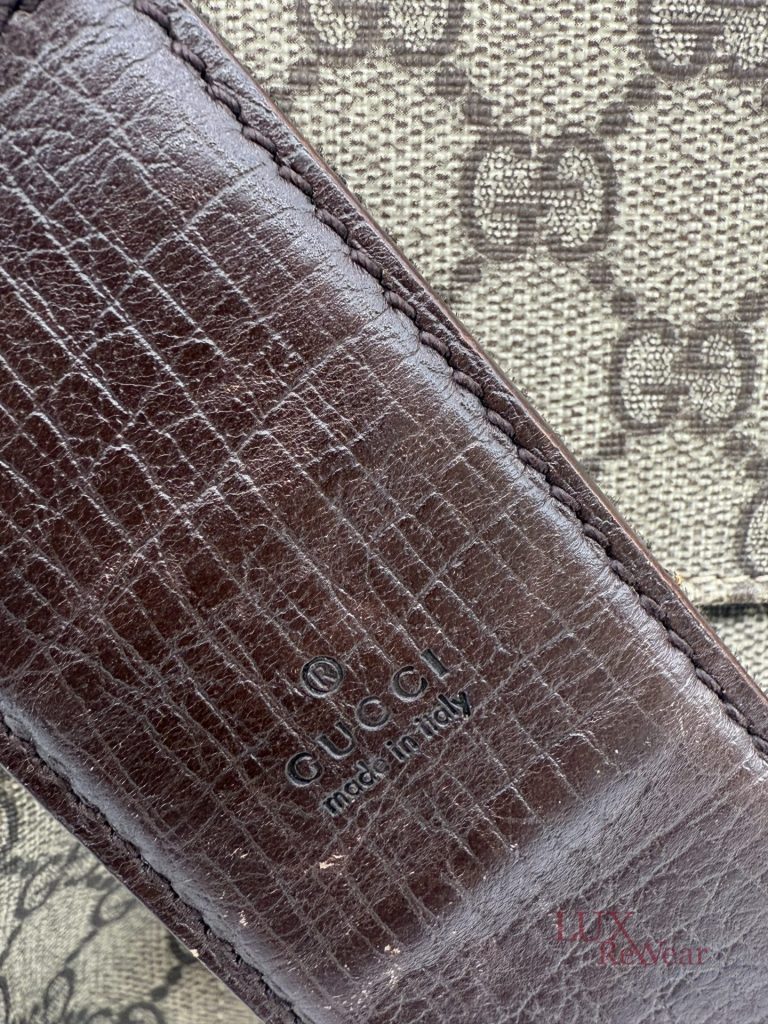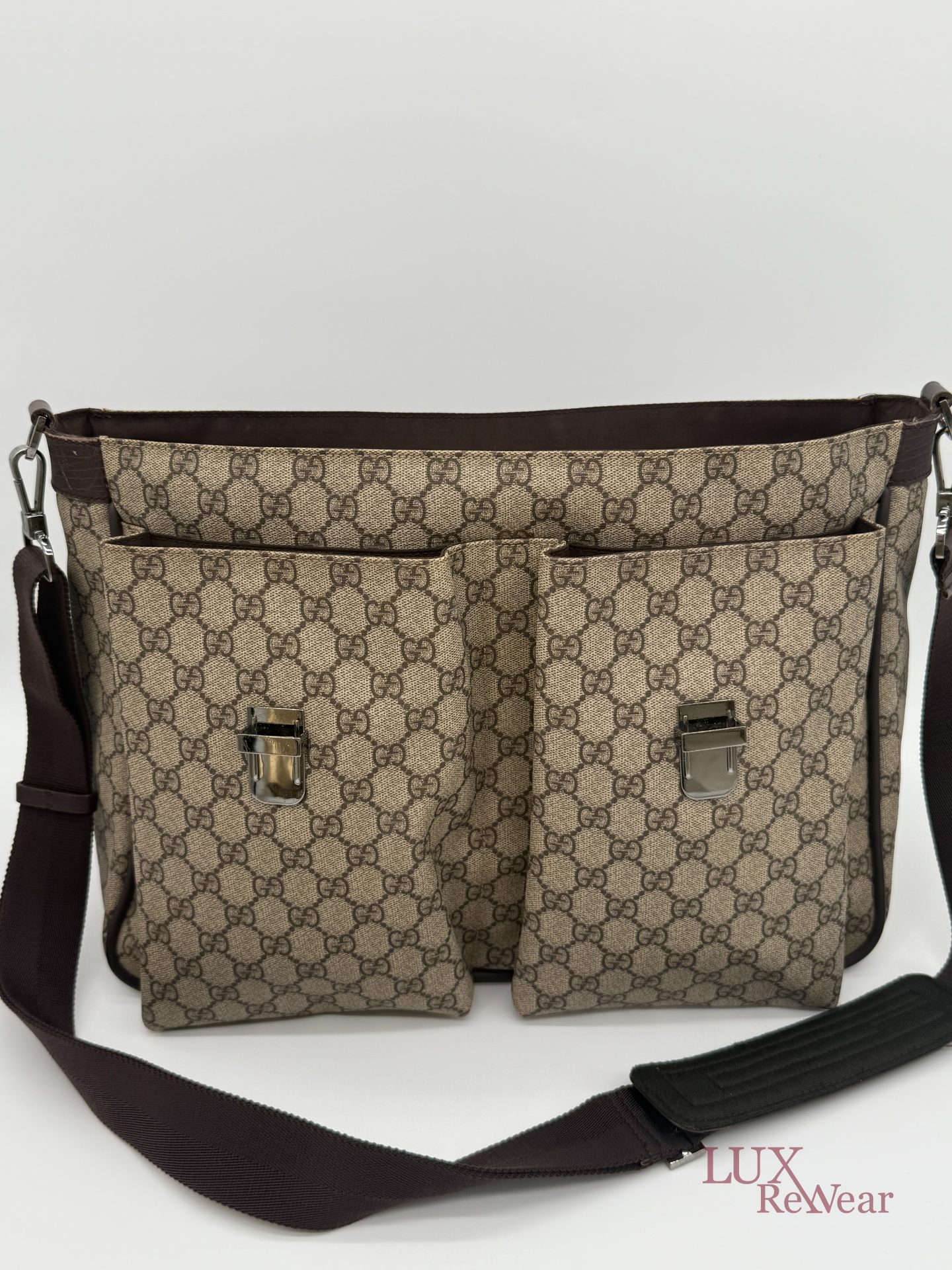 Deze Gucci aktetas/luiertas is vervaardigd uit GG-monogram canvas met bruine leren details. De tas kan zowel in de hand als crossbody worden gedragen dankzij de verstelbare schouderriem. Het interieur biedt meerdere binnenvakken en een ruime hoofdopbergruimte. Aan de voorzijde bevinden zich twee grote vakken met click-gespsluiting. Een praktische en veelzijdige tas voor dagelijks gebruik. De productcode is 147670212792 en deze tas is gemaakt in Italie.