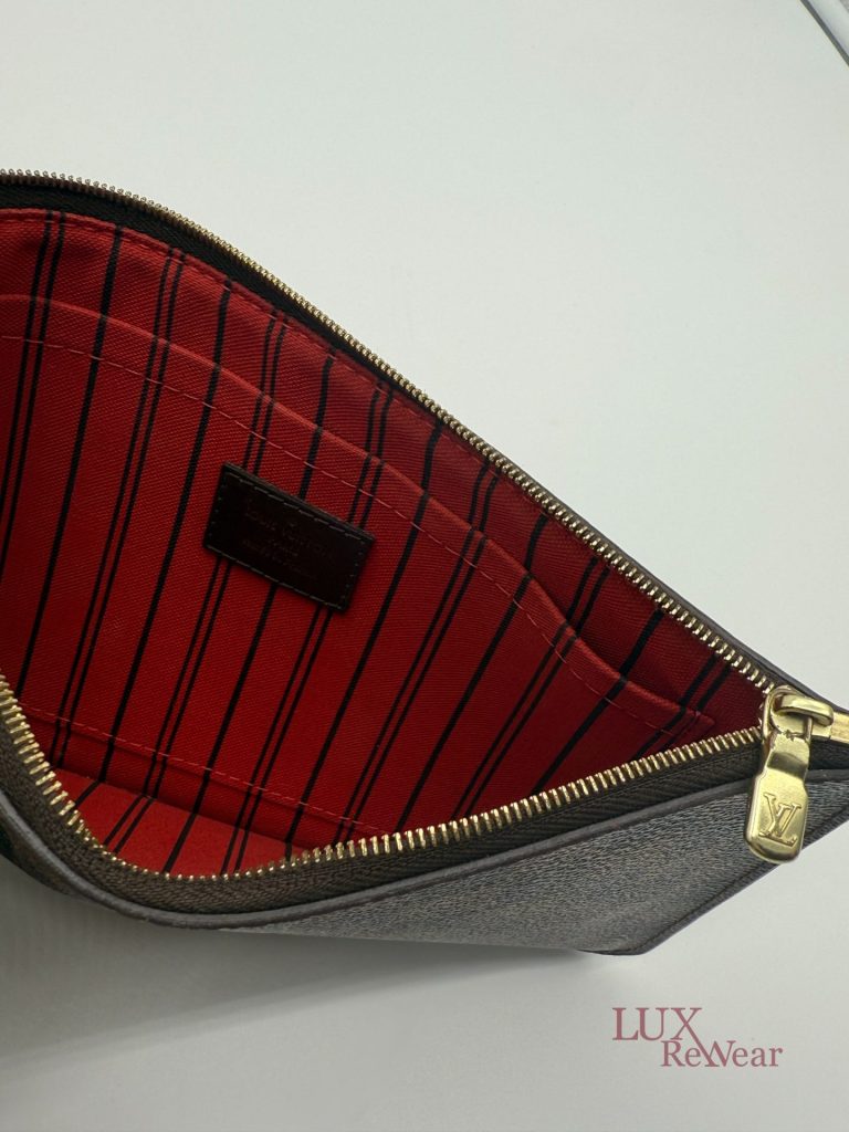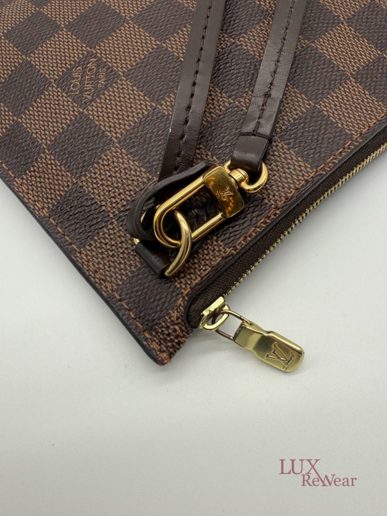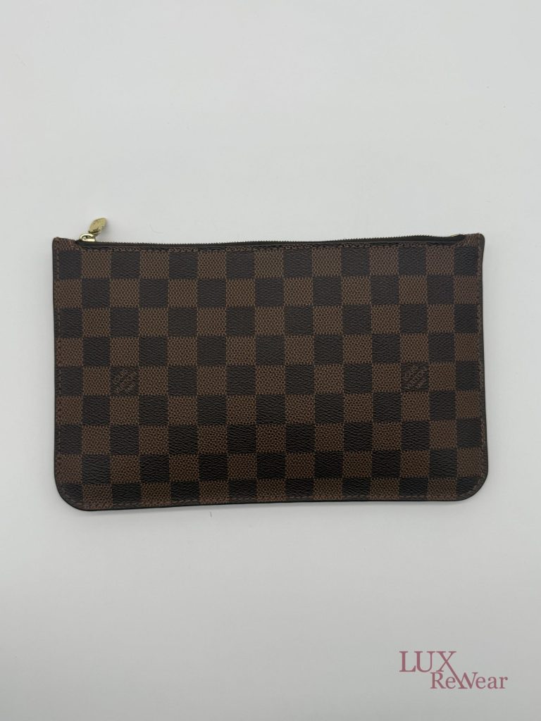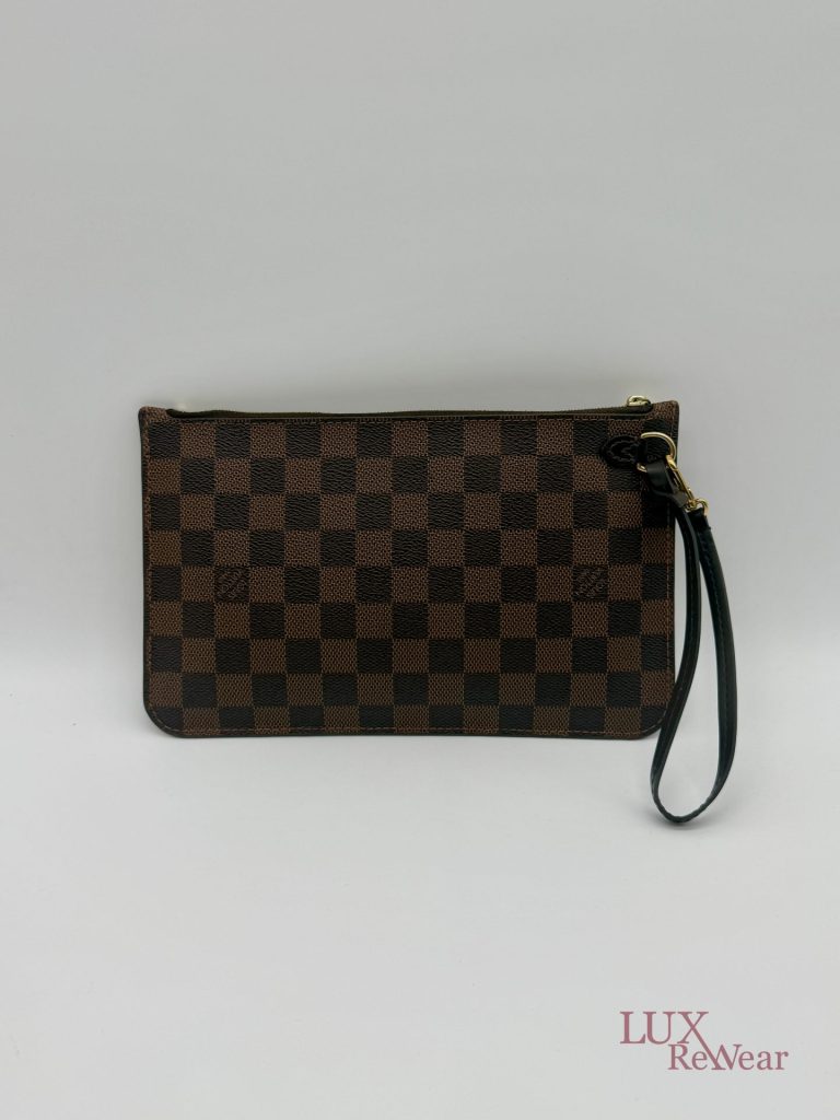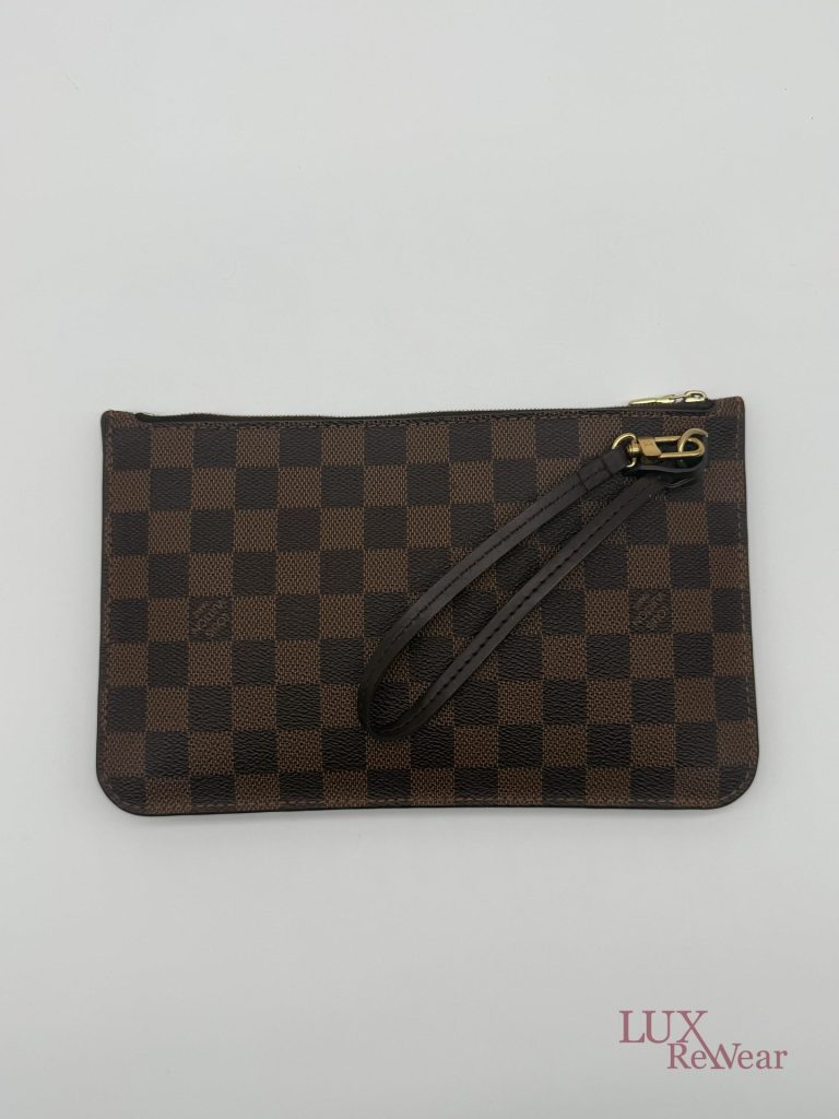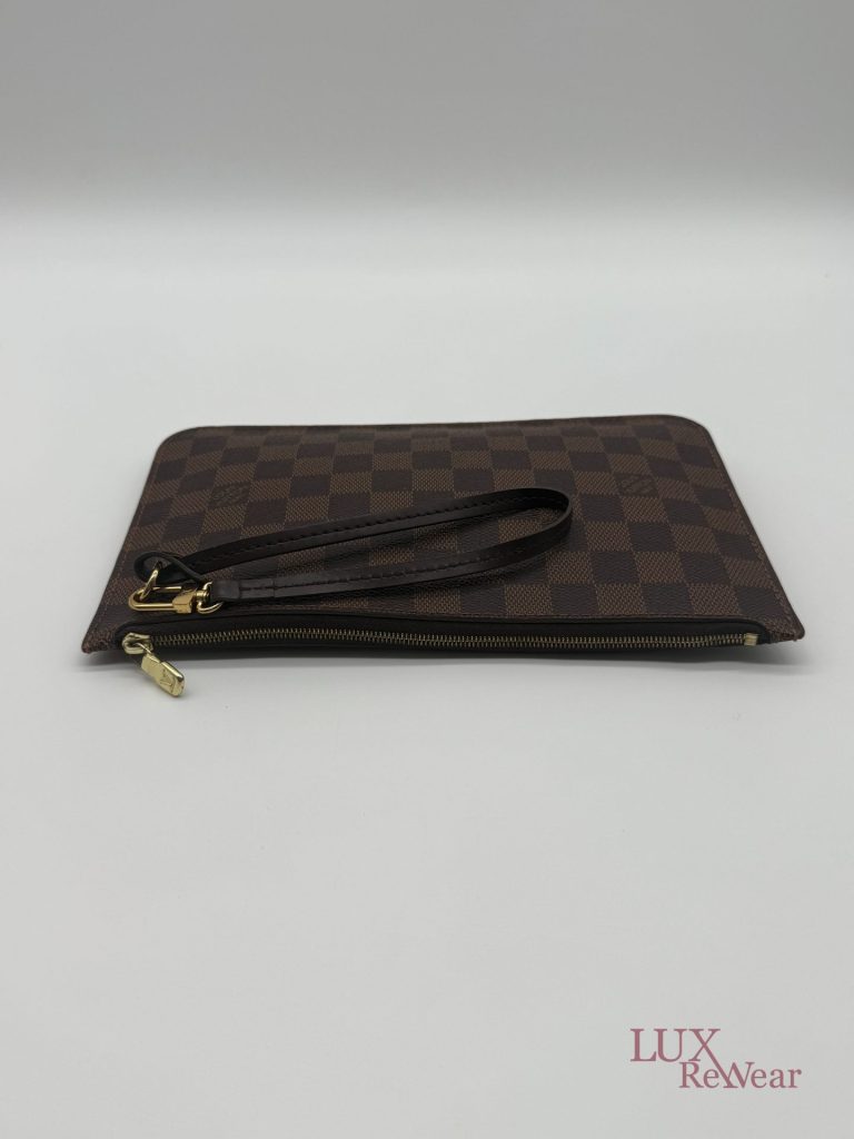 De Louis Vuitton Damier Ebene Neverfull Pouch is een compacte en stijlvolle pochette, gemaakt van het iconische damier ebene canvas met leren details. Dankzij de praktische ritssluiting, het kleine interieurvak en de afneembare polsriem is deze pouch zowel functioneel als elegant. Ideaal om als losse clutch te dragen of als organiser in een grotere tas, en een tijdloze aanvulling op iedere garderobe. De datumcode van dit item is SF0186, deze clutch is geproduceerd in februari 2016 in Frankrijk.