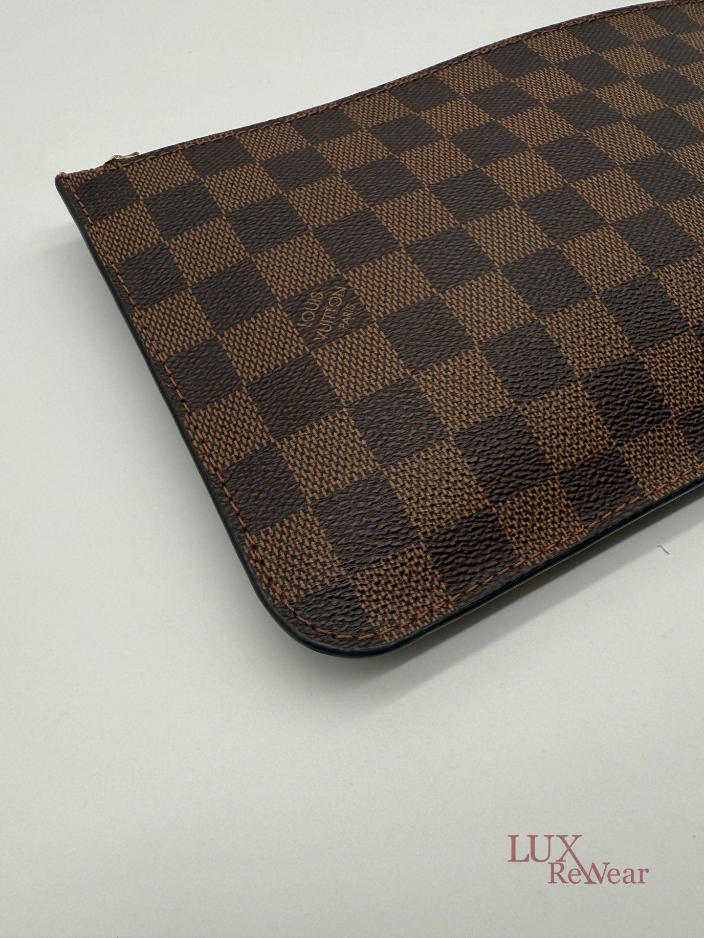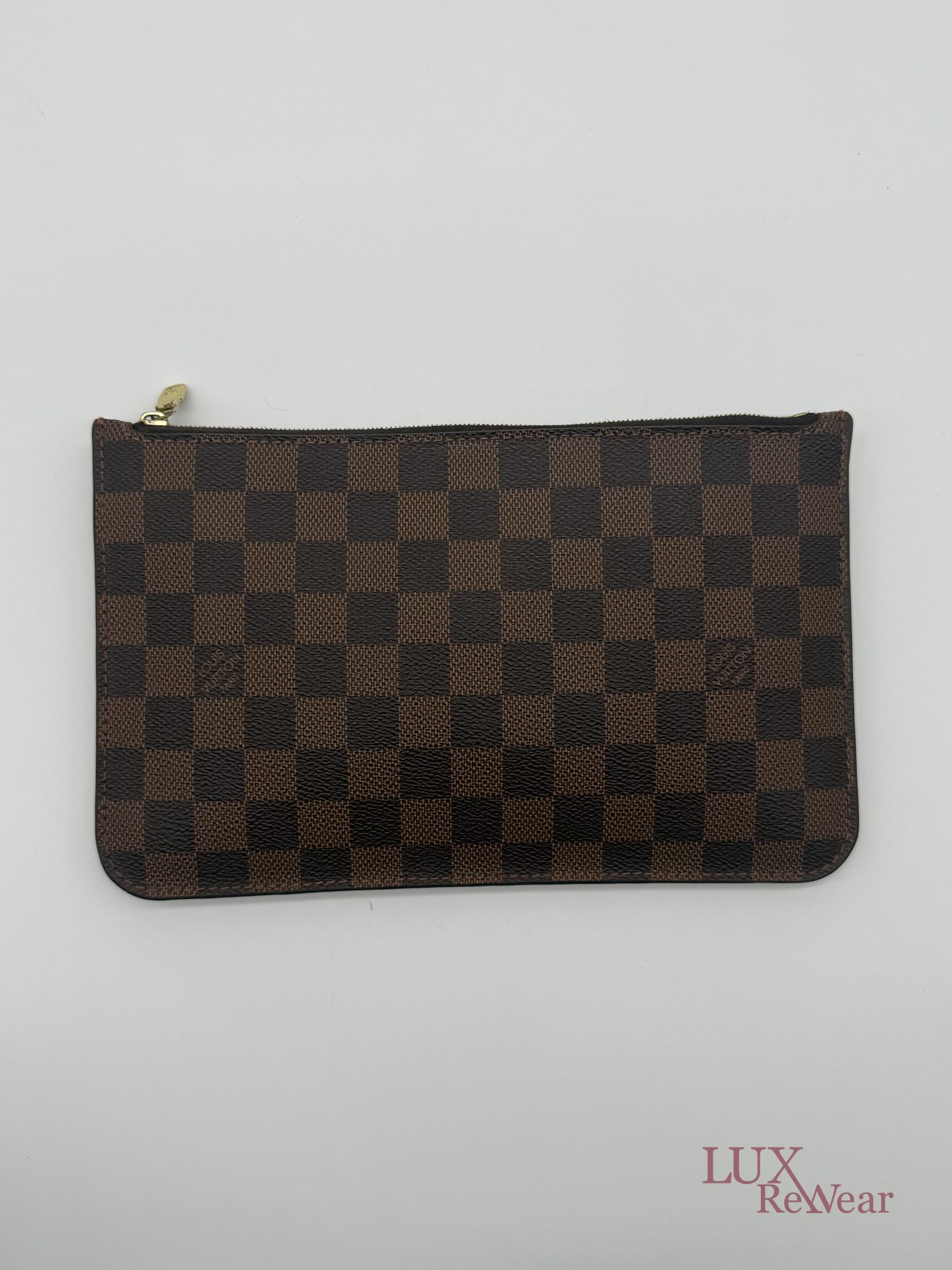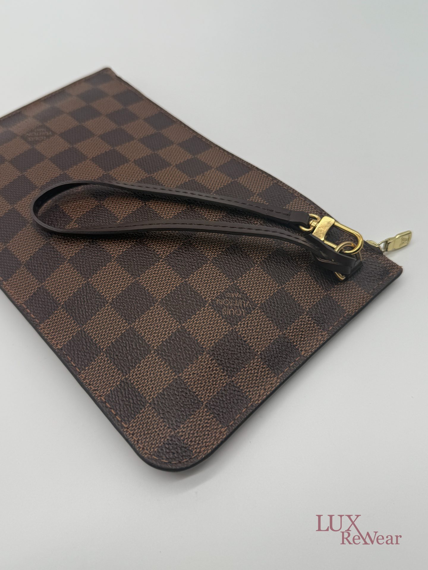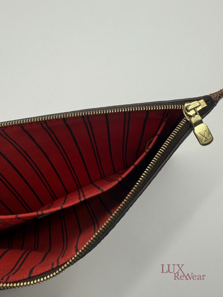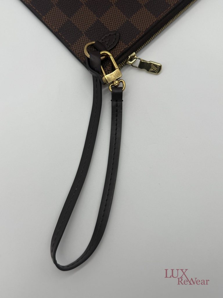 De Louis Vuitton Damier Ebene Neverfull Pouch is een compacte en stijlvolle pochette, gemaakt van het iconische damier ebene canvas met leren details. Dankzij de praktische ritssluiting, het kleine interieurvak en de afneembare polsriem is deze pouch zowel functioneel als elegant. Ideaal om als losse clutch te dragen of als organiser in een grotere tas, en een tijdloze aanvulling op iedere garderobe. De datumcode van dit item is SF0186, deze clutch is geproduceerd in februari 2016 in Frankrijk.