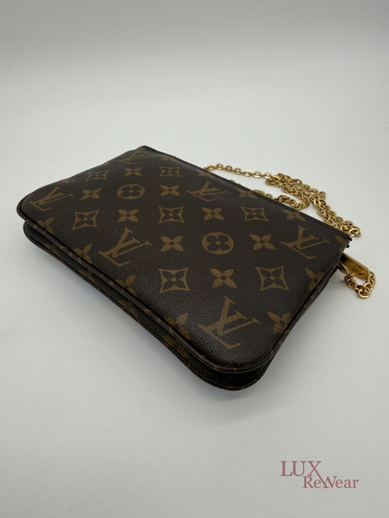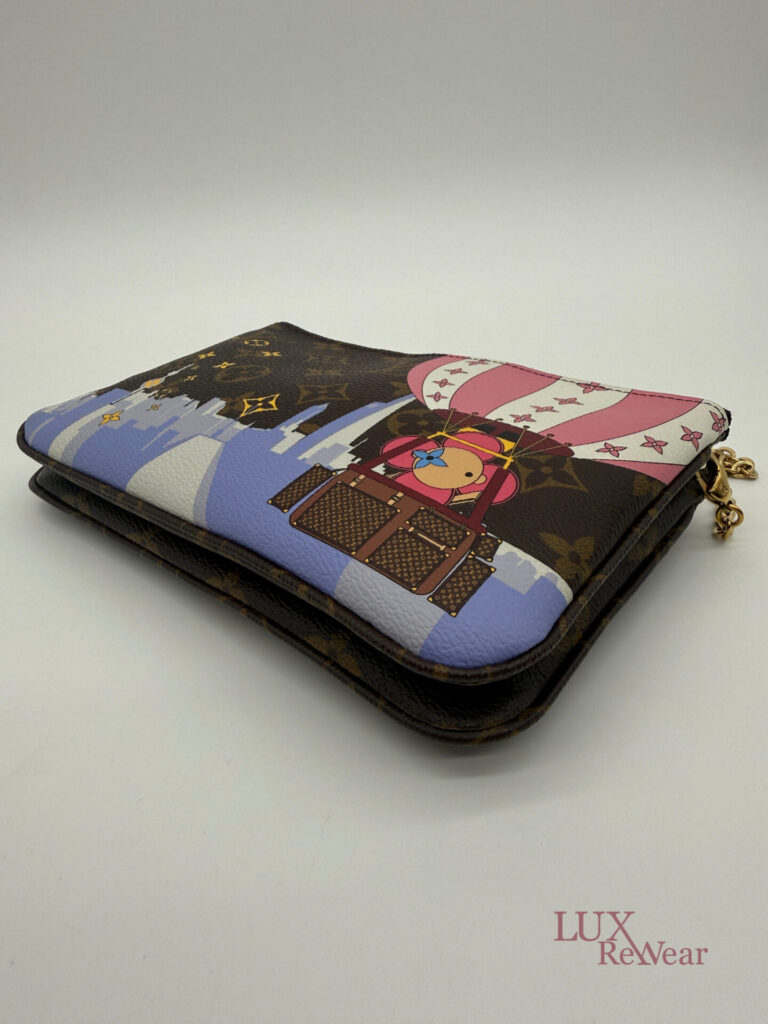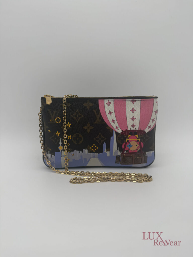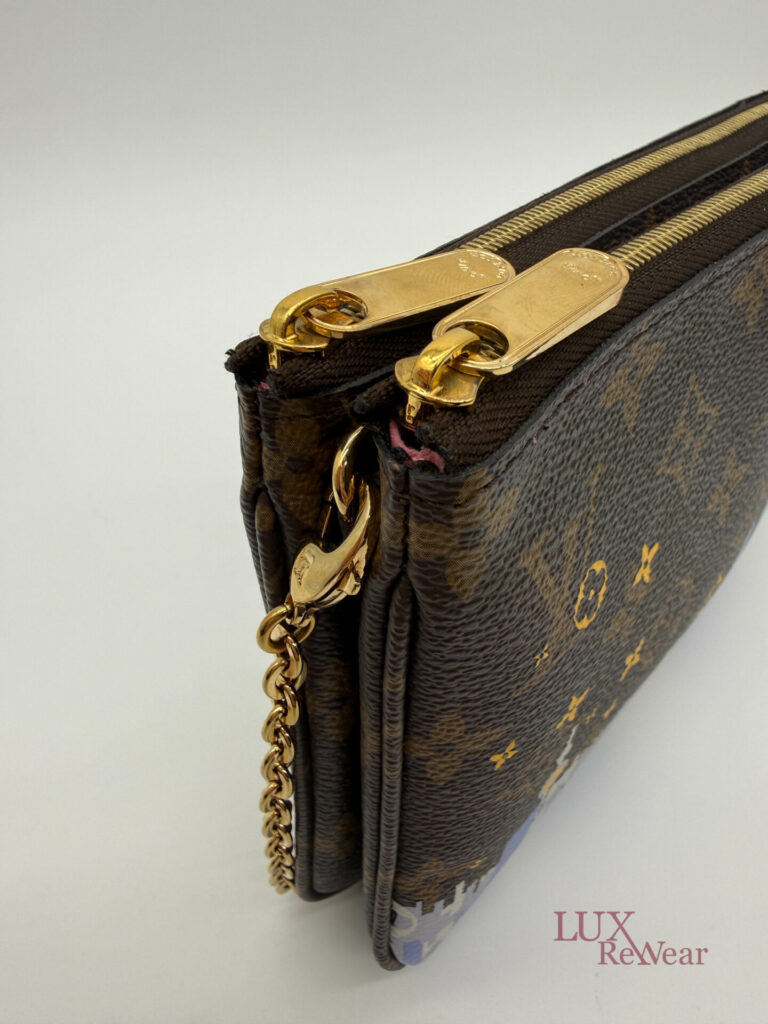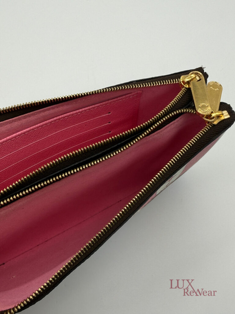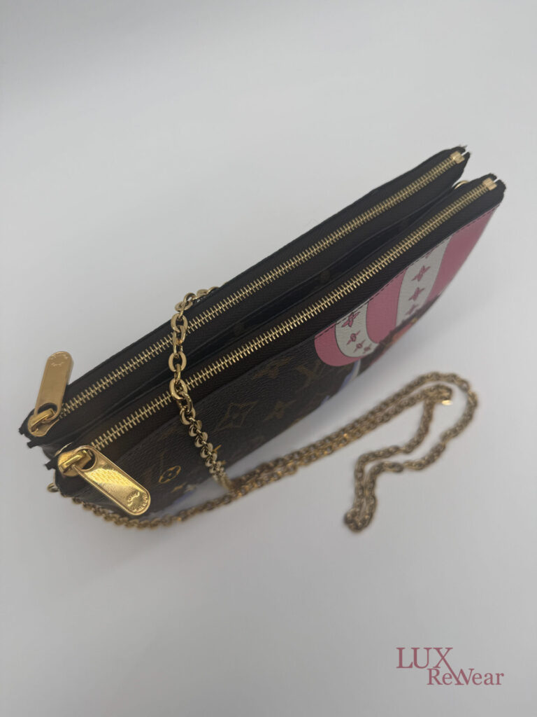 Deze pre-loved Louis Vuitton Double Zip Pochette in Monogram canvas is onderdeel van de speciale Vivienne Shanghai kersteditie 2019. De tas heeft gouden hardware en een afneembare, lange goudkleurige ketting, waardoor hij zowel als clutch als crossbody gedragen kan worden. De binnenzijde is uitgevoerd in felroze stof en de tas beschikt over twee ruime compartimenten voor al je essentials. De datumcode van dit item is MI2159 (geproduceerd in Frankrijk in juni 2019).