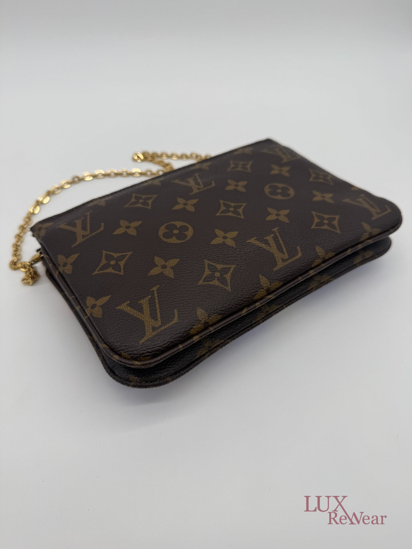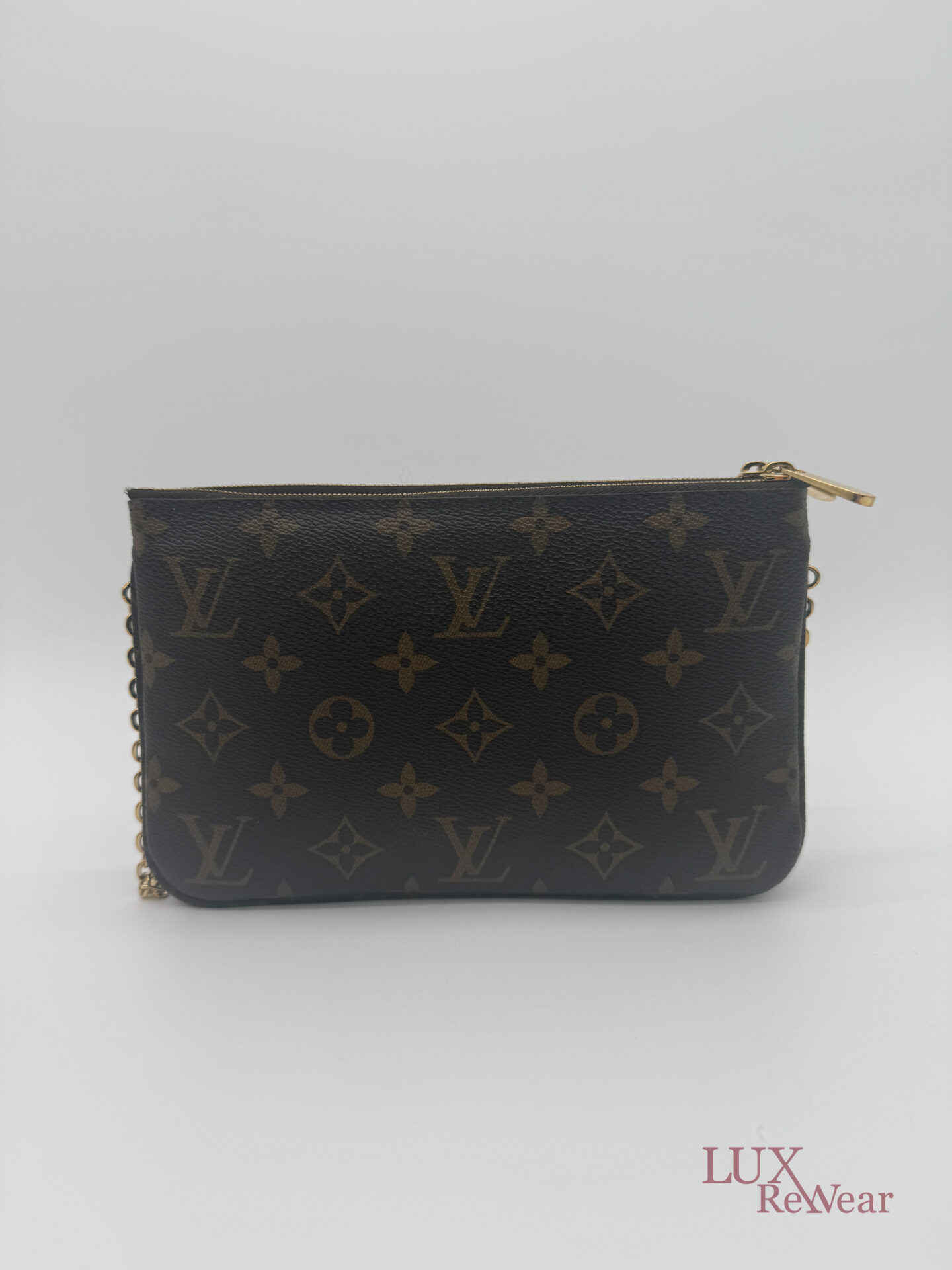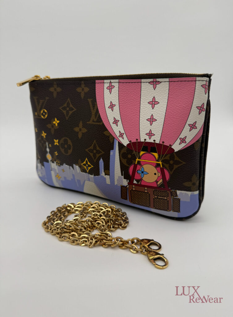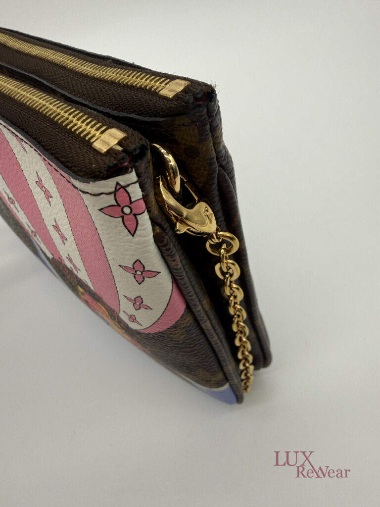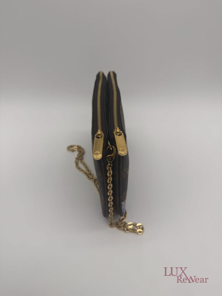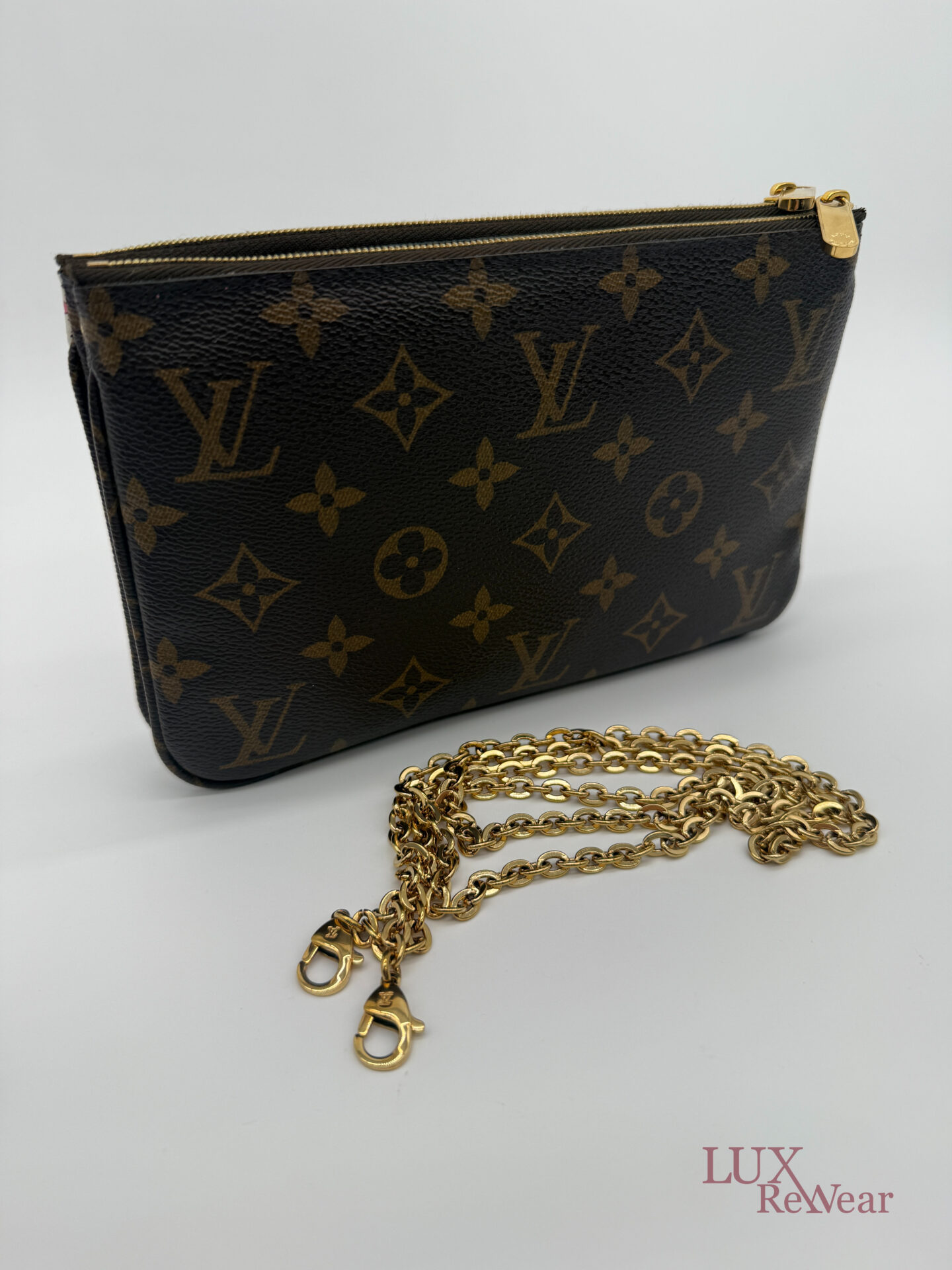 Deze pre-loved Louis Vuitton Double Zip Pochette in Monogram canvas is onderdeel van de speciale Vivienne Shanghai kersteditie 2019. De tas heeft gouden hardware en een afneembare, lange goudkleurige ketting, waardoor hij zowel als clutch als crossbody gedragen kan worden. De binnenzijde is uitgevoerd in felroze stof en de tas beschikt over twee ruime compartimenten voor al je essentials. De datumcode van dit item is MI2159 (geproduceerd in Frankrijk in juni 2019).