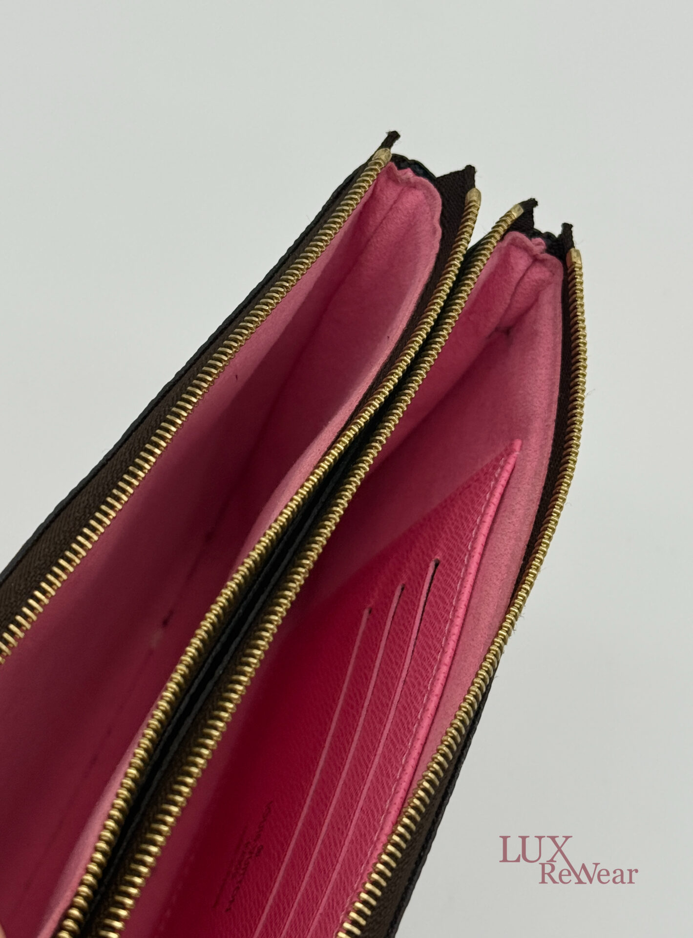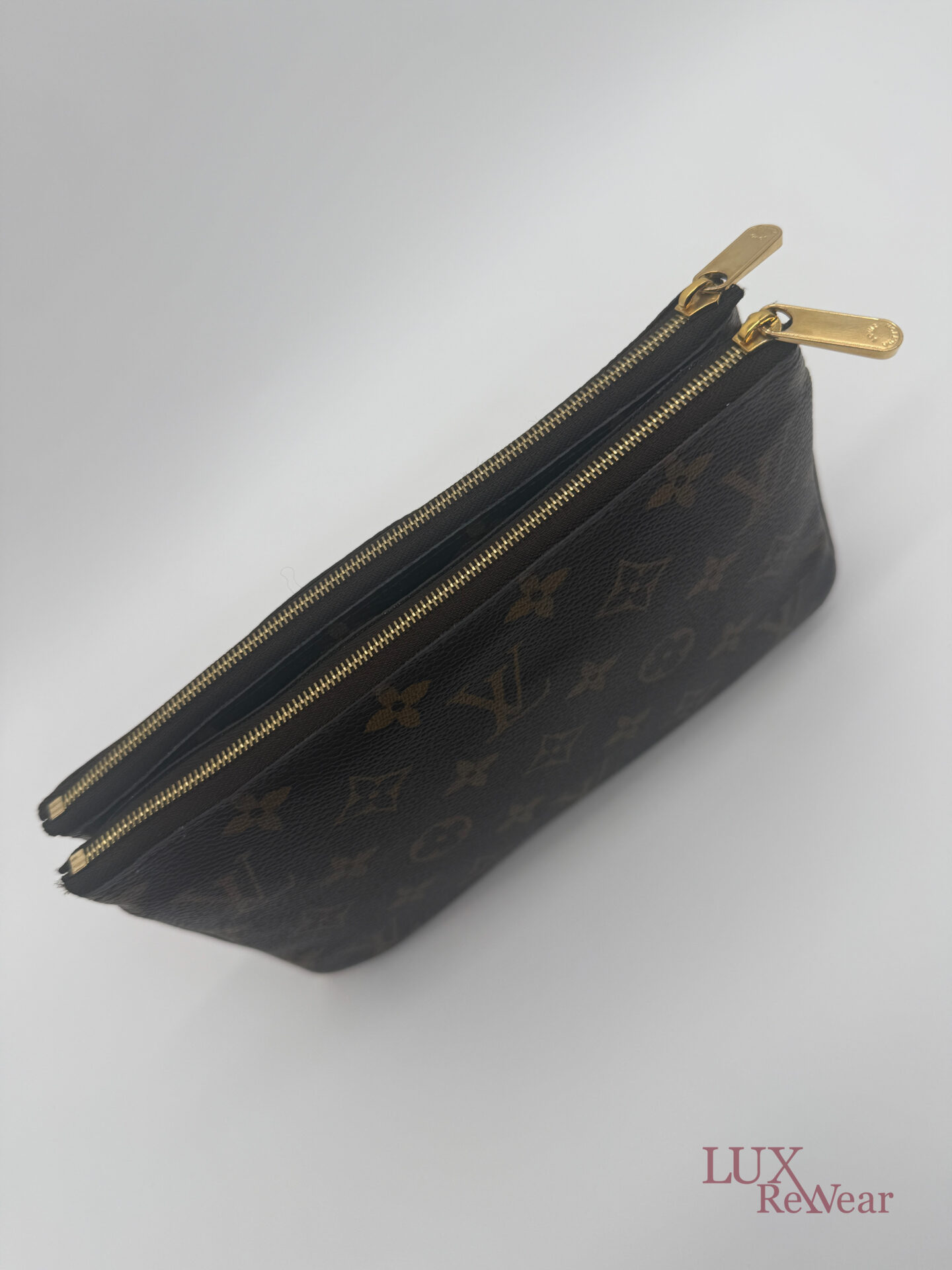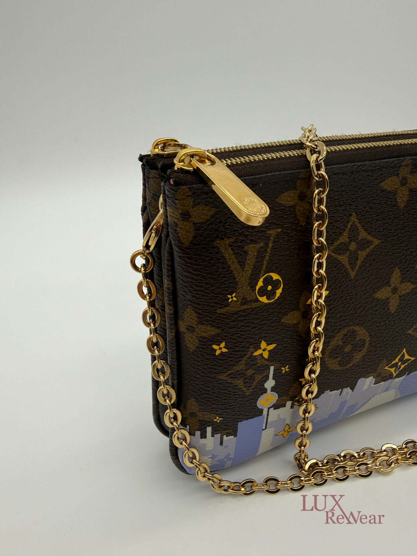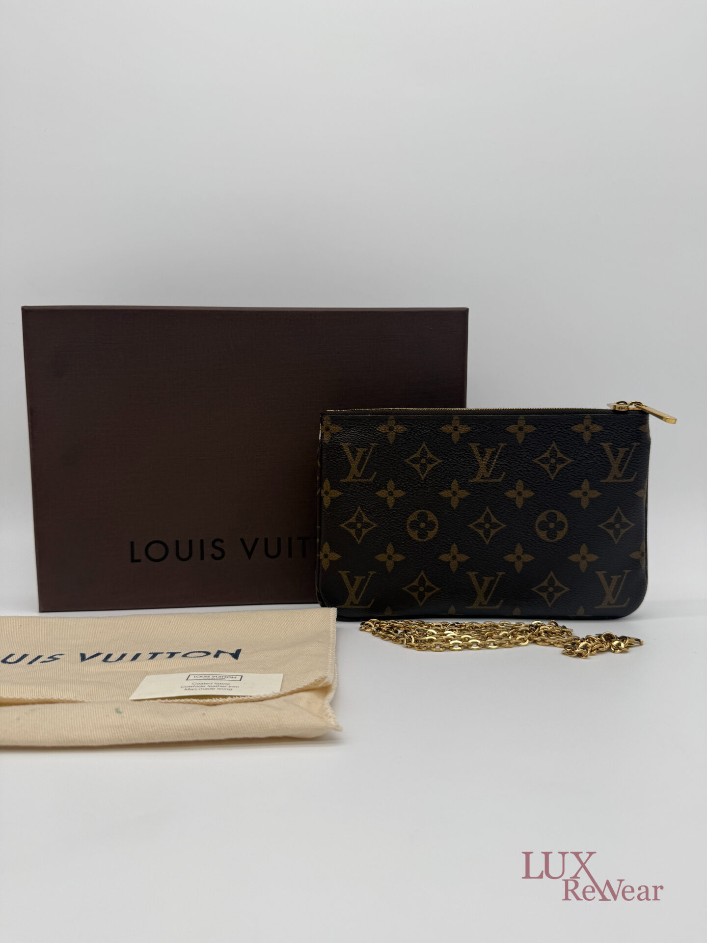 Deze pre-loved Louis Vuitton Double Zip Pochette in Monogram canvas is onderdeel van de speciale Vivienne Shanghai kersteditie 2019. De tas heeft gouden hardware en een afneembare, lange goudkleurige ketting, waardoor hij zowel als clutch als crossbody gedragen kan worden. De binnenzijde is uitgevoerd in felroze stof en de tas beschikt over twee ruime compartimenten voor al je essentials. De datumcode van dit item is MI2159 (geproduceerd in Frankrijk in juni 2019).