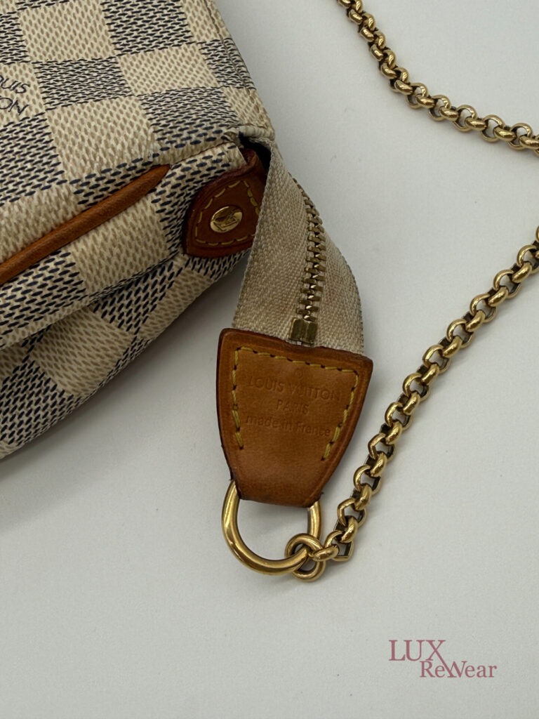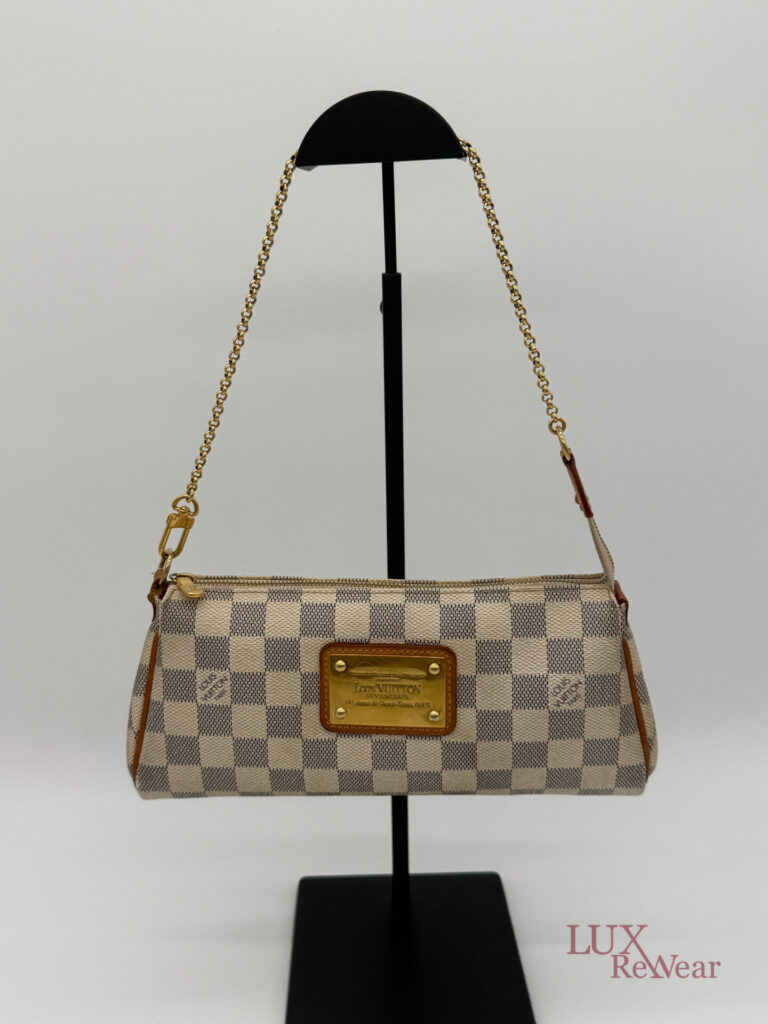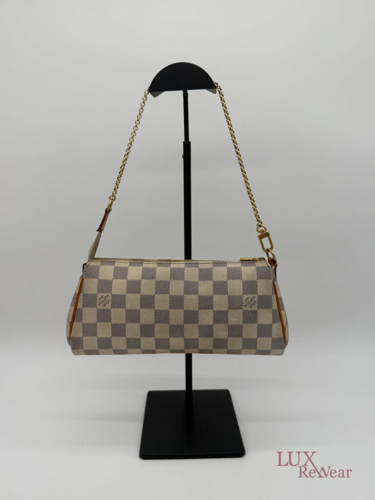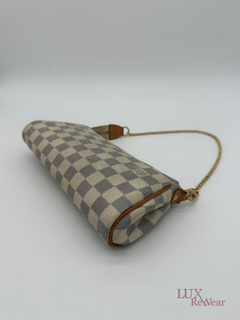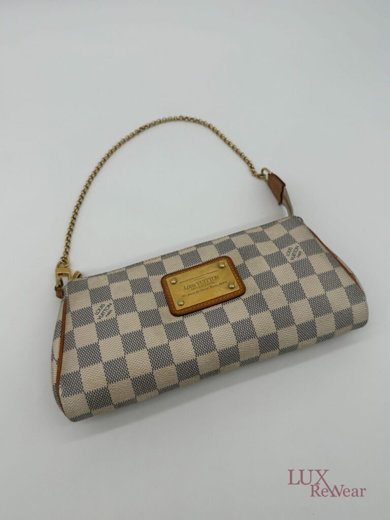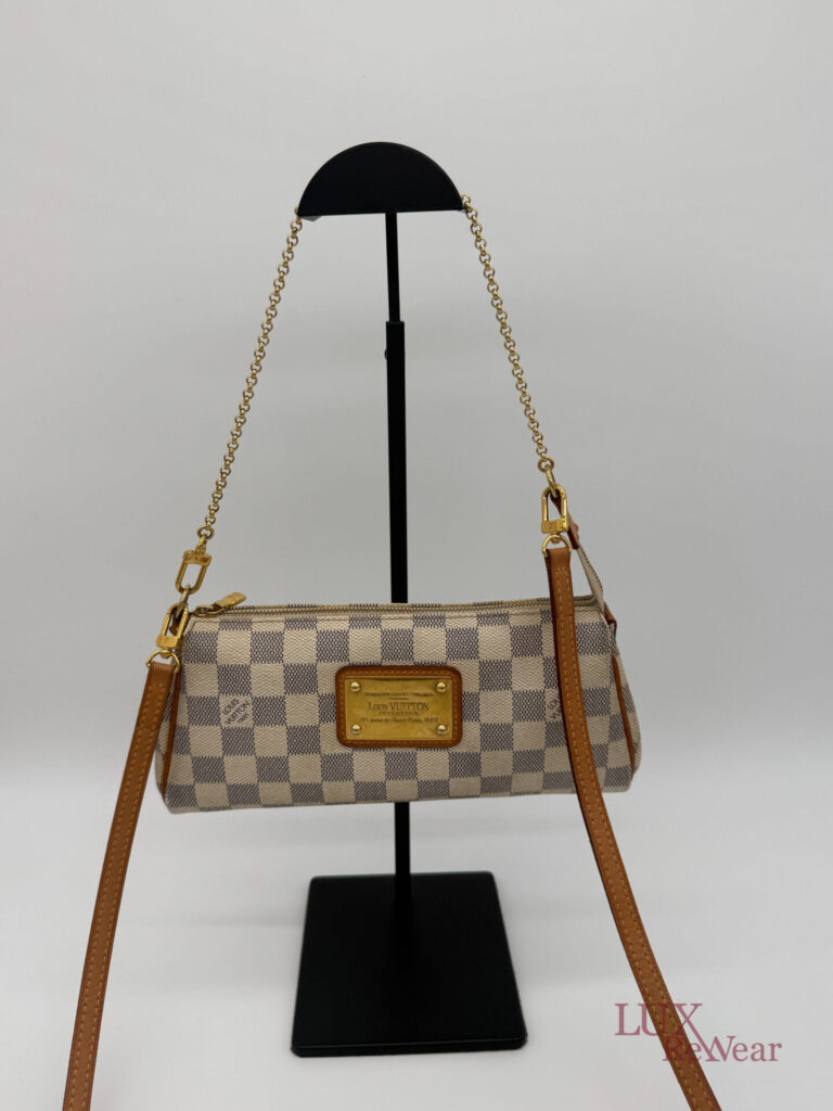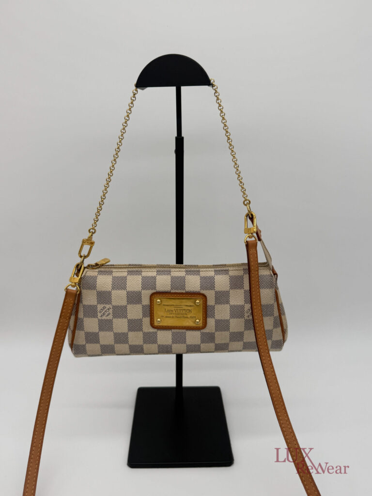 Deze pre-loved Louis Vuitton Eva Clutch is uitgevoerd in het iconische Damier Azur canvas en afgewerkt met goudkleurige hardware. De tas heeft een handige polsriem en wordt geleverd met lange strap, waardoor hij perfect is als dagelijkse crossbody tas, elegante handtas of clutch voor dagelijks gebruik en speciale gelegenheden. De datumcode van dit item is SN0154 (geproduceerd in Frankrijk in februari 2014).