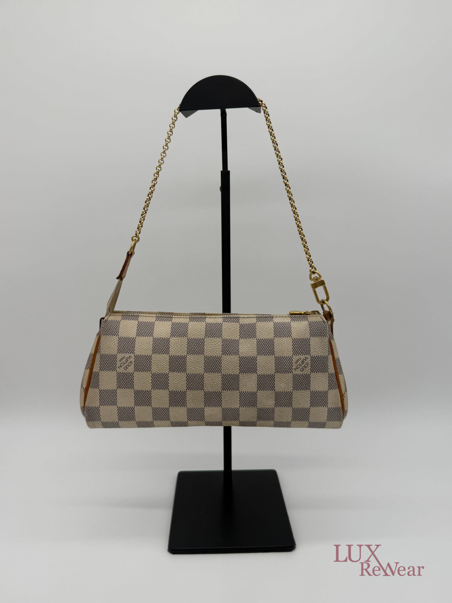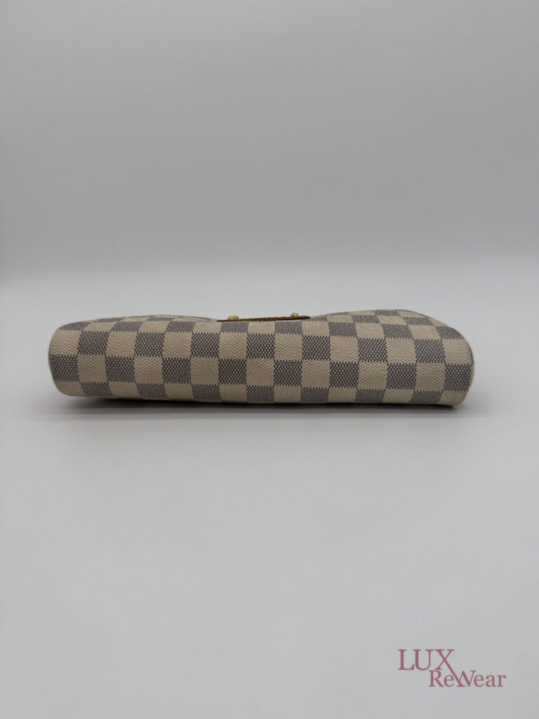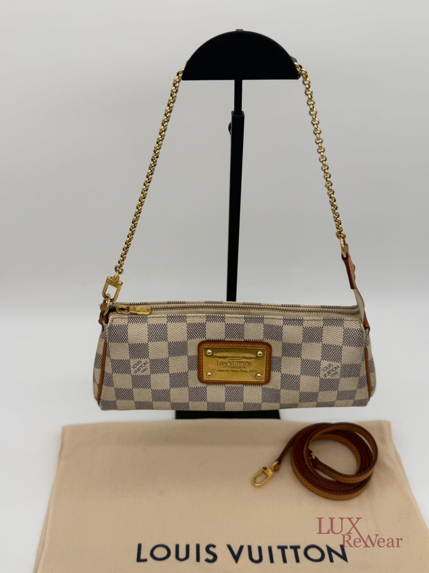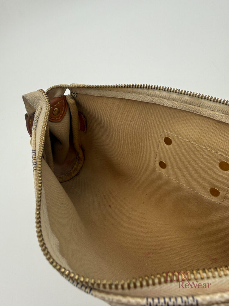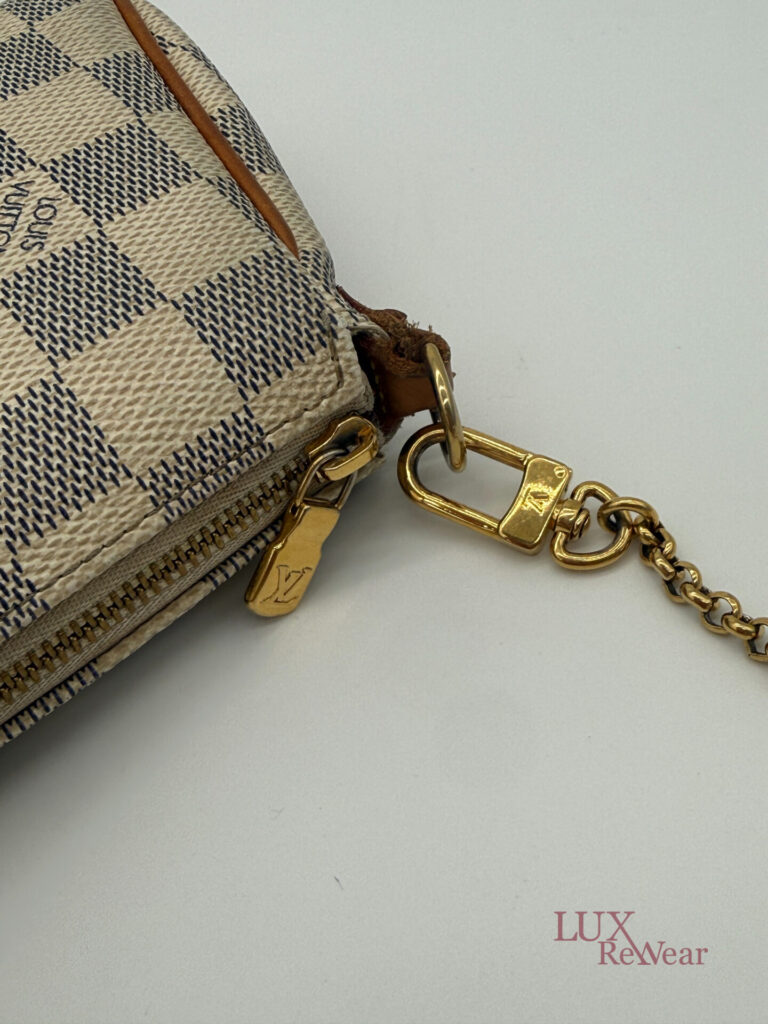 Deze pre-loved Louis Vuitton Eva Clutch is uitgevoerd in het iconische Damier Azur canvas en afgewerkt met goudkleurige hardware. De tas heeft een handige polsriem en wordt geleverd met lange strap, waardoor hij perfect is als dagelijkse crossbody tas, elegante handtas of clutch voor dagelijks gebruik en speciale gelegenheden. De datumcode van dit item is SN0154 (geproduceerd in Frankrijk in februari 2014).