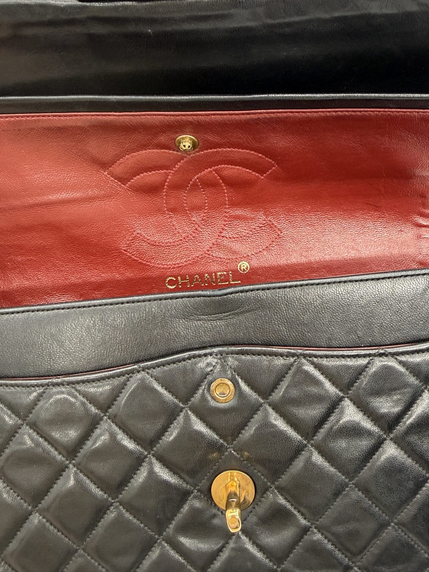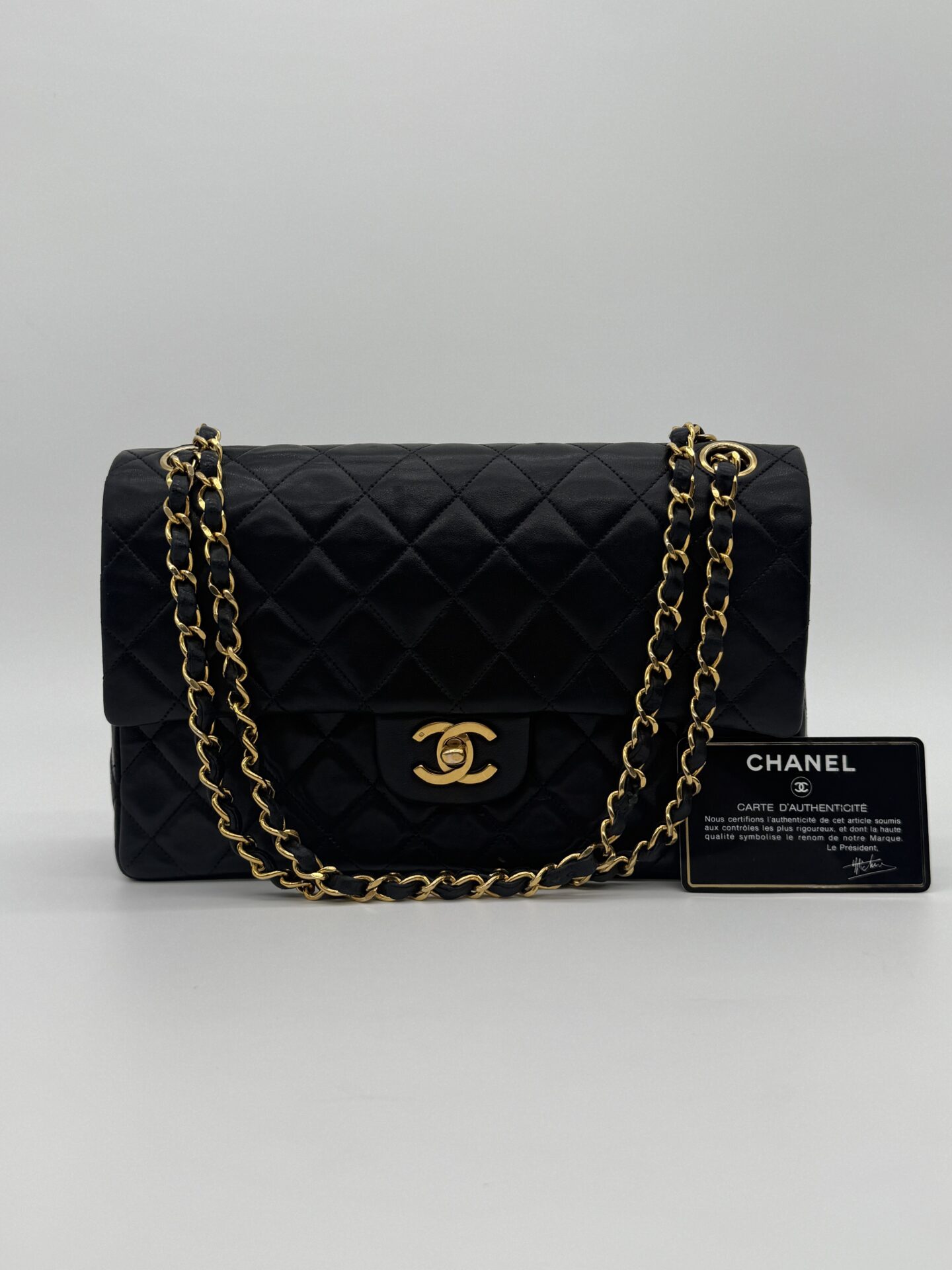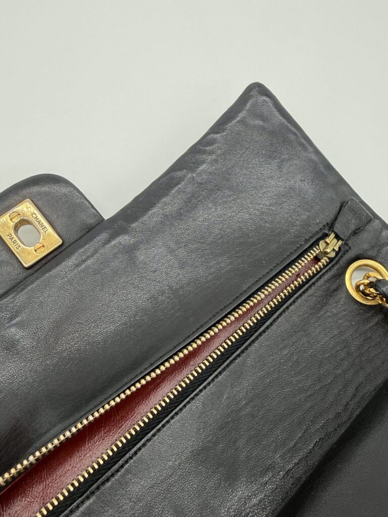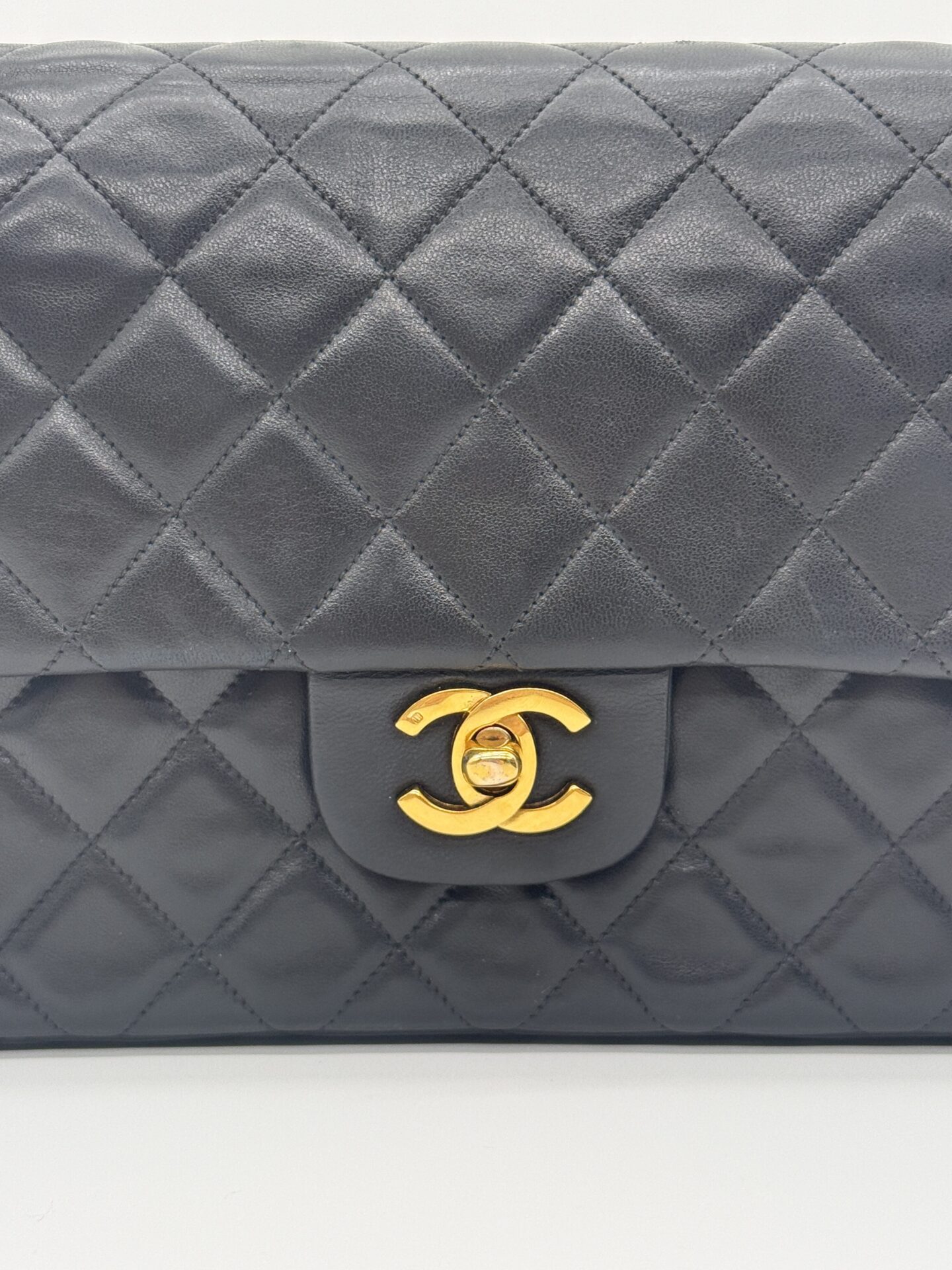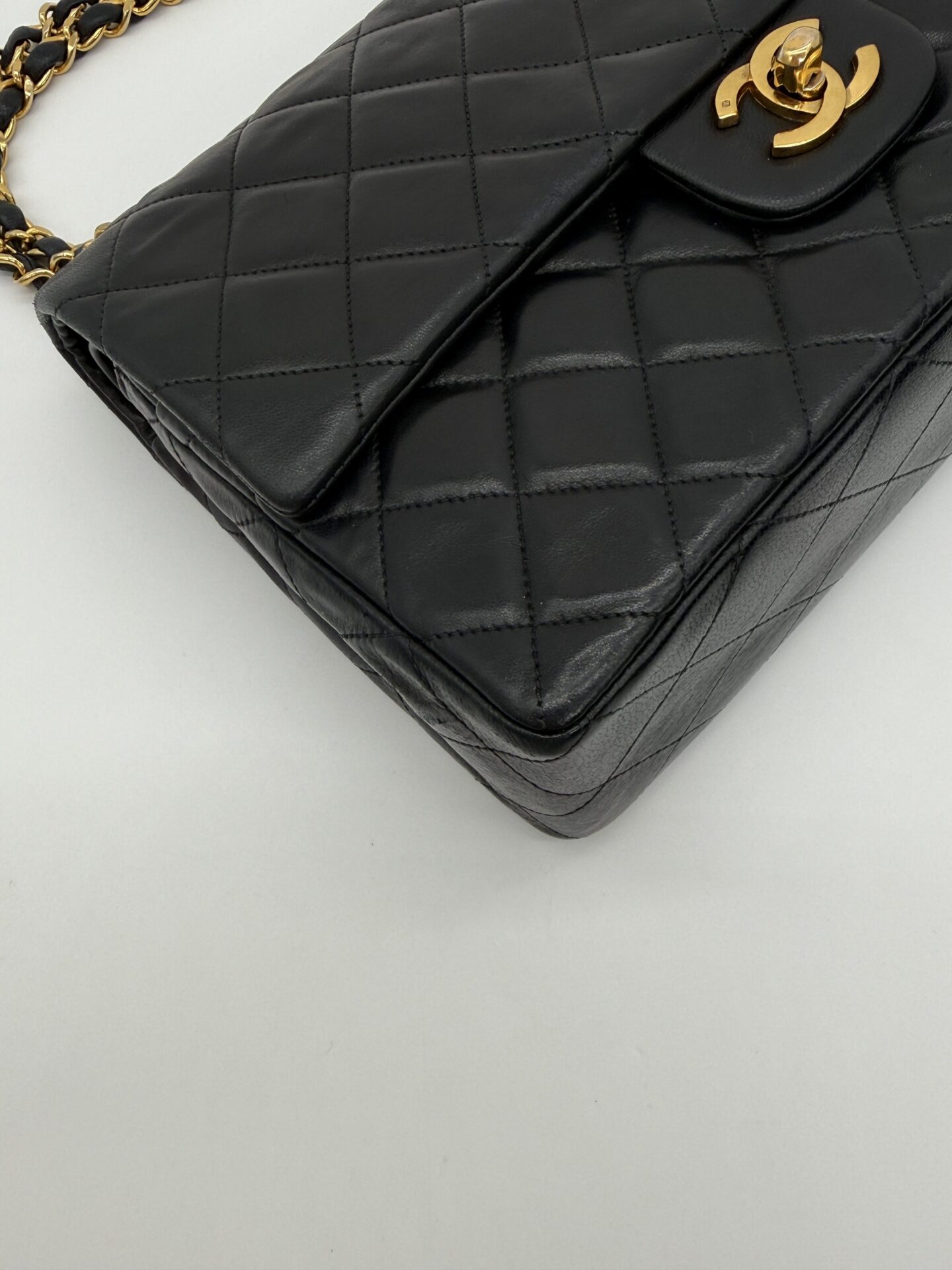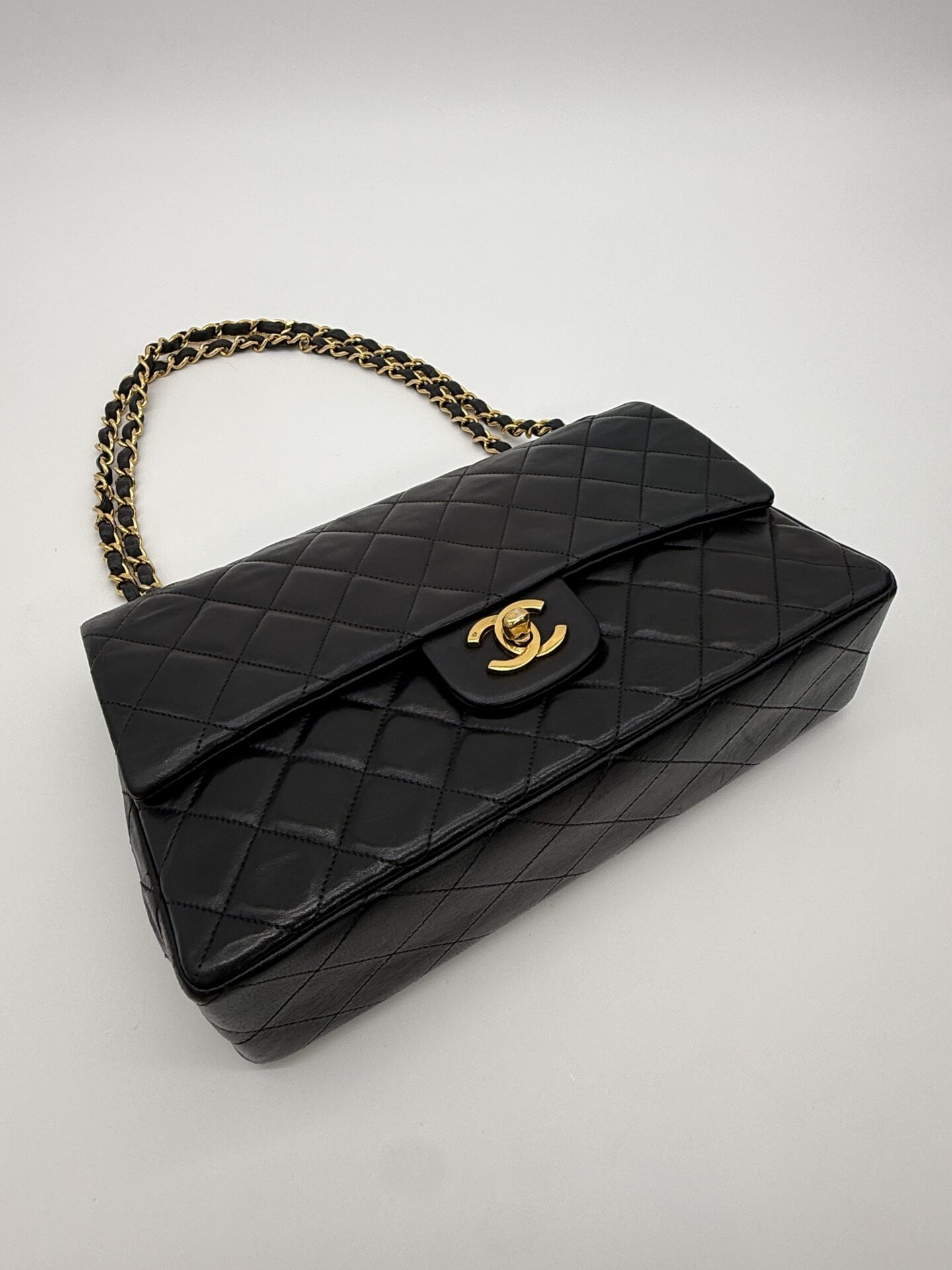 The bag is in excellent condition: the lambskin cushions are still beautifully full, the corners are perfectly preserved, and the shape remains crisp and intact. The 24-carat gold-plated hardware adds an extra touch of luxury and highlights Chanel’s refined craftsmanship.