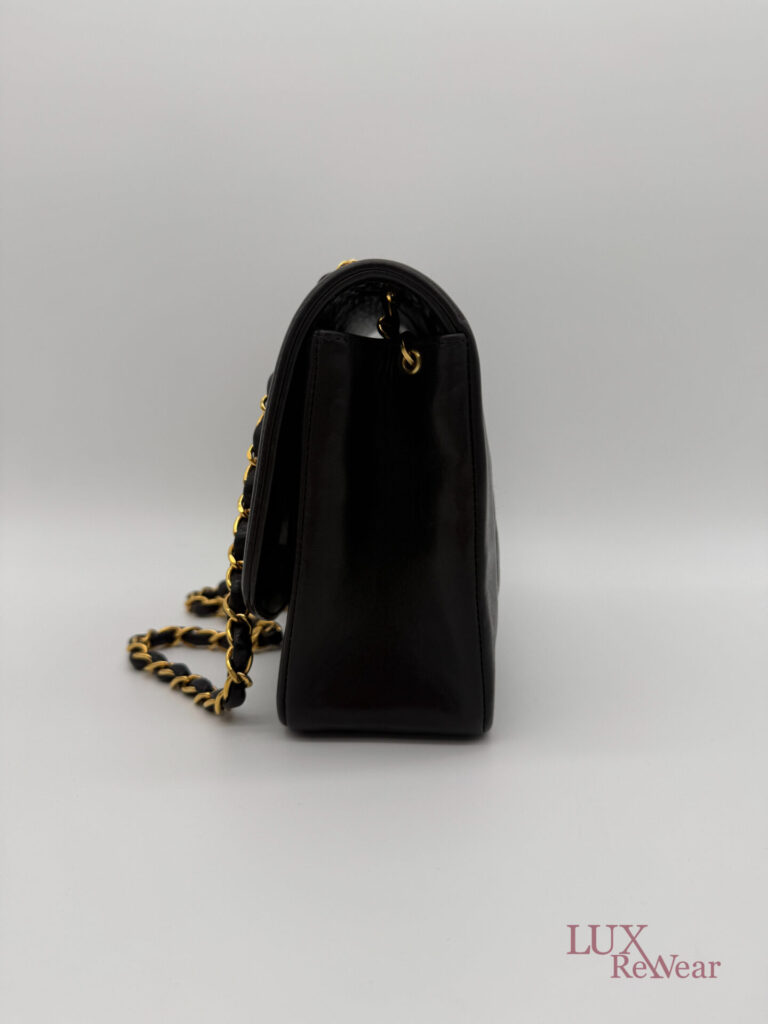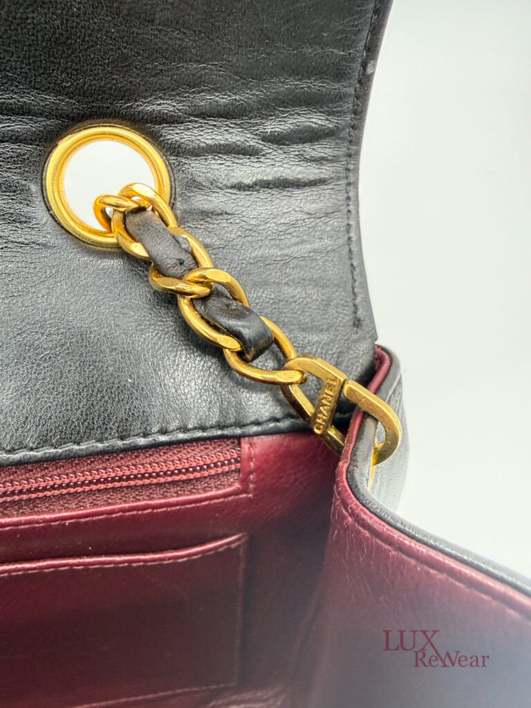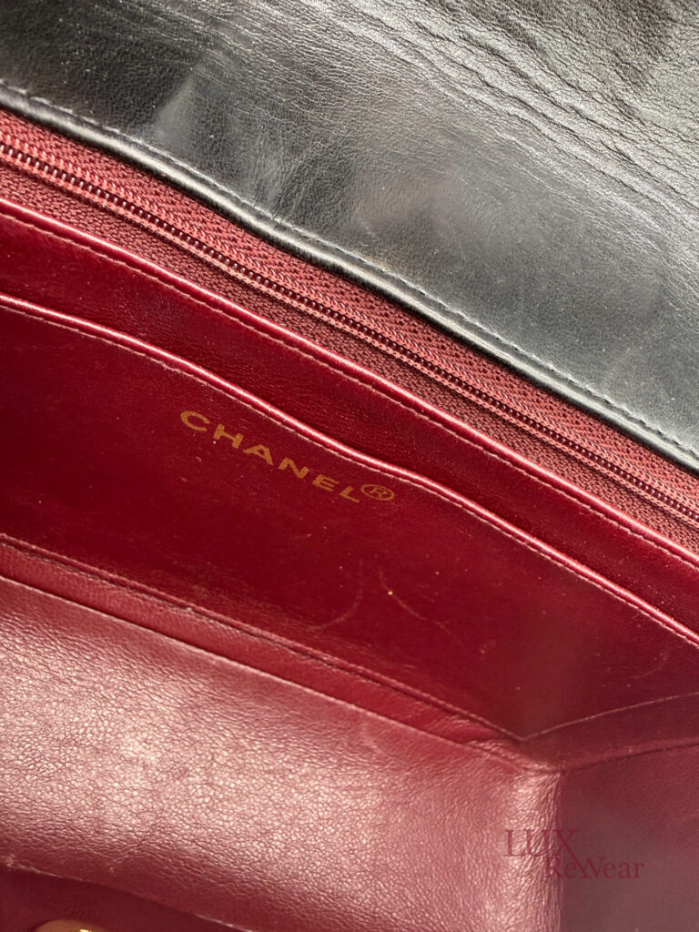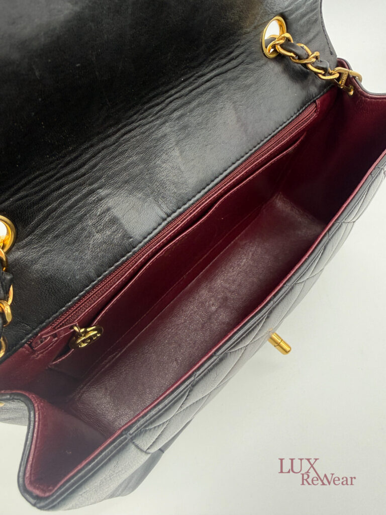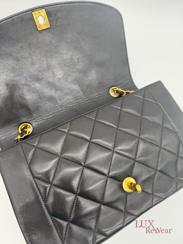 This classic Chanel Diana bag is made from black quilted lambskin leather and has 24k gold plated hardware. The inside of the bag is bordeaux red. The bag closes with the turn lock and inside there is a zipper bag. There is a little gold charm attached to the zipper. Thanks to the long chain, you can wear this bag perfectly crossbody if you want. The serial number of the bag is 3075358, and the bag was produced between 1994-1996.