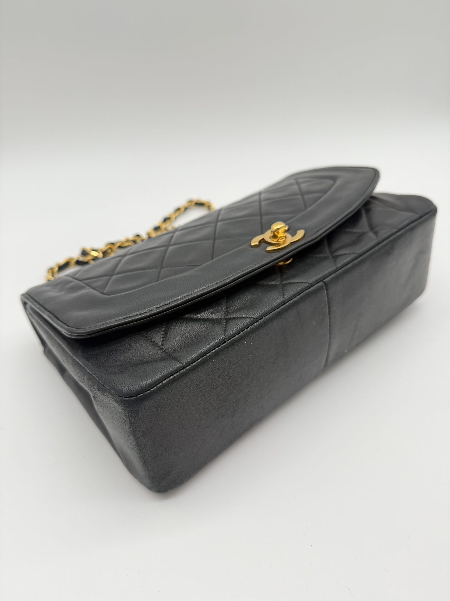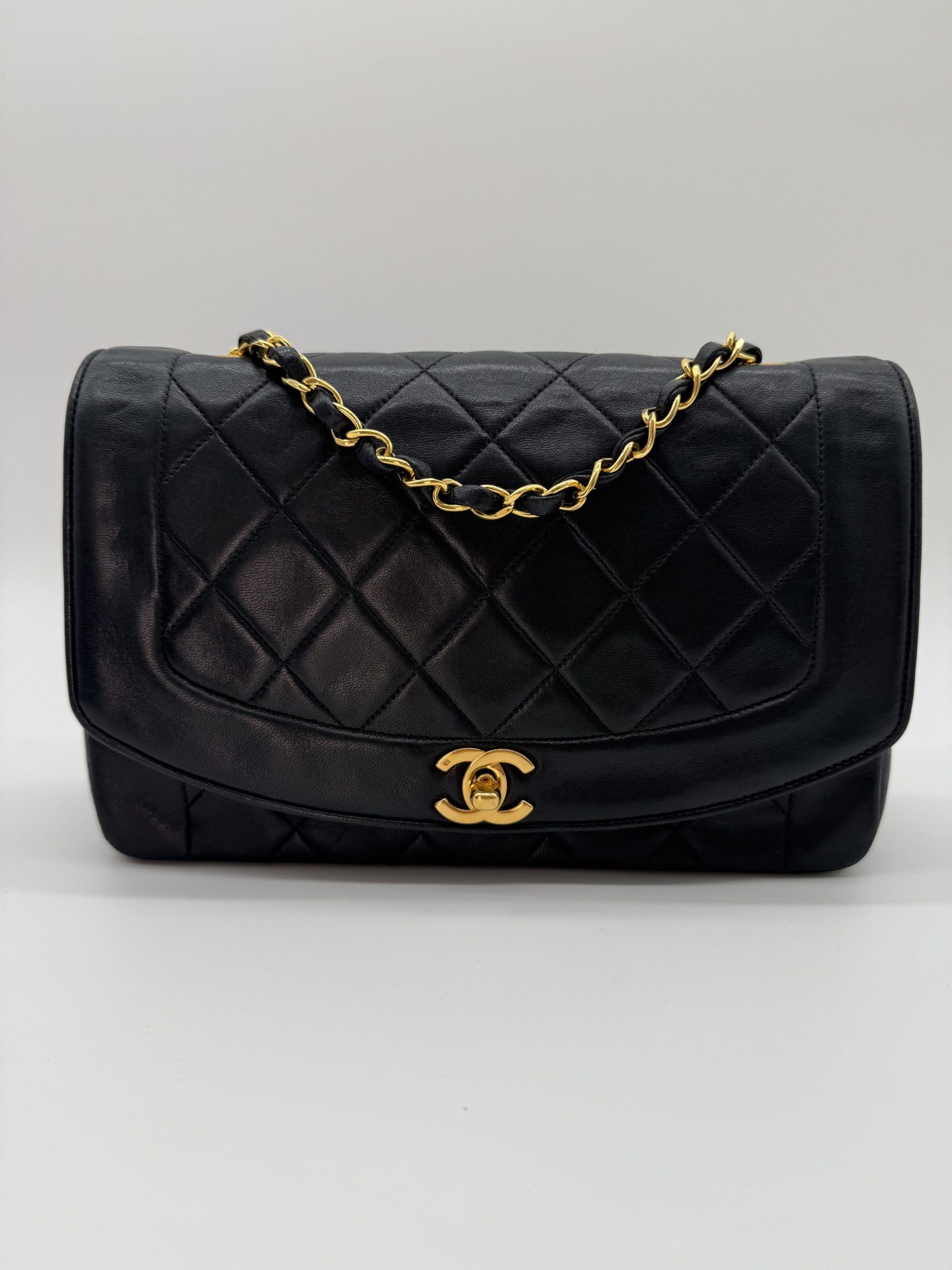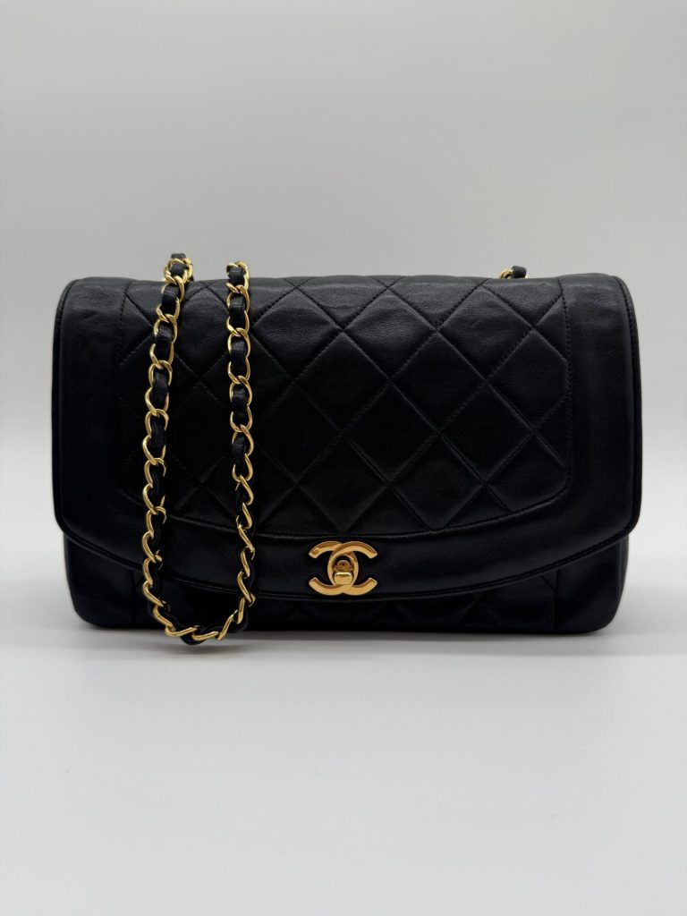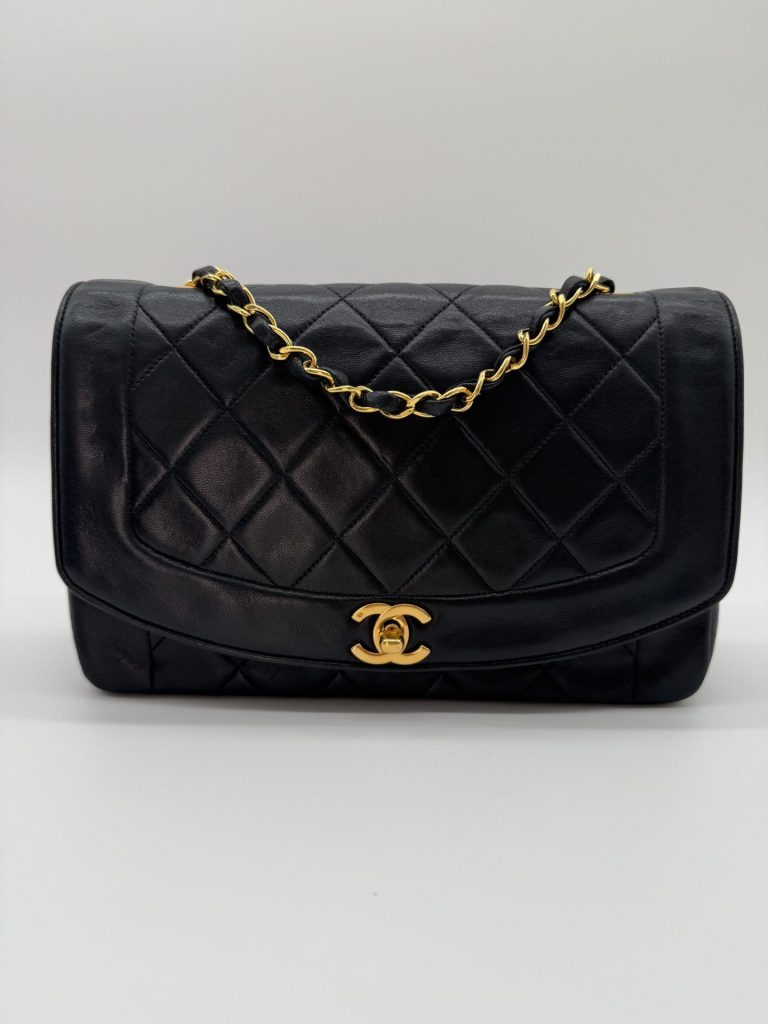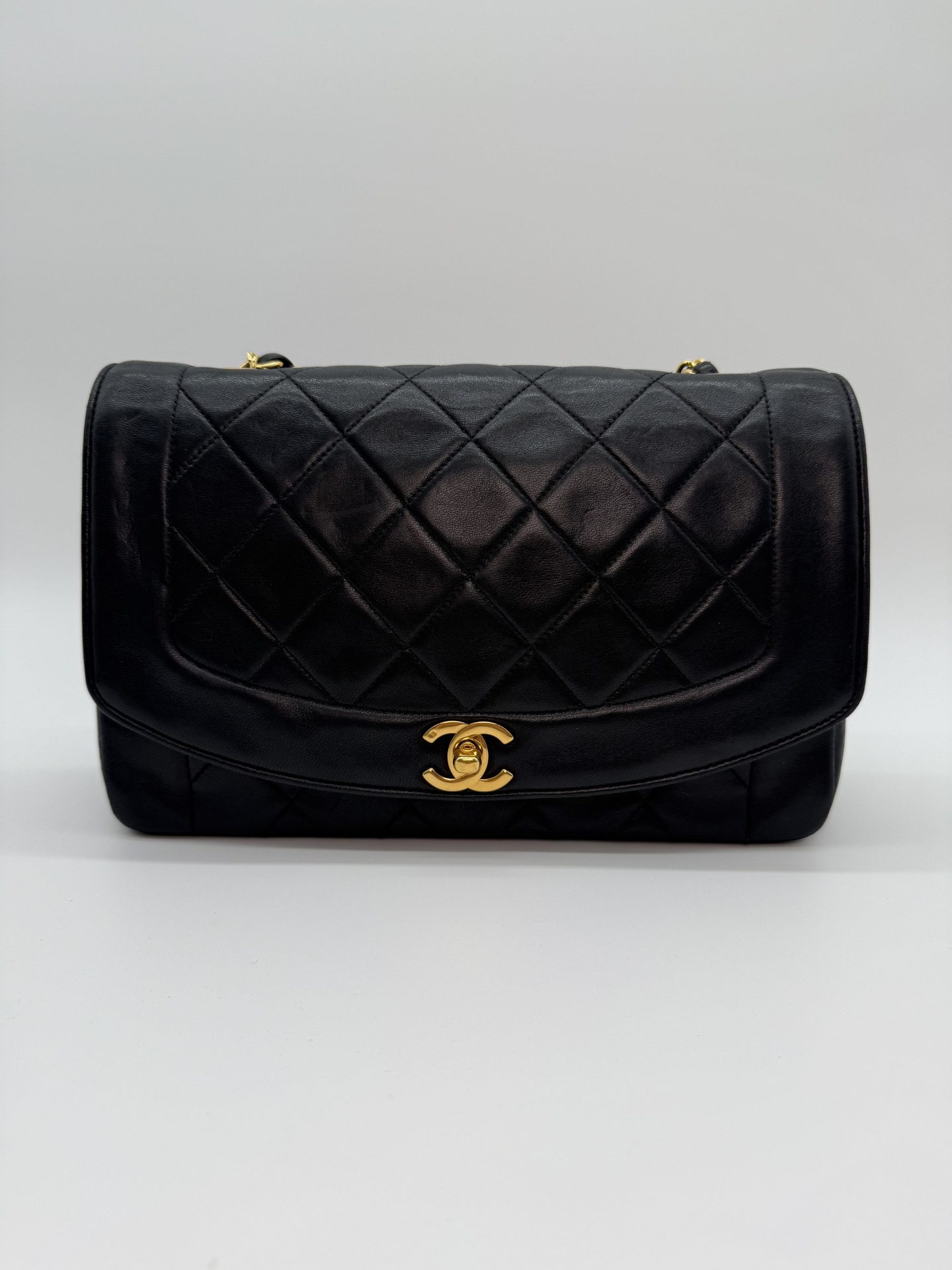 This classic Chanel Diana bag is made from black quilted lambskin leather and has 24k gold plated hardware. The inside of the bag is bordeaux red. The bag closes with the turn lock and inside there is a zipper bag. There is a little gold charm attached to the zipper.
