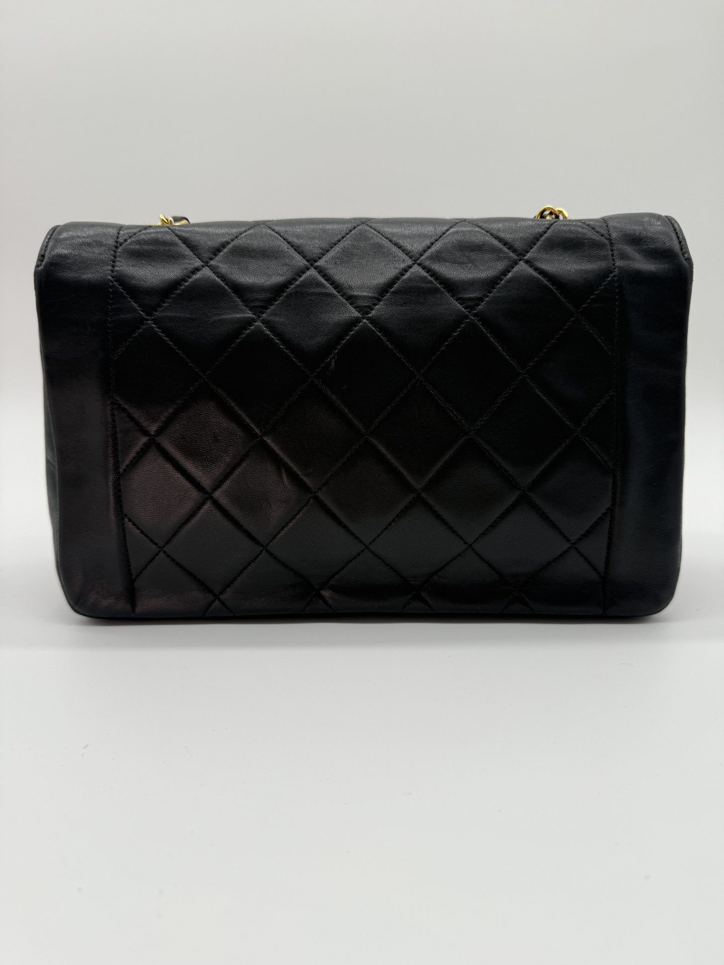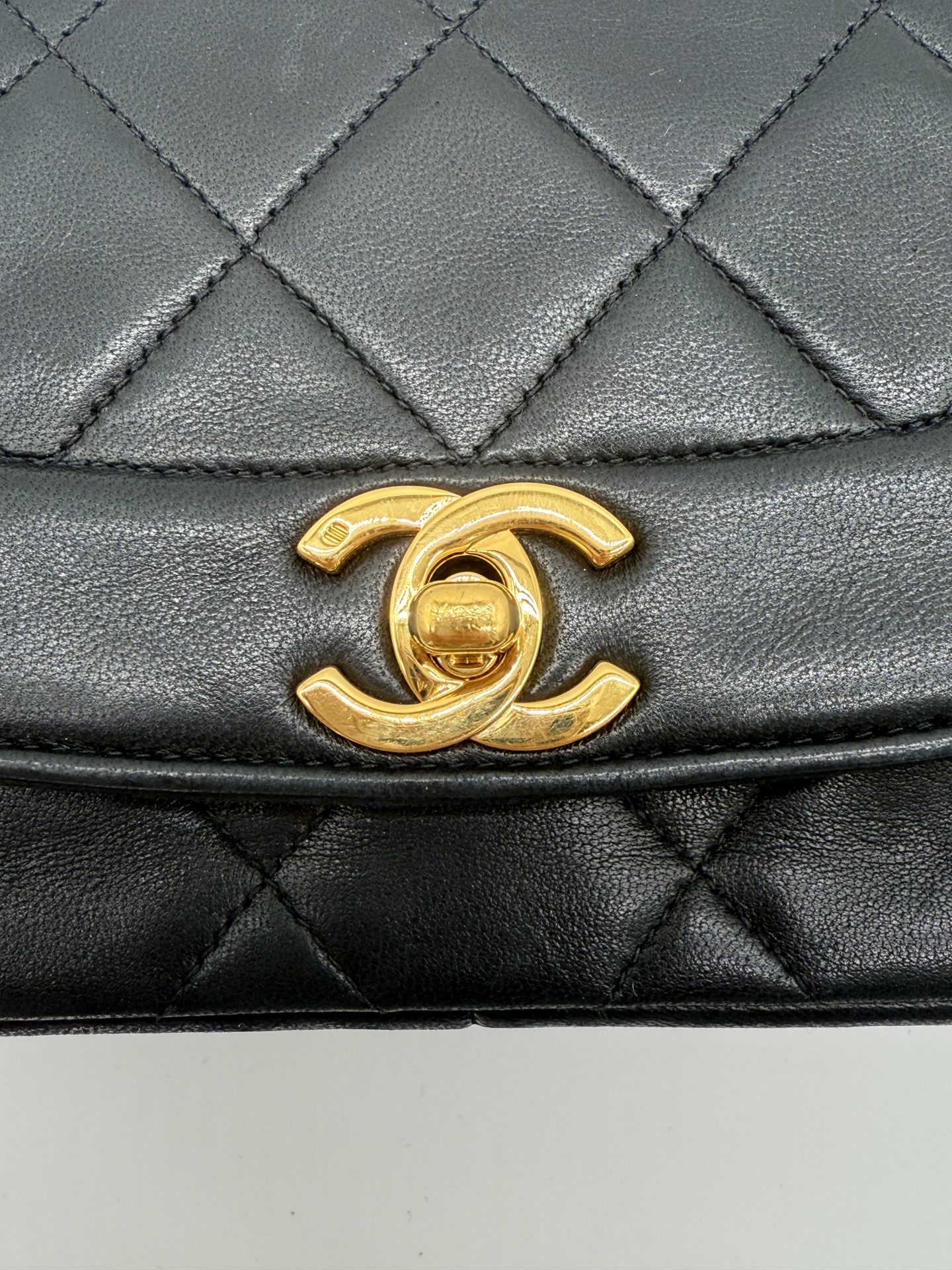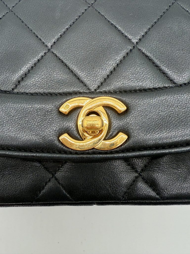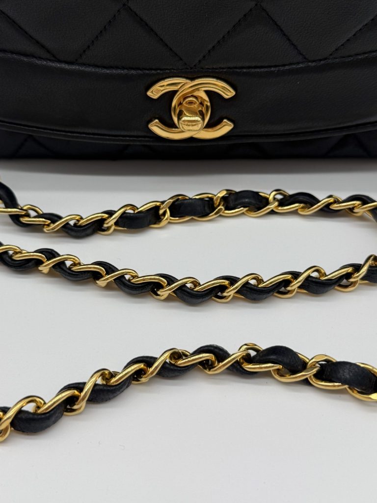 This classic Chanel Diana bag is made from black quilted lambskin leather and has 24k gold plated hardware. The inside of the bag is bordeaux red. The bag closes with the turn lock and inside there is a zipper bag. There is a little gold charm attached to the zipper.