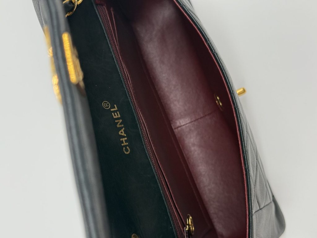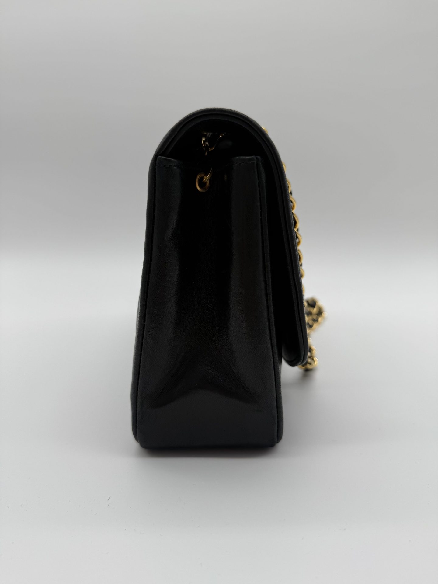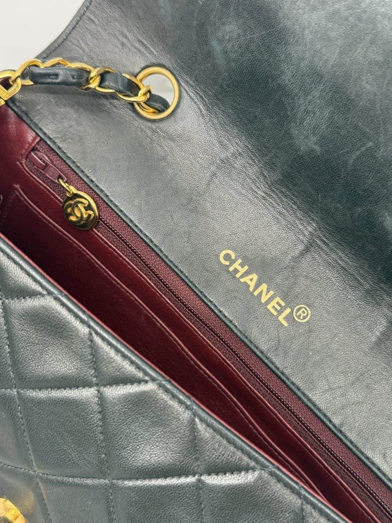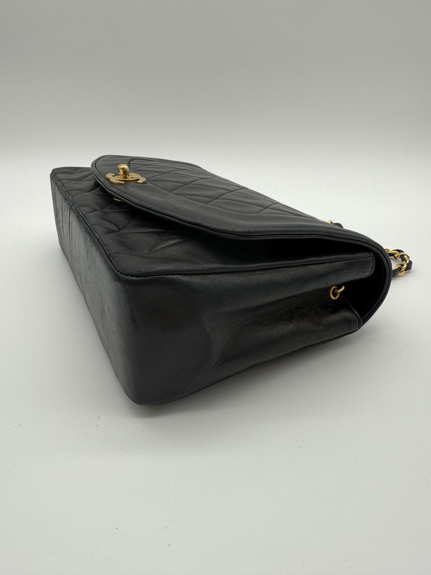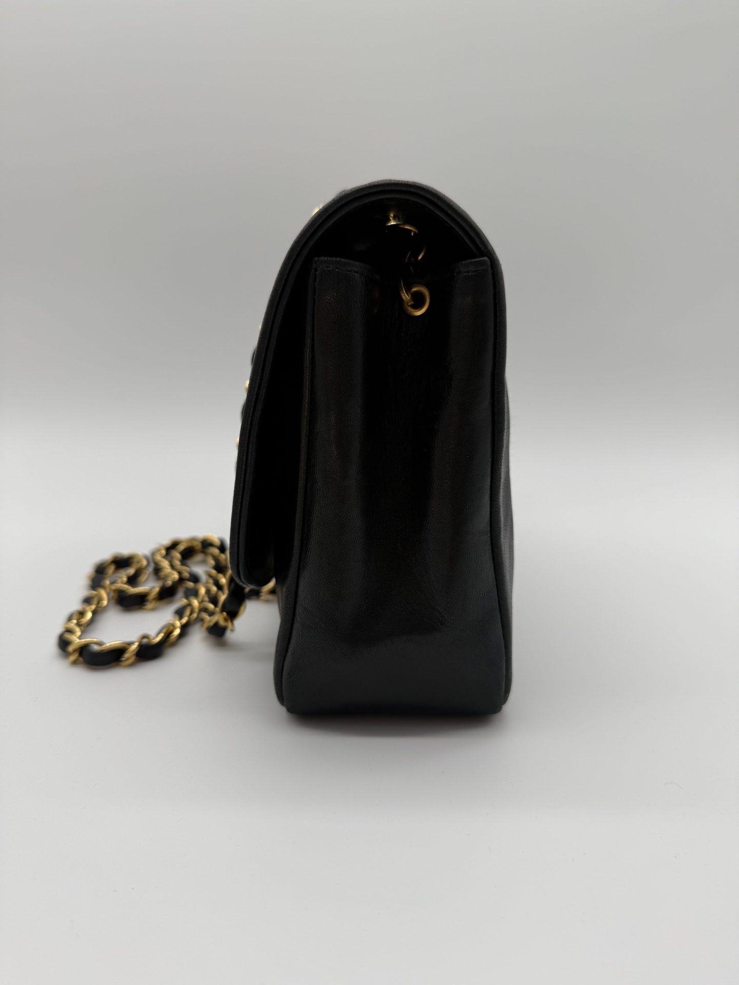 This classic Chanel Diana bag is made from black quilted lambskin leather and has 24k gold plated hardware. The inside of the bag is bordeaux red. The bag closes with the turn lock and inside there is a zipper bag. There is a little gold charm attached to the zipper.