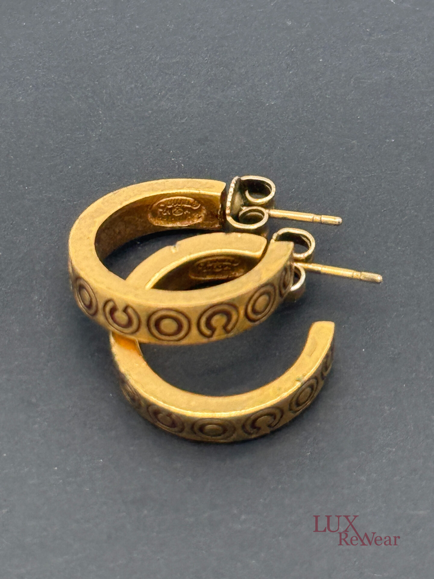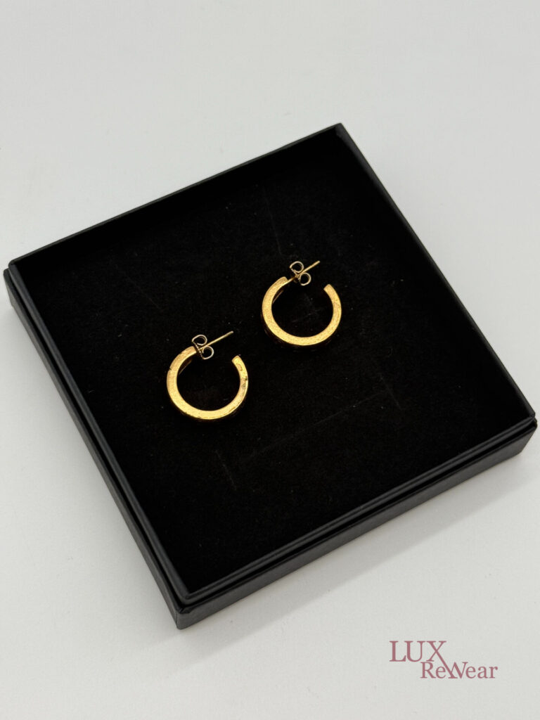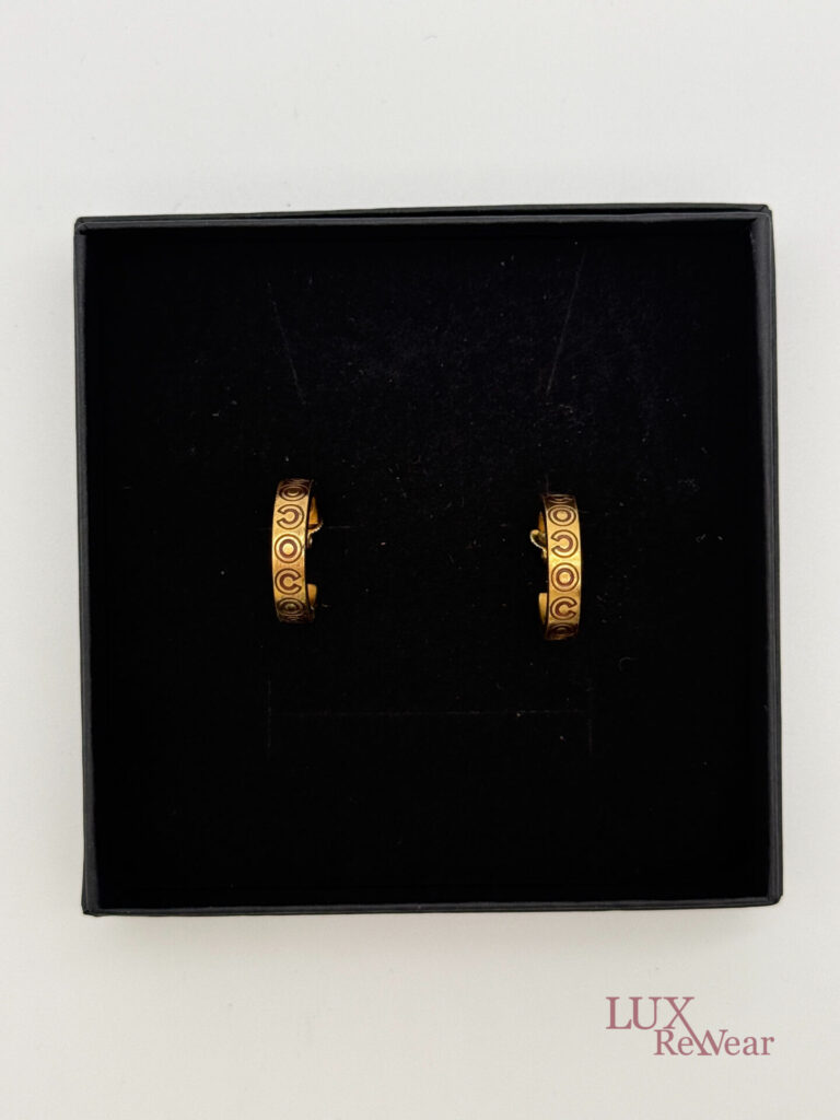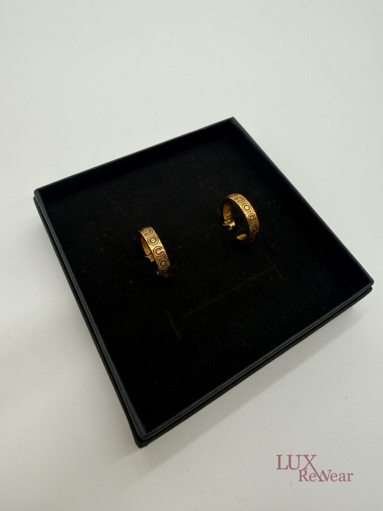 These 24-carat gold-plated Chanel earrings feature the letters COCO in a playful design. The earrings close securely and bear the Chanel logo on the inside. This indicates that the earrings were produced in France and are part of the 2001 fall collection (01A).