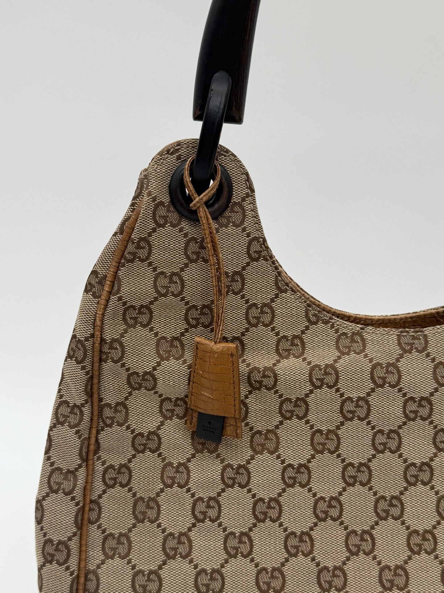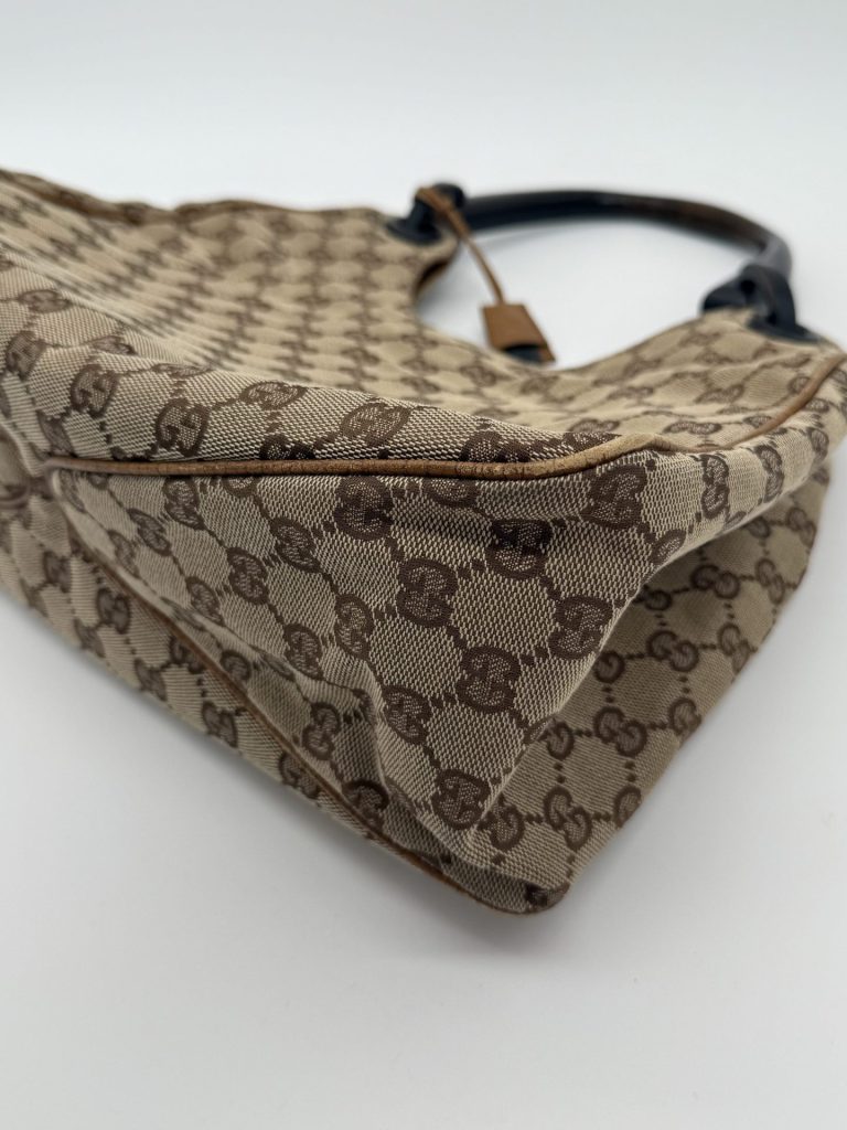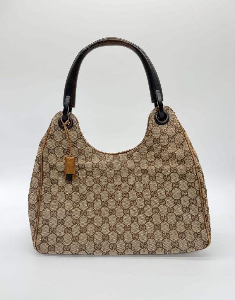 This pre-loved Gucci GG Canvas Hobo Bag is a stylish and timeless piece, made in Italy from the iconic beige GG canvas. The classic hobo design is finished with signature bamboo details, giving it a unique vintage look. Lightweight and spacious, it’s perfect for everyday use, a true must-have for vintage designer lovers.