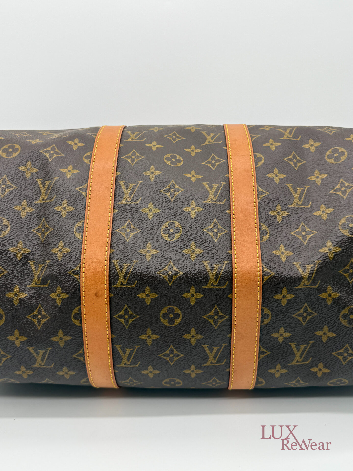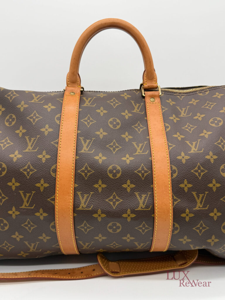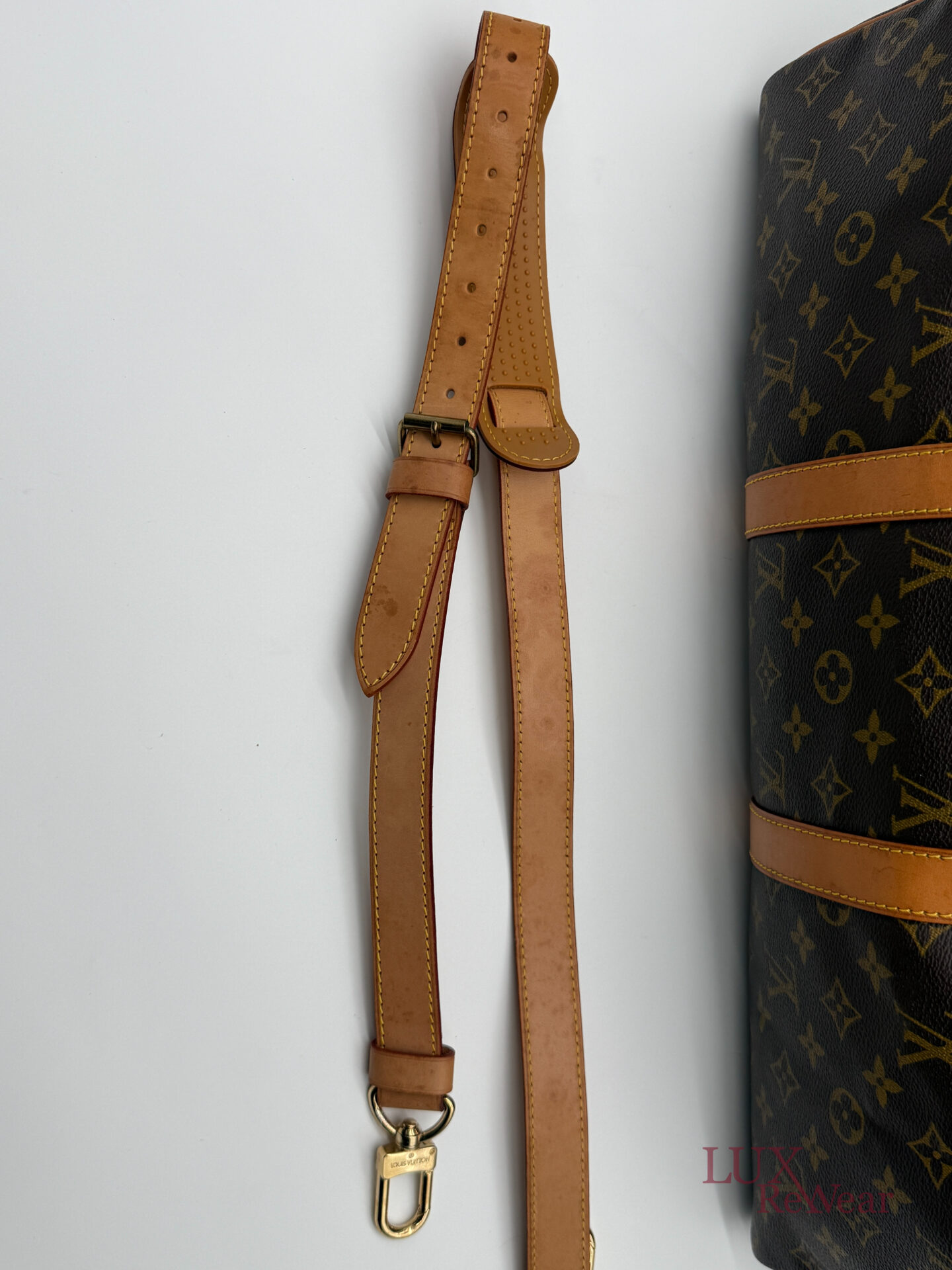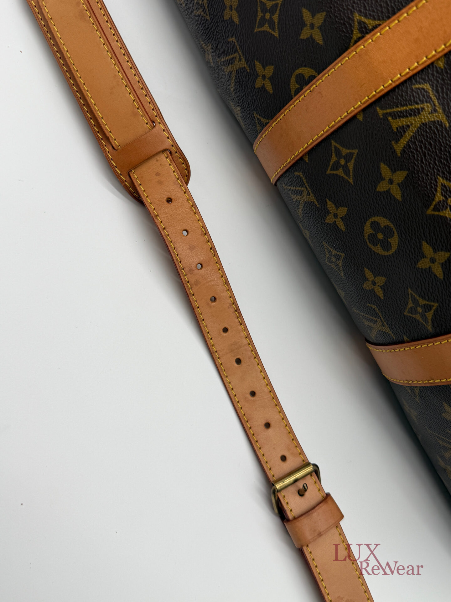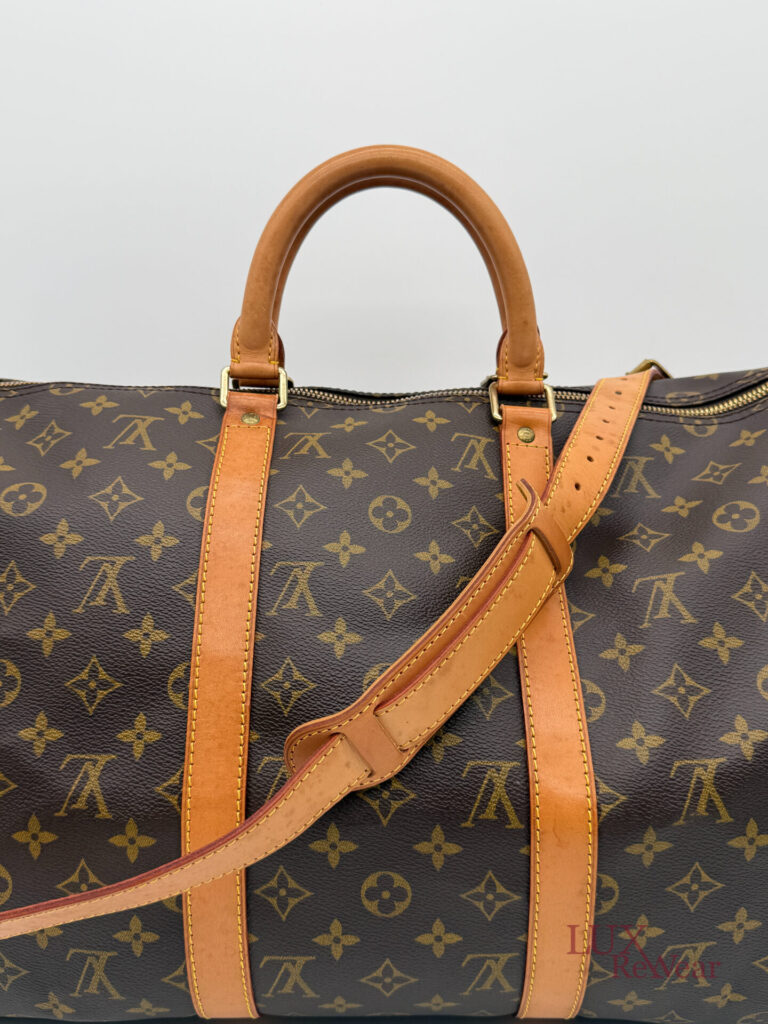 This vintage Louis Vuitton Keepall 50 Bandoulière features monogram canvas, vachetta leather and gold hardware. The item is in good vintage condition, with some general signs of wear. The bag has a long strap to wear over the shoulder. This bag is allowed as hand luggage on the plane. The date code of this item is TH0965 (made in France in June 1995).