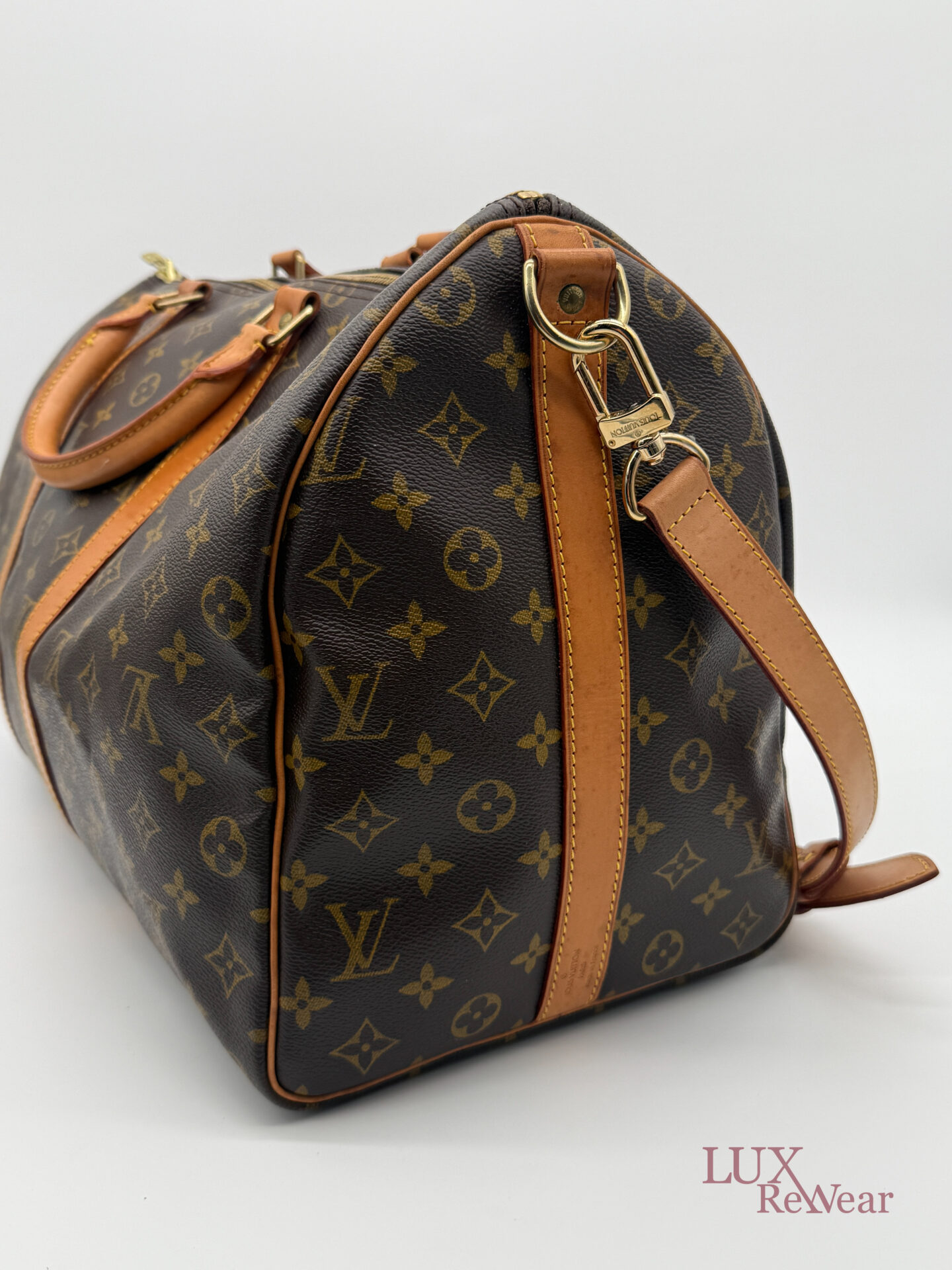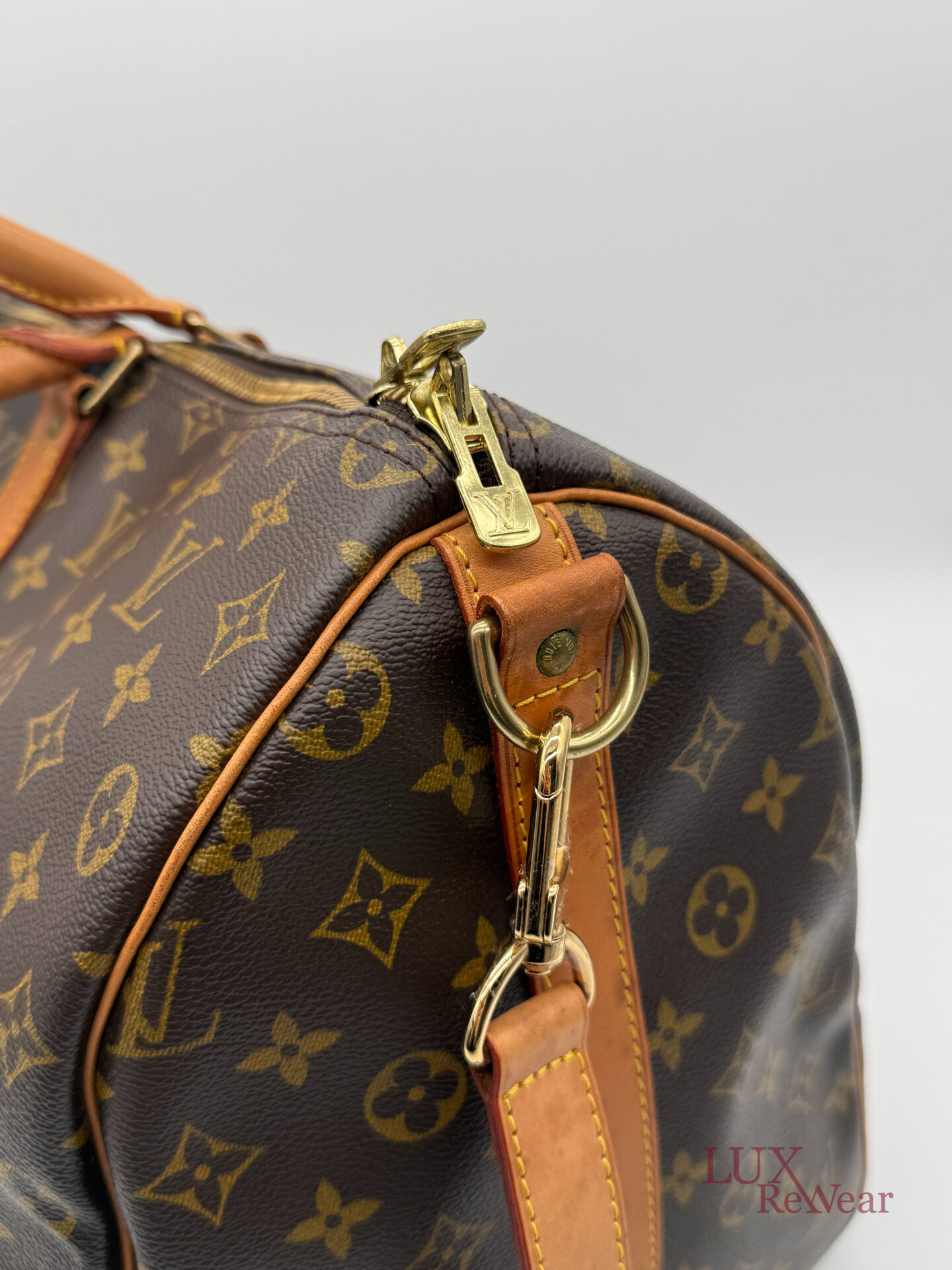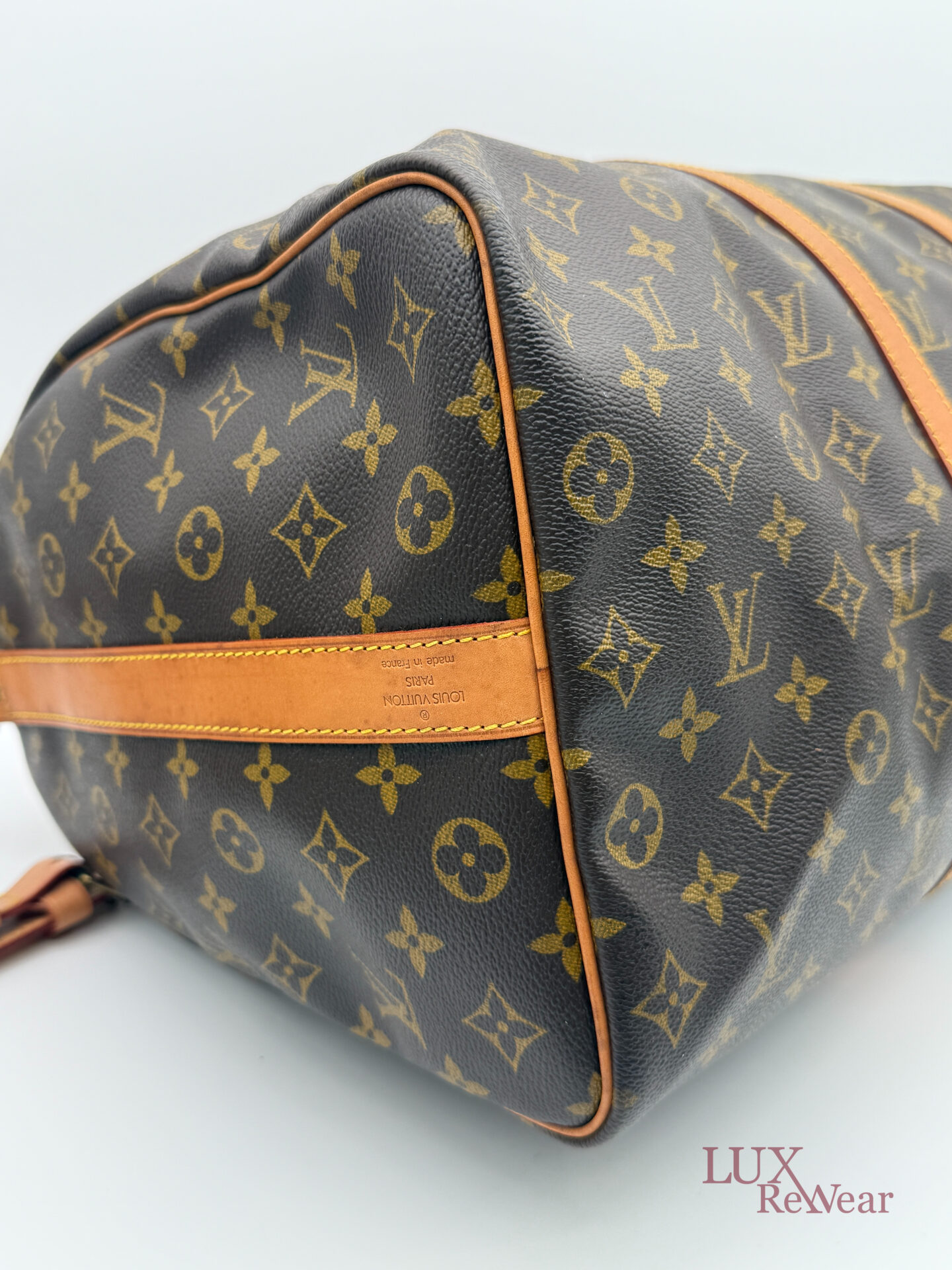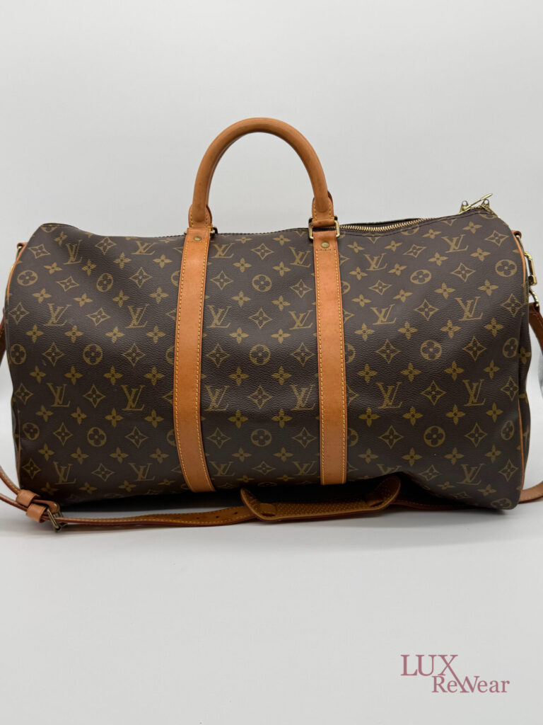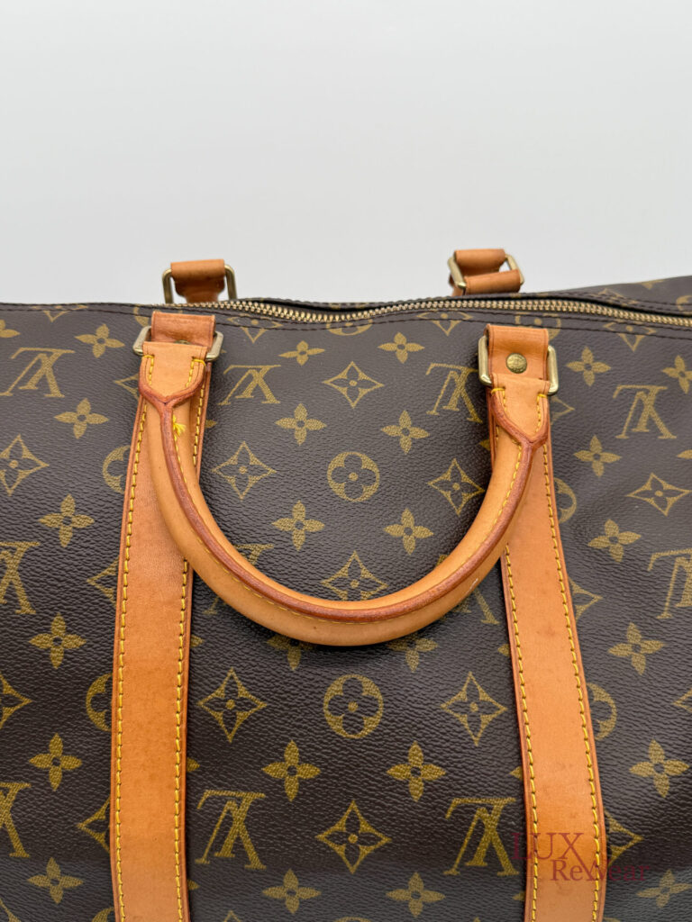 This vintage Louis Vuitton Keepall 50 Bandoulière features monogram canvas, vachetta leather and gold hardware. The item is in good vintage condition, with some general signs of wear. The bag has a long strap to wear over the shoulder. This bag is allowed as hand luggage on the plane. The date code of this item is TH0965 (made in France in June 1995).