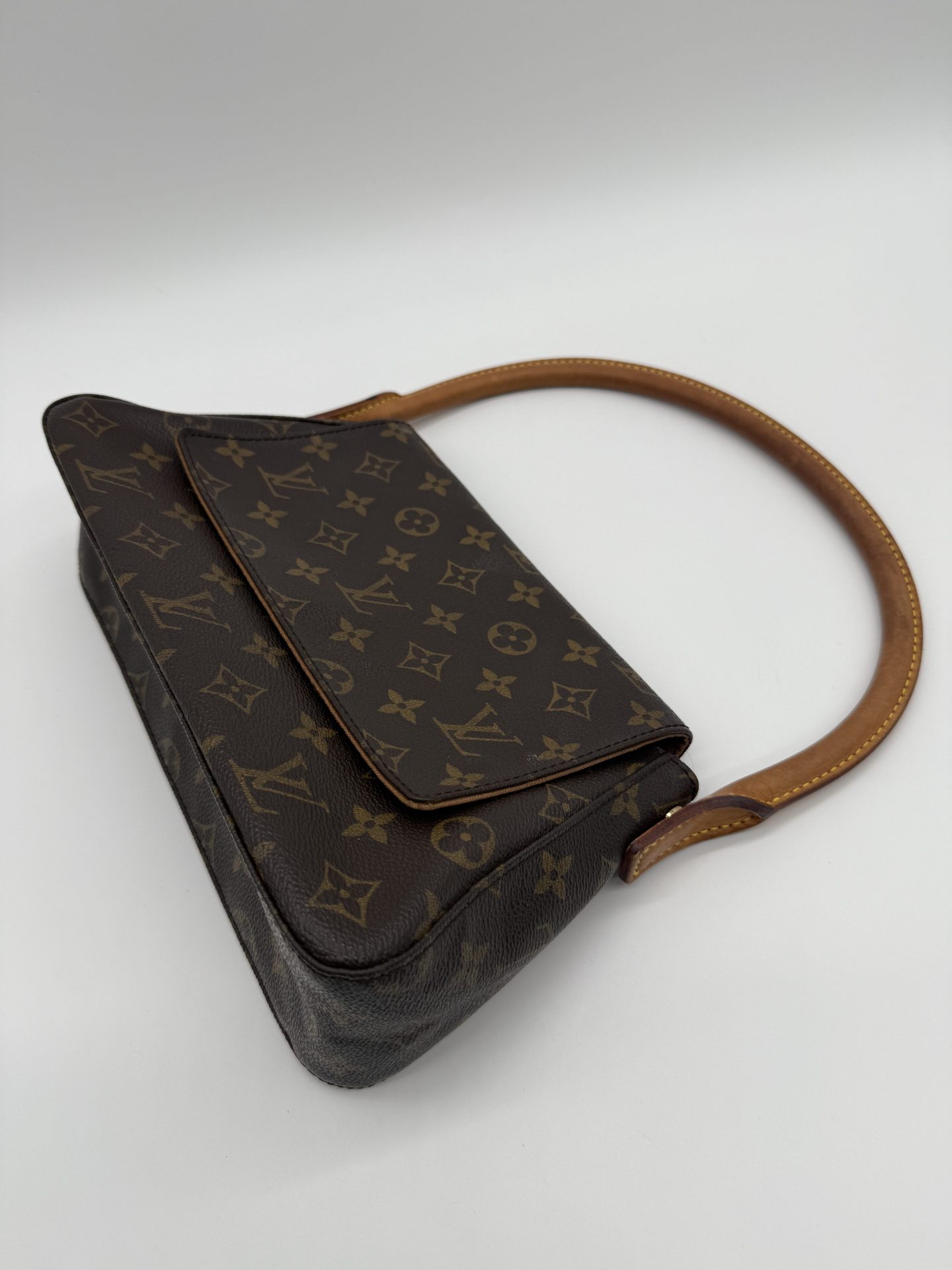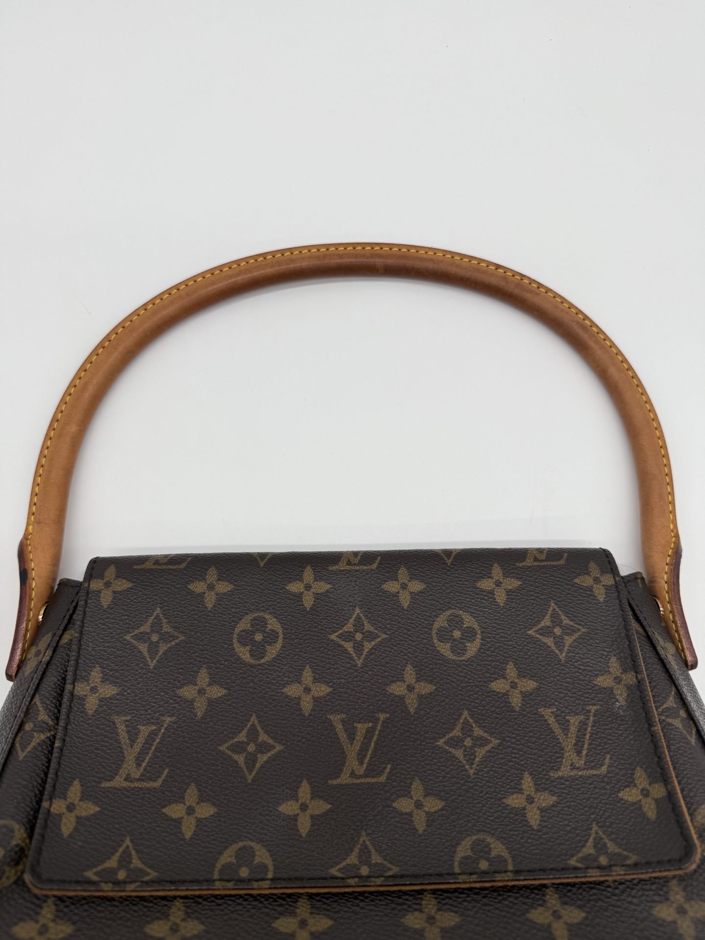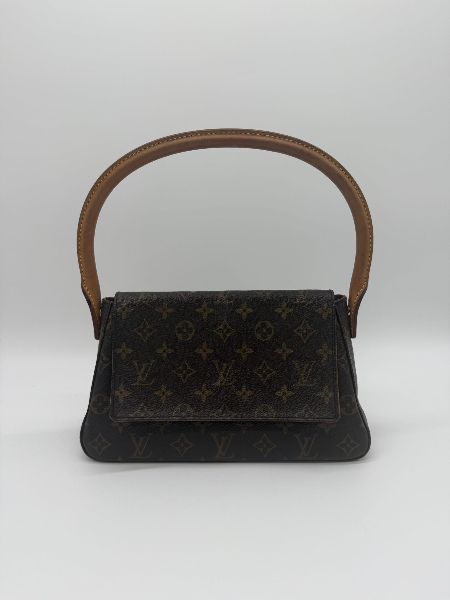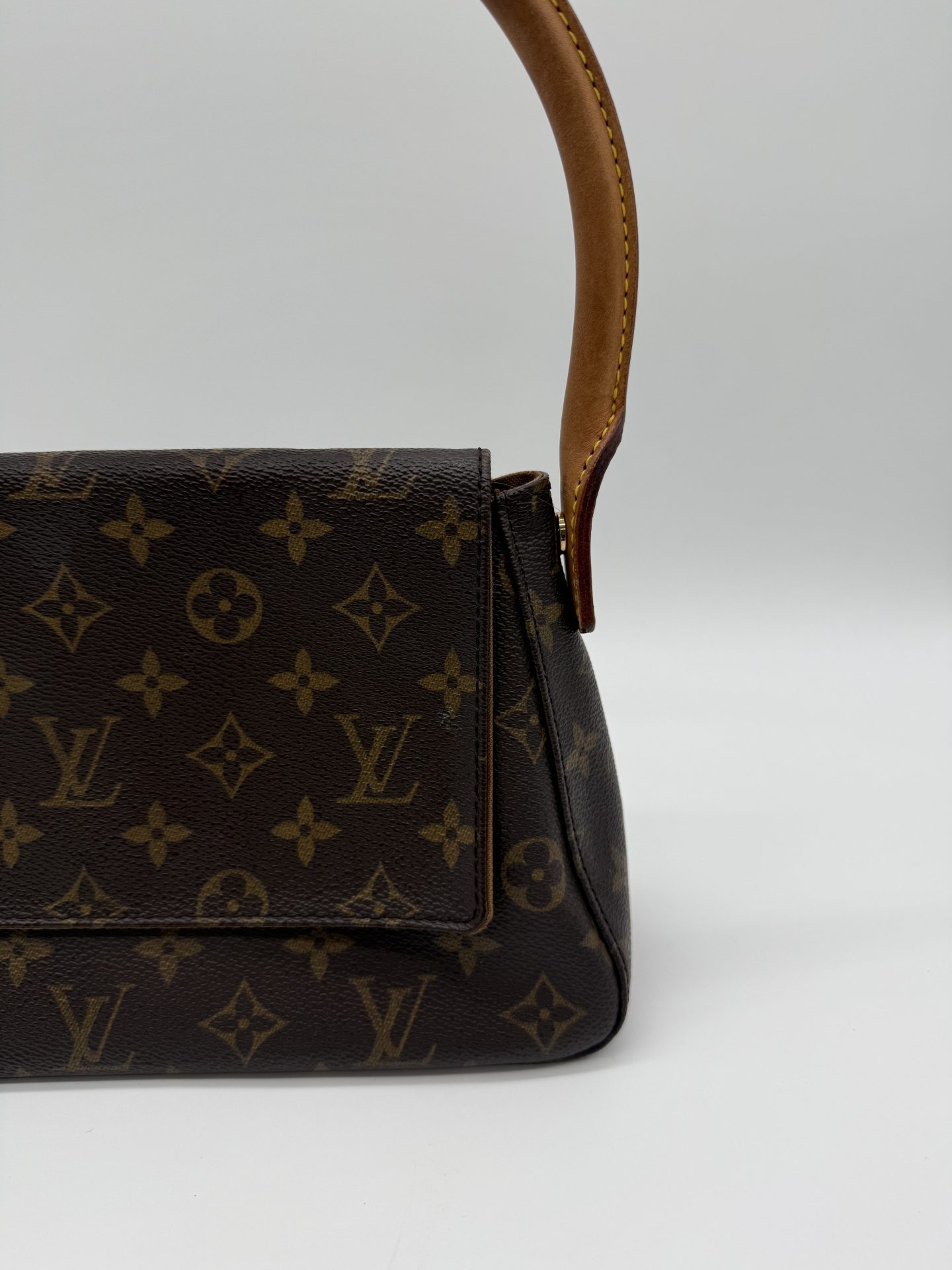 This Louis Vuitton mini looping bag features the LV signature Monogram canvas with vachetta leather and gold-tone hardware. The bag has one big compartiment and a zipper pocket inside. This bas is made in November 2001 In France (serial number MI2001).