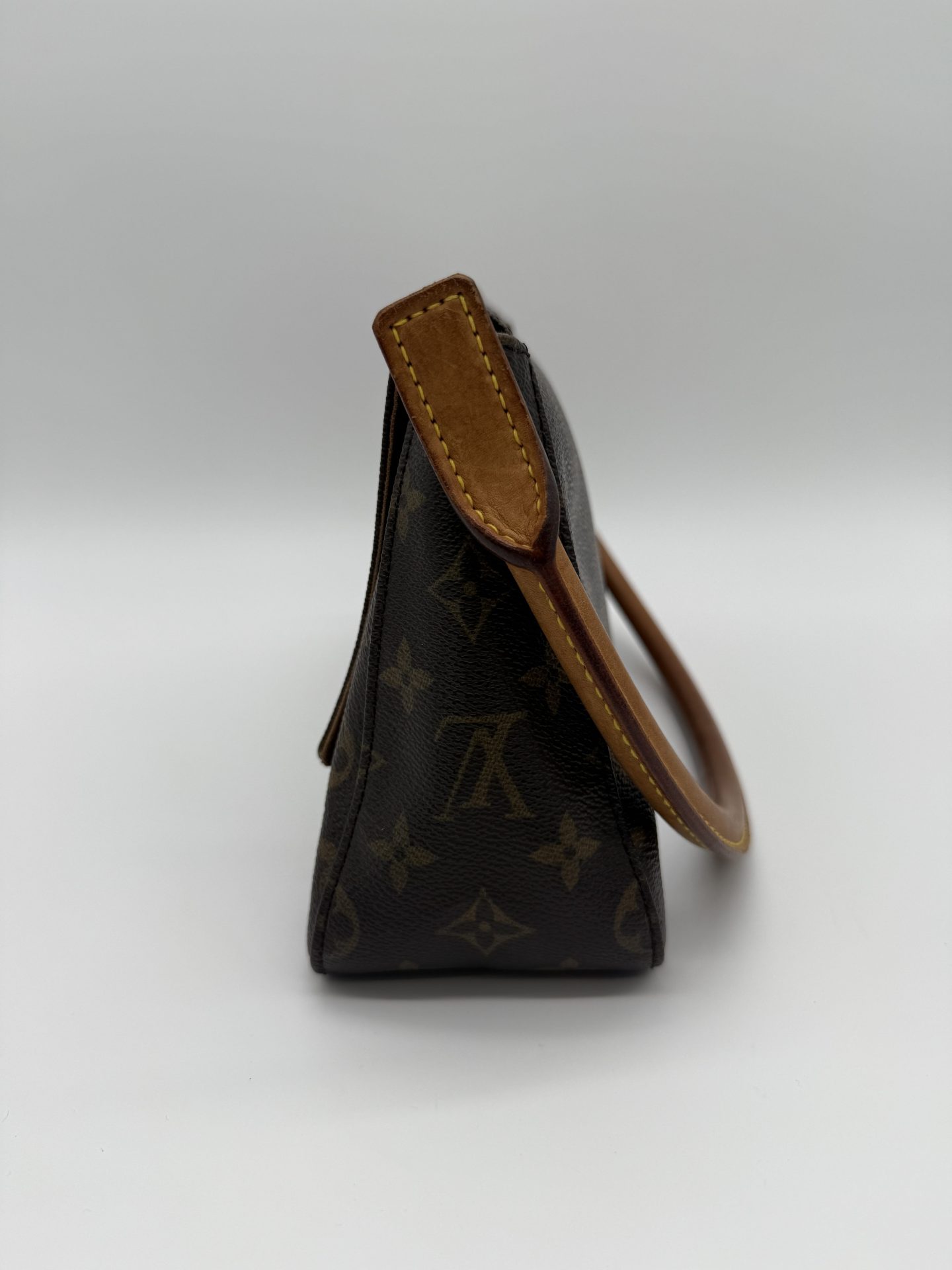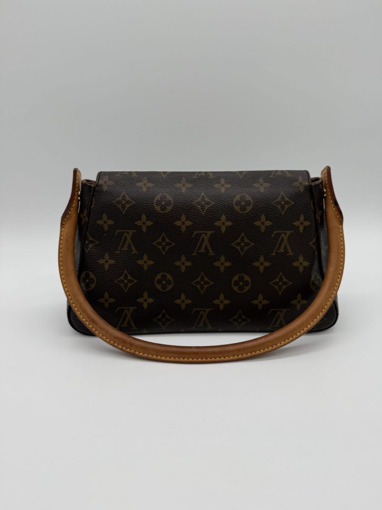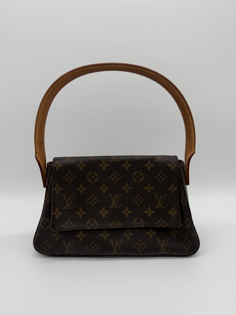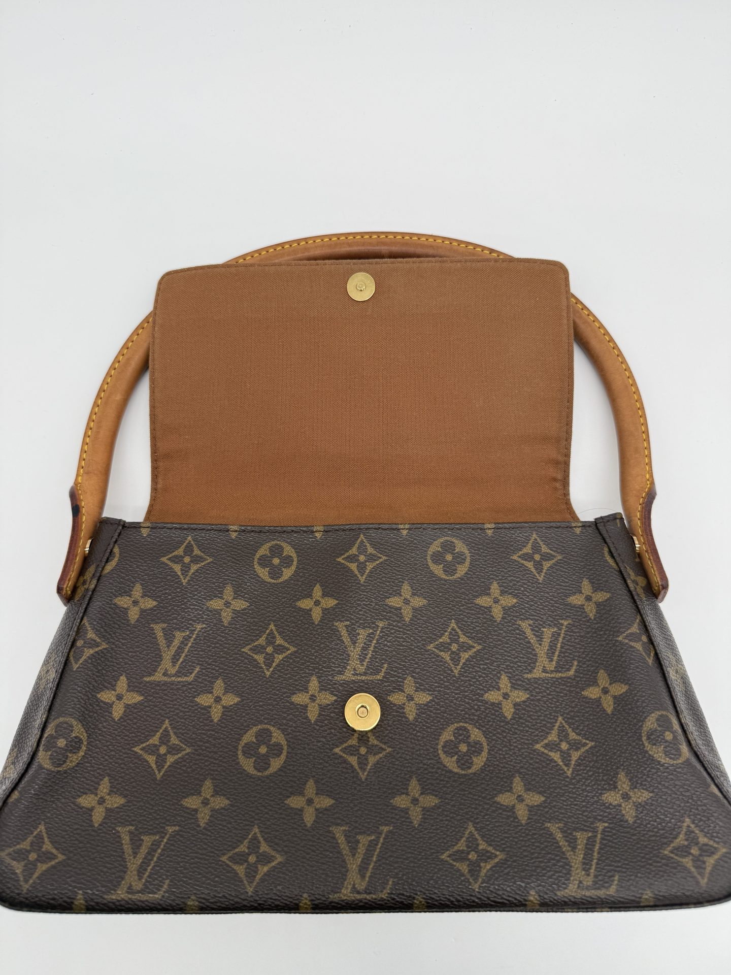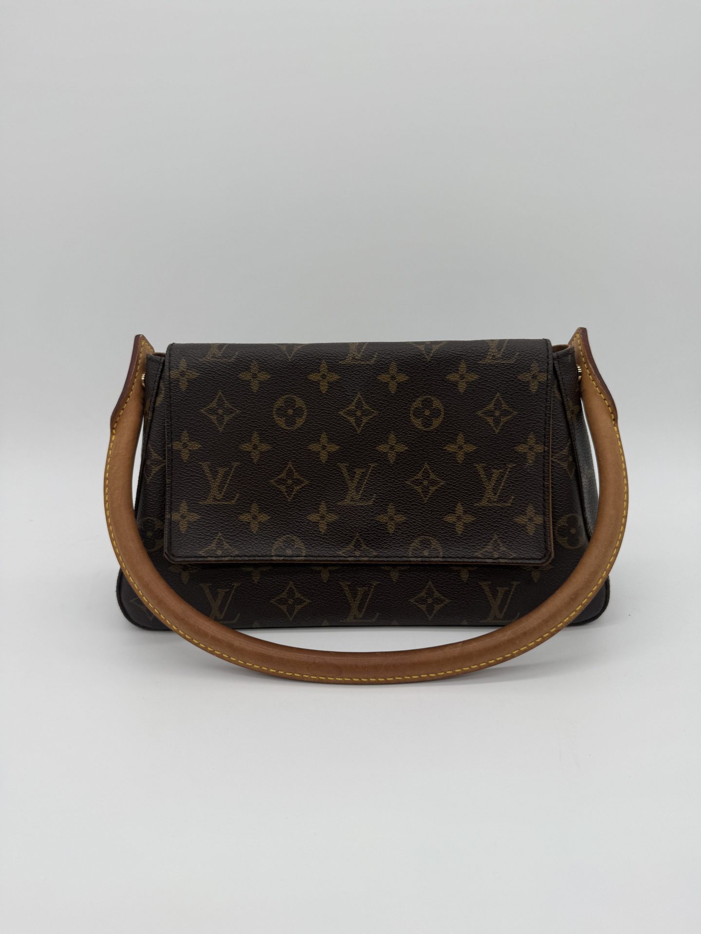 This Louis Vuitton mini looping bag features the LV signature Monogram canvas with vachetta leather and gold-tone hardware. The bag has one big compartiment and a zipper pocket inside. This bas is made in November 2001 In France (serial number MI2001).