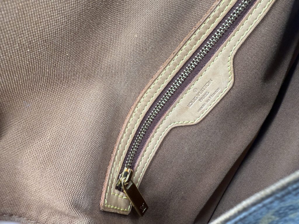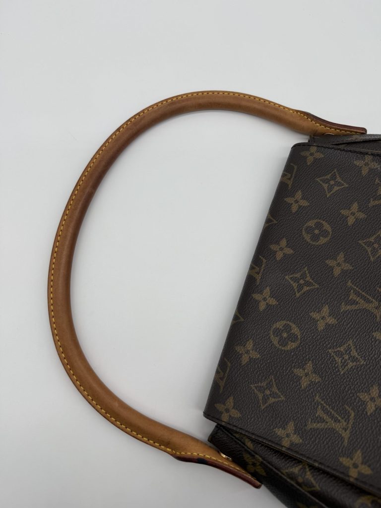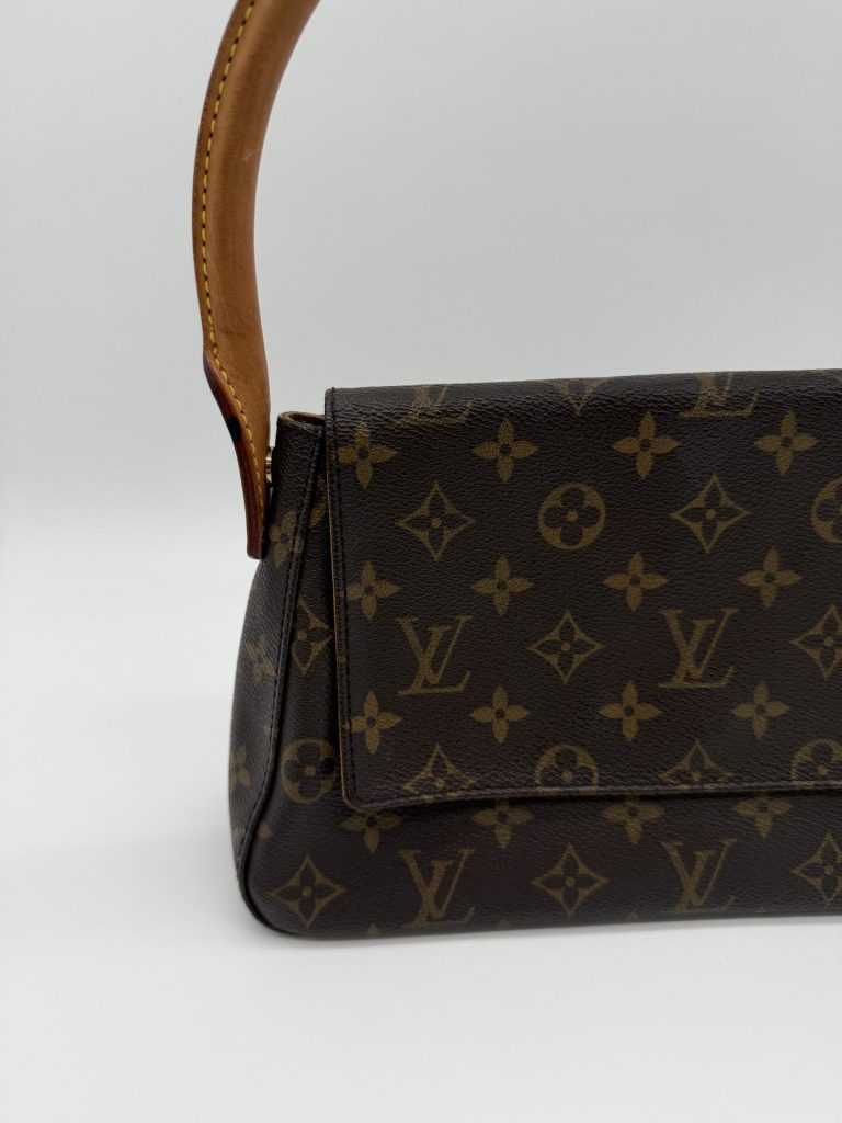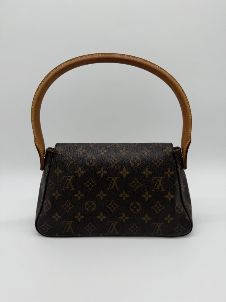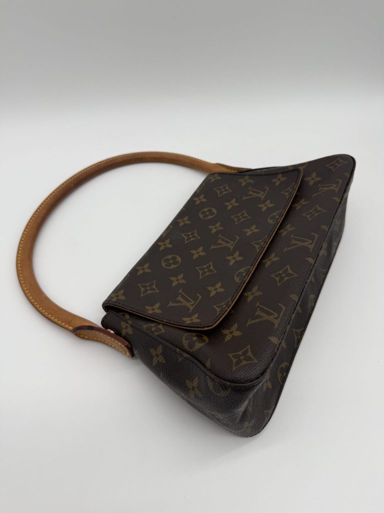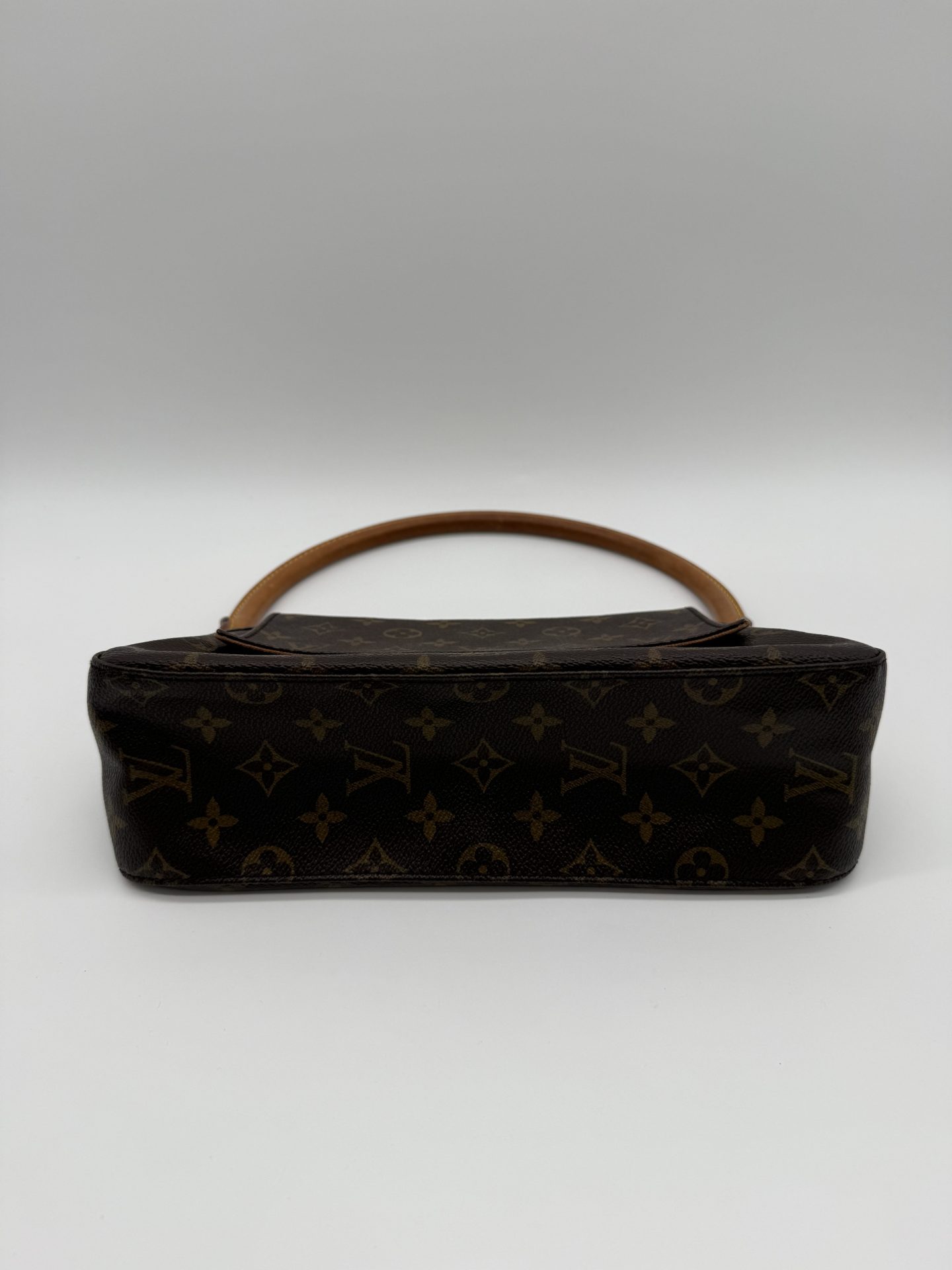 This Louis Vuitton mini looping bag features the LV signature Monogram canvas with vachetta leather and gold-tone hardware. The bag has one big compartiment and a zipper pocket inside. This bas is made in November 2001 In France (serial number MI2001).