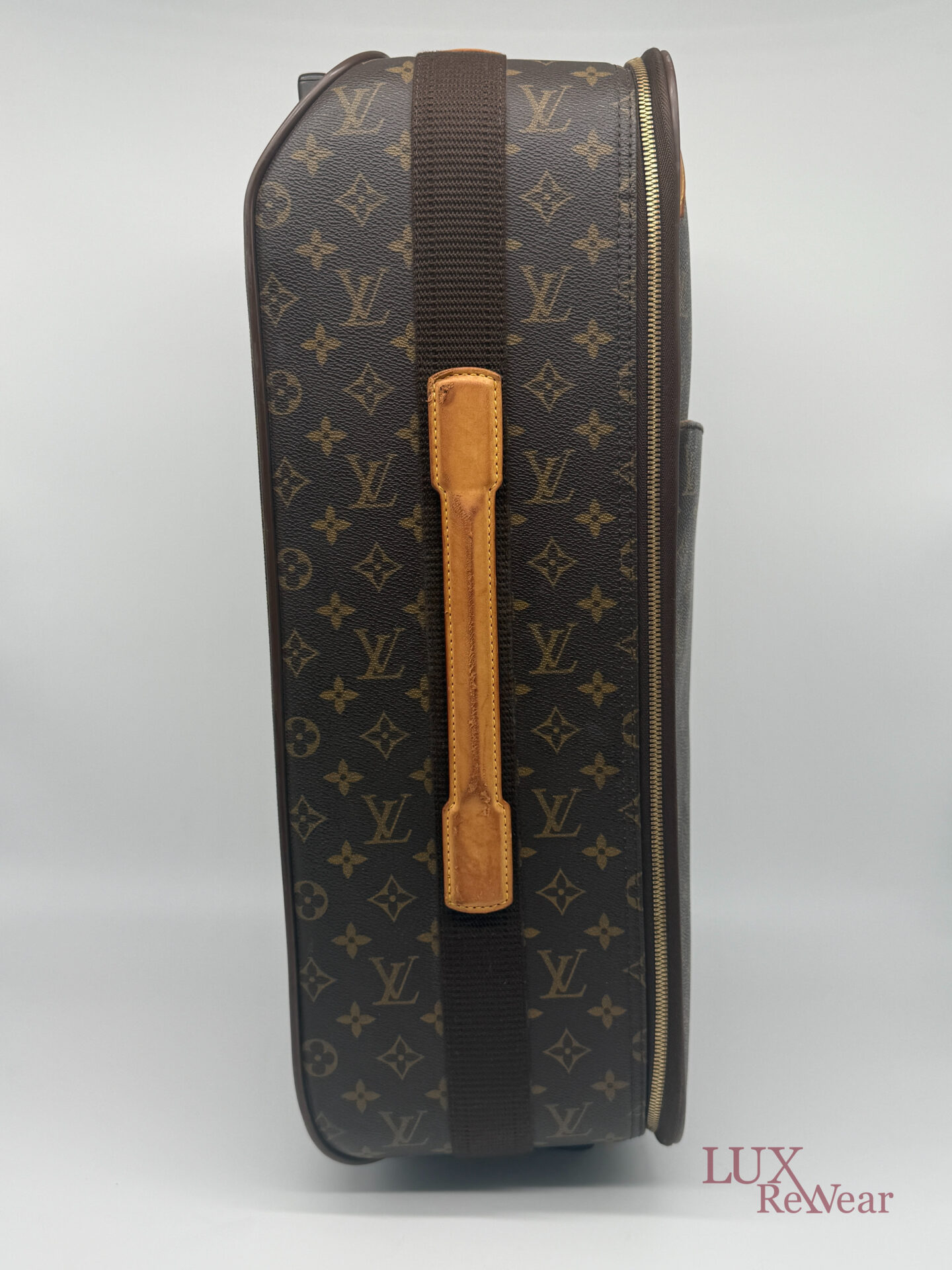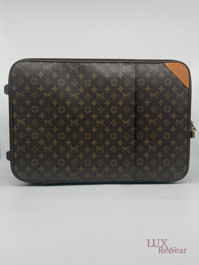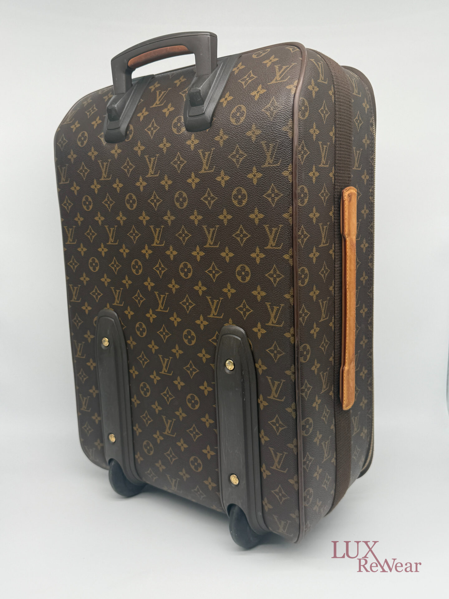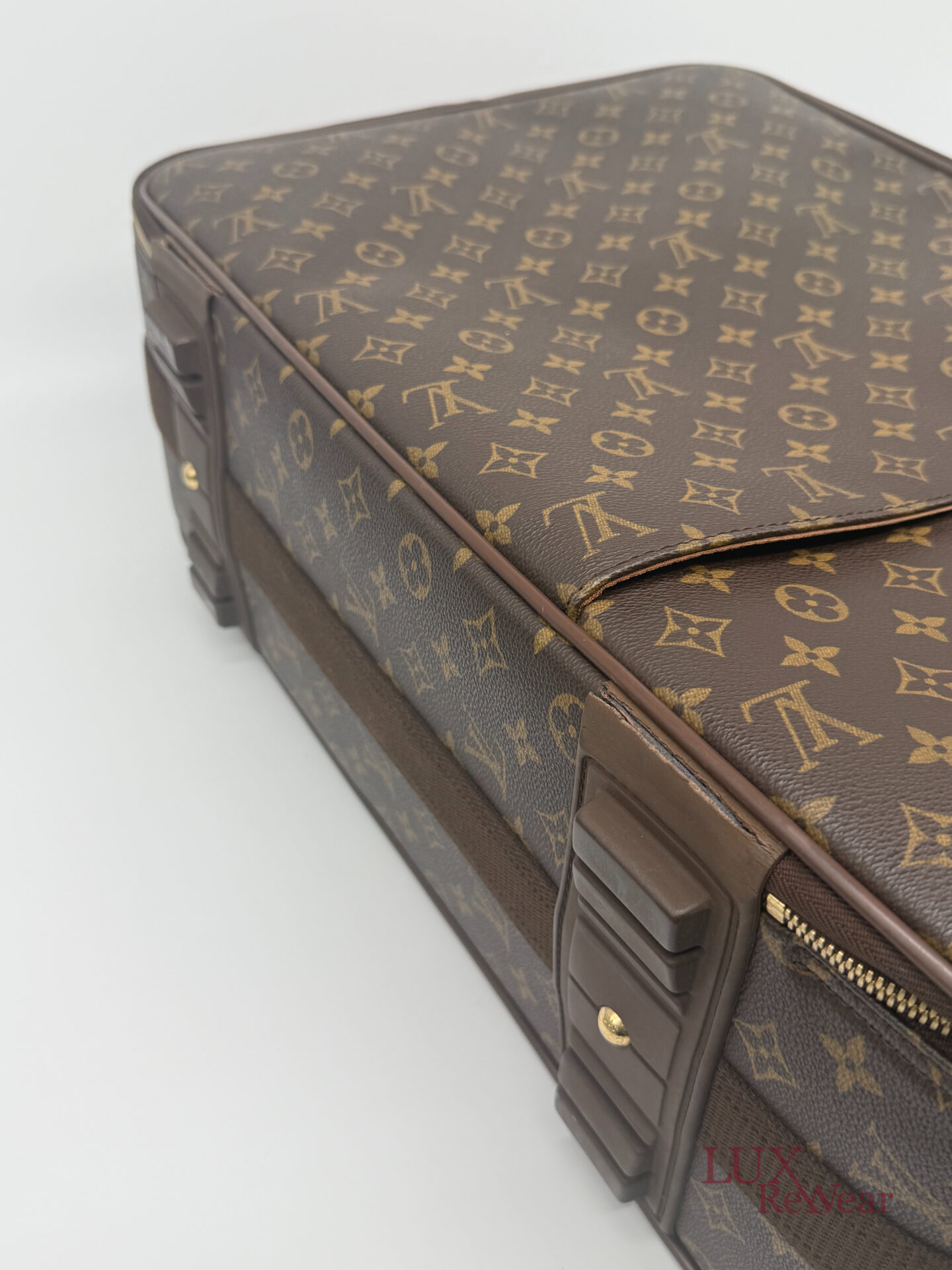 Experience style and functionality with the Louis Vuitton Pegase 55. This hardcase suitcase in classic LV Monogram canvas with leather accents is lightweight and perfect for short trips or longer journeys. Smooth wheels and a telescopic handle make airport navigation effortless, while the suitcase features handy compartments and elastic straps to keep your essentials organized and secure.