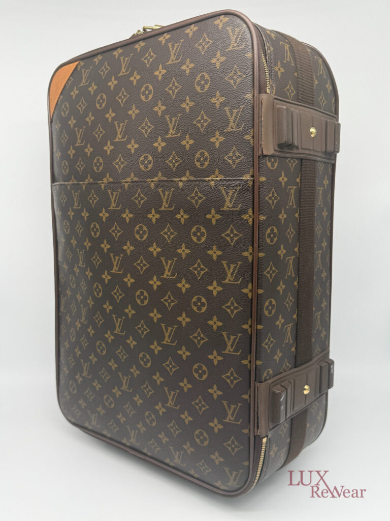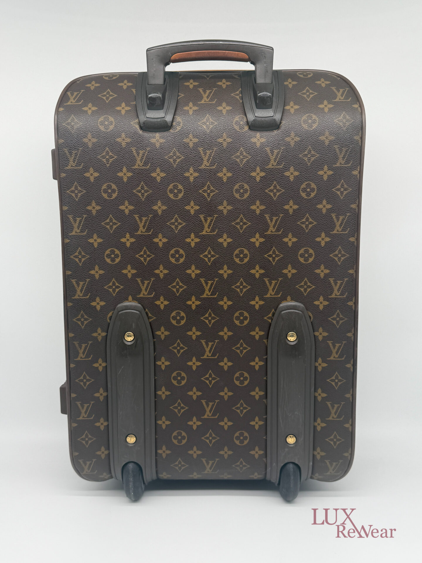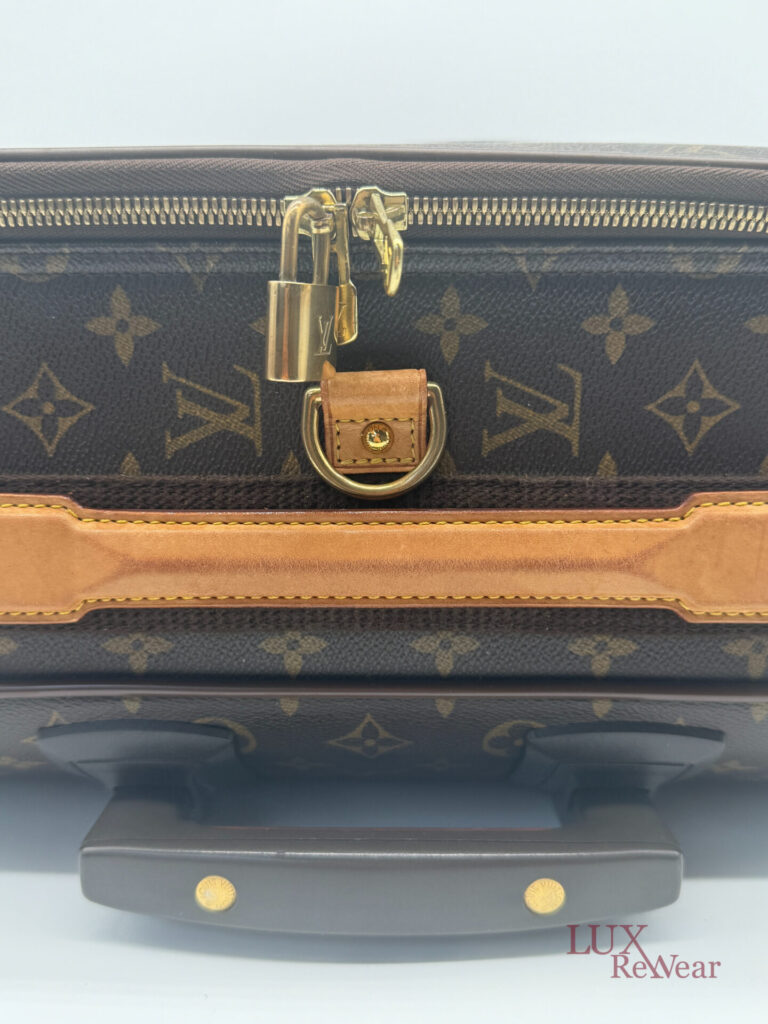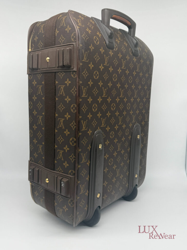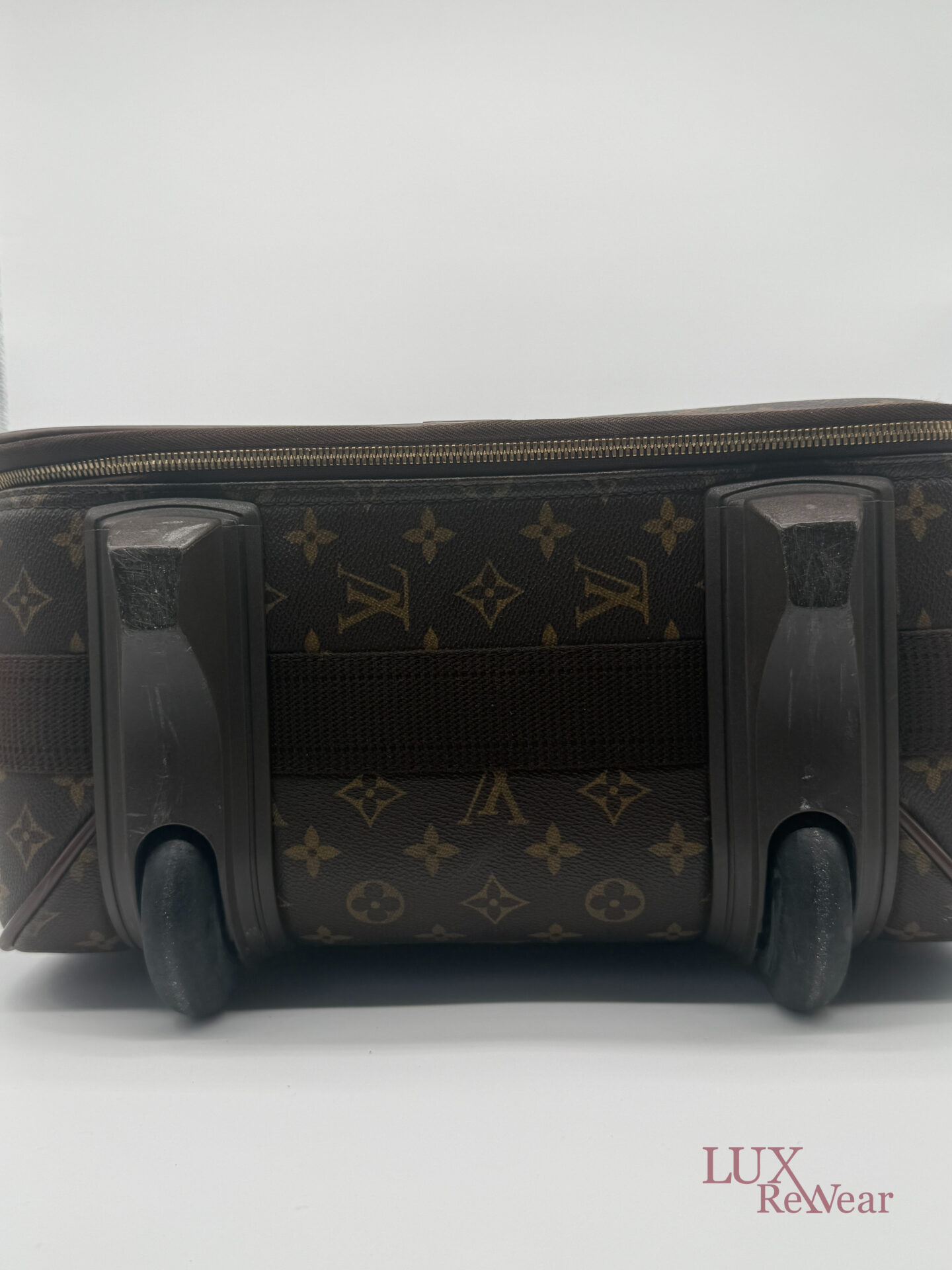 Experience style and functionality with the Louis Vuitton Pegase 55. This hardcase suitcase in classic LV Monogram canvas with leather accents is lightweight and perfect for short trips or longer journeys. Smooth wheels and a telescopic handle make airport navigation effortless, while the suitcase features handy compartments and elastic straps to keep your essentials organized and secure.