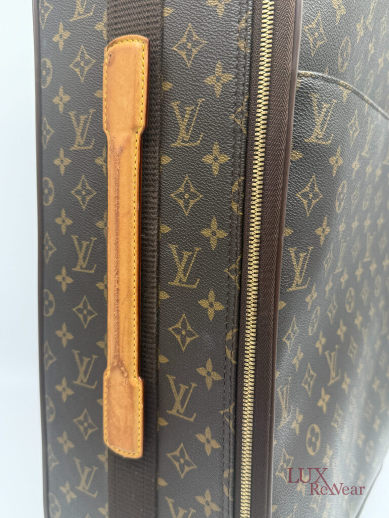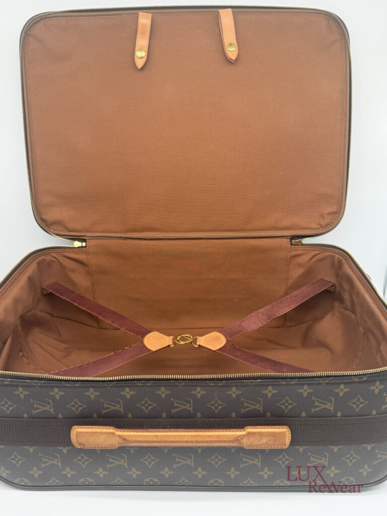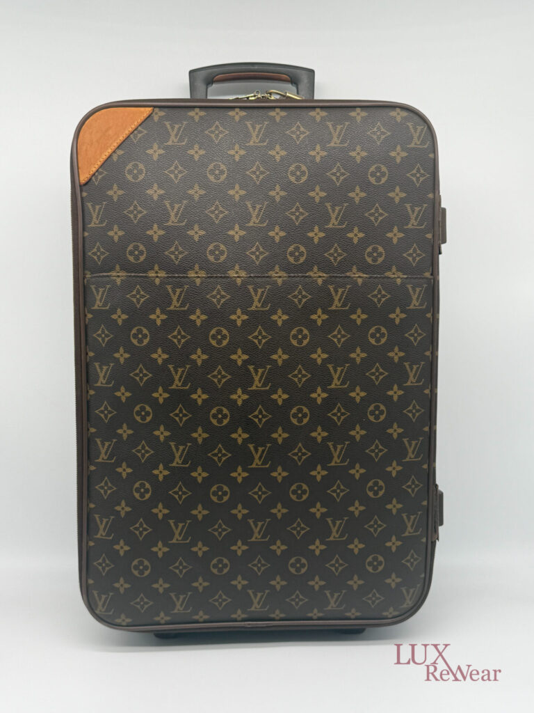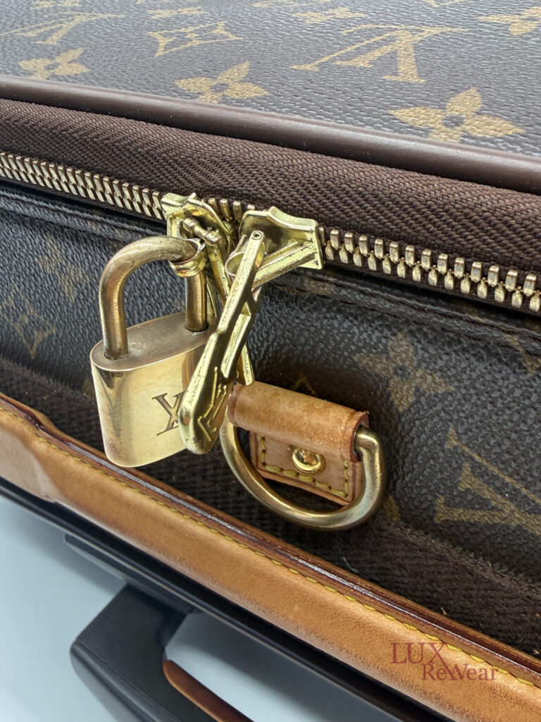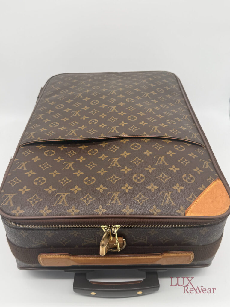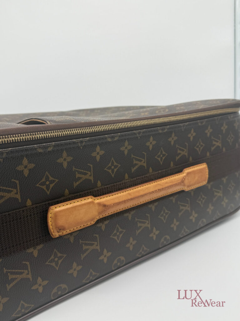 Experience style and functionality with the Louis Vuitton Pegase 55. This hardcase suitcase in classic LV Monogram canvas with leather accents is lightweight and perfect for short trips or longer journeys. Smooth wheels and a telescopic handle make airport navigation effortless, while the suitcase features handy compartments and elastic straps to keep your essentials organized and secure.