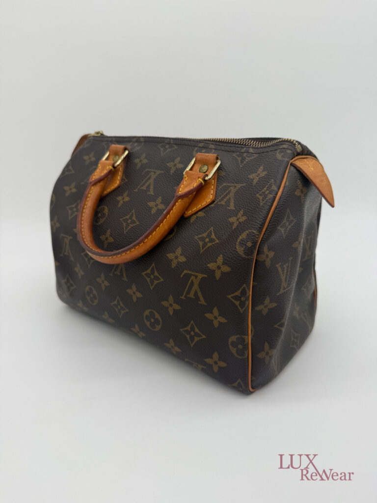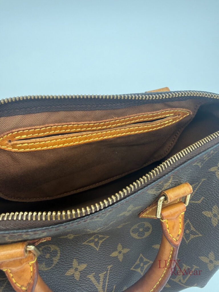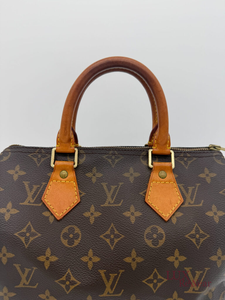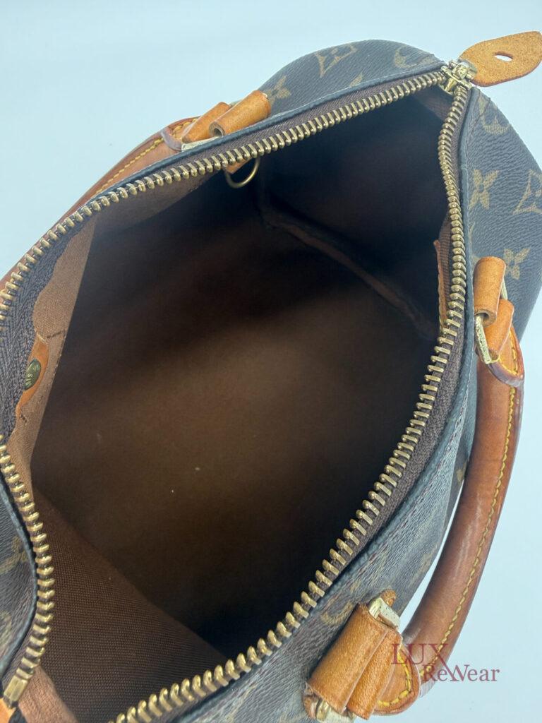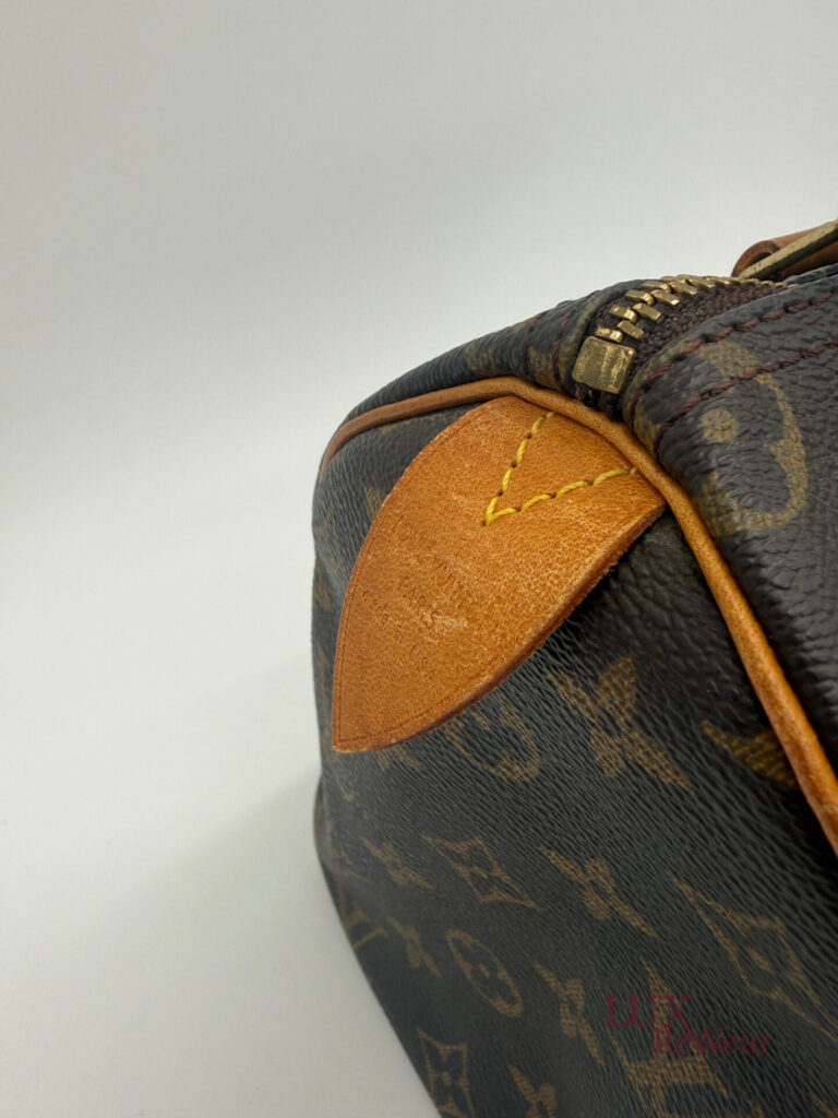This vintage Louis Vuitton Speedy 25 is made in July 1999 in the U.S.A. (data code SD0979). The bag is made from canvas with the monogram print with the vachetta leather details and leather trims. This bag has one big compartiment and a slip-in pocket.